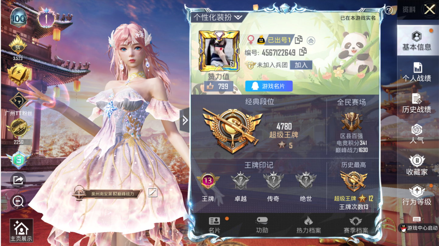 PX_1960237-可二次,等级61,117套装,201枪皮,13王牌印记,历史12星,热力值63564,1红3粉5特效,1级梦海之灵妮芮妲,巡查衣,满级满配M4心之恋语,满级满配AK绿萝繁花,满级满配SCARL锦绣绵绵,满级满配UMP45量子极限,满级满配98K巳巳如意,蜜语绒猫,未来歌姬,冷魅冰骑,Mark.06蓝螳螂,2B战斗服,暗影哥特,迅捷狂鲨,白光莹,冰公主,蜜桃派对,电音精灵,天籁歌者