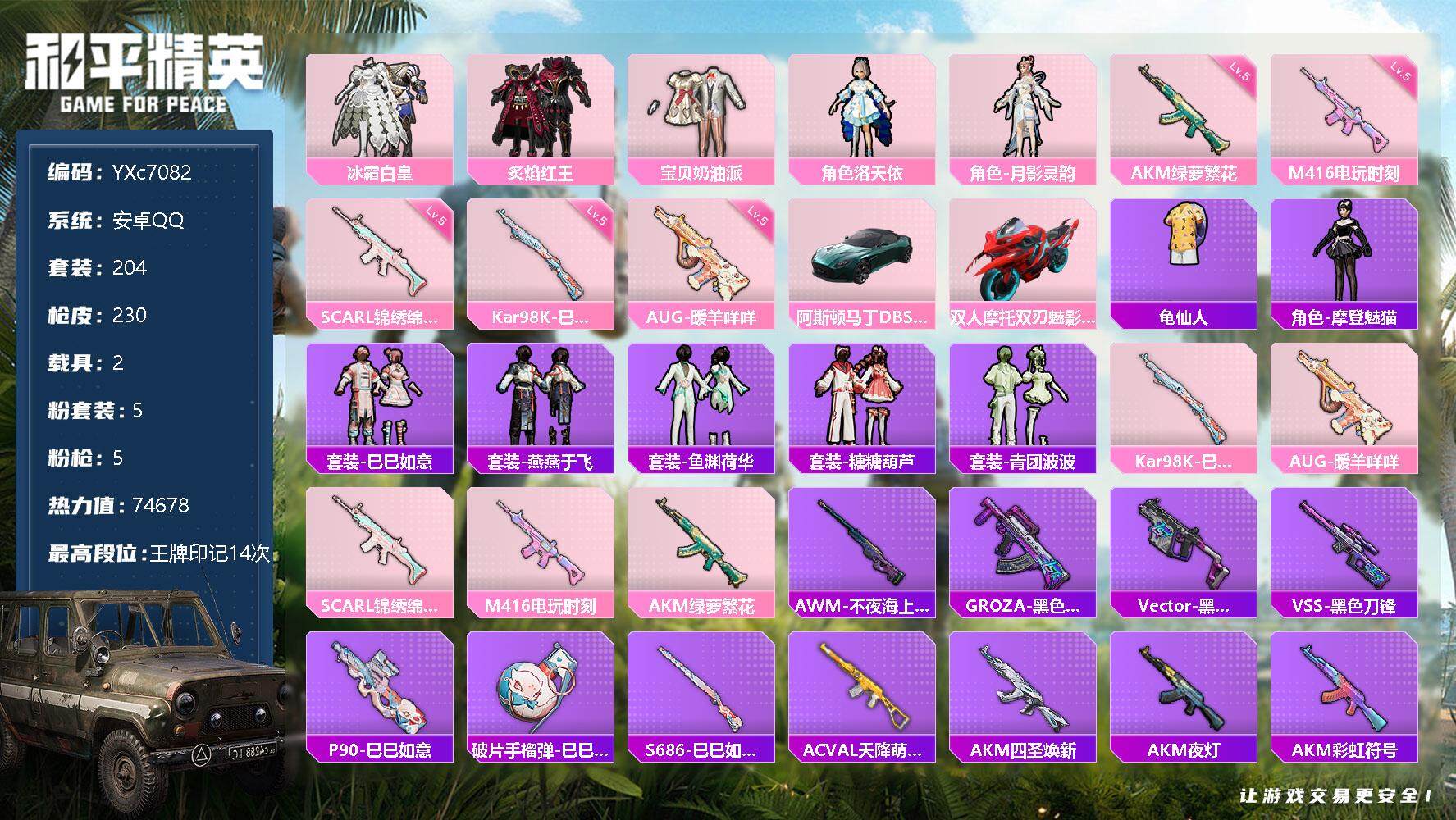 PX_2288281-??二次-安卓V-211222热力值,23王牌印记,历史超级王牌11星,【超多粉装衣柜妹妹号,雪国幻梦,三姐妹,梦幻火箭,不知火舞,智能音符,猪妹,发光眼罩,洛天依,草莓生巧,俏皮狐尾,童趣迷兔,馨动时刻,林间仙鹿,山涧鹿灵,彩虹鹿灵,花影阑珊,俏雪含霜,奇迹天团,红眼罩等等】364套装,363枪皮,【12载具】,路特斯EL紫色,(1级),兰博轿车灰色,兰博SVJ绿色,阿斯顿马丁S绿色,特斯拉R水滴蓝,合金龙骨蓝色,萌喵橘座,特斯拉3银色,双人摩托梦幻火箭,塞莎霓虹粉,(1级),鬼马风驰,萌兔起飞僚机,【3稀有】,奇异狩猎者,AKM-缤纷海域,浪漫天命,【73粉装】,黄螳螂,梦幻火箭,蝶舞迷情,雪国幻梦,狂花道·不知火舞,天启纪元,宝贝奶油派,天使彩虹糖,甜心巧克力,洛天依,金风玉露,深海曼妙,深渊皇后,金属狂野,酣梦娃娃,精灵娃娃,静灵氛围,智能音符,缤纷油彩,放客神游,PEL轰鸣竞梦者,星之信仰,精灵迷巫,幻梦音符,绚丽摇曳,华贵君王,麻辣鲜香锅,狩月元帅,琉璃脉冲,新星烈龙,向日葵,心之恋语,极致幻想,星空之魅,扶摇飞仙,锦绣火鲤,铁甲悍将,迷蝶贵族,草莓生巧,诡面斩,俏皮狐尾,香水柠檬,苍蓝魅影,翡翠骑士,绚金战神,童趣迷兔,冰霜白皇,炙焰红王,霞光圣骑,暗翼战神,银刃赛罗,星之彼岸,馨动时刻,炙焰赤龙,飓风飞鹰,蜜桃特工,甜心娃娃,焦糖拿铁,流星咚咚,葫芦兄弟,铁血龙王,银龙傲海,暗夜玫瑰,林间仙鹿,山涧鹿灵,彩虹鹿灵,花影阑珊,俏雪含霜,吟月归客,寒光使者,黄伞悠悠,黑伞漫漫,蓝莓炮弹,【24特效枪】,SCAR-L-梦幻火箭,(6级),M416-五爪金龙,(1级),M416-心之恋语,(4级),AKM-甜心宝贝,(7级),M24-星之信仰,(5级),AKM-炫紫旋律,(3级),Mini14-龙虾霸霸,(4级),Kar98K-巳巳如意,(3级),M762-甜蜜誓约,(6级),AWM-花间之火,(4级),Mini14-荧光虫舞,(7级),GROZA-香水柠檬,(7级),M762-激战未来,(3级),SCAR-L-童趣迷兔,(1级),AUG-星之彼岸,(7级),UMP45-相思残雪,(4级),汤姆逊-怪笑疯兔,(4级),M16A4-葫芦兄弟,(3级),SLR-暗夜玫瑰,(2级),M416-风花雪月,(7级),MG3-洛神天依,(4级),Vect