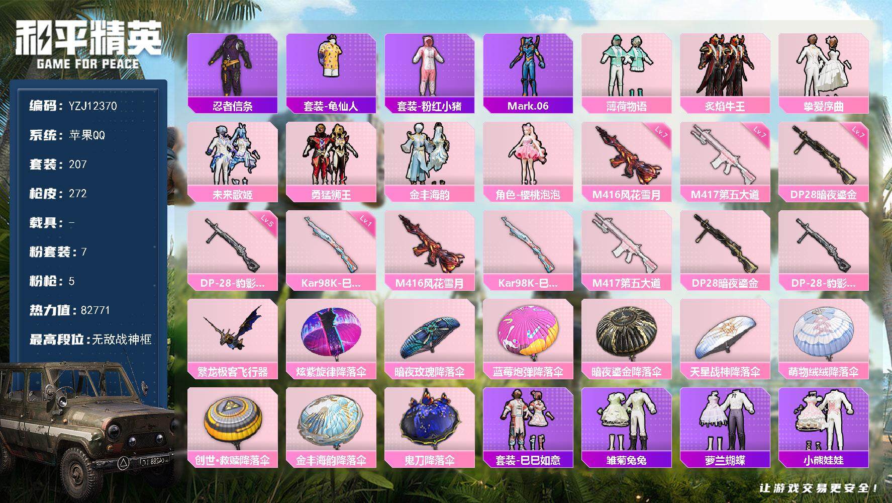 PX_2305251-可二次,苹果Q-7粉装5特效枪13热门207套装272枪皮,82771热力值,精品女战神号,173荣耀勋章,SS30战神框,樱桃泡泡,金丰海韵,未来歌姬,薄荷物语,好奇恐龙,冰公主,满级M4风花雪月,满级M417第五大道,满级DP28暗夜鎏金,17印记,历史无敌战神,【7粉装】,金丰海韵,樱桃泡泡,未来歌姬,勇猛狮王,挚爱序曲,炙焰牛王,薄荷物语,【5特效枪】,Kar98K-巳巳如意,(1级),DP-28-豹影疾电,(5级),M417-第五大道,(7级),DP-28-暗夜鎏金,(7级),M416-风花雪月,(7级),【13热门】,Mark.06,龟仙人,雪山精英,东方飞龙,呆萌铁蟹,好奇恐龙,诡面顽熊,团圆交子,瑞龙福将,粉红小猪,忍者信条,极速红龙,M762-瑞龙福将,【1飞行器】,繁龙极客飞行器,【1背包】,水曜玄武背包,营地ID:712407532