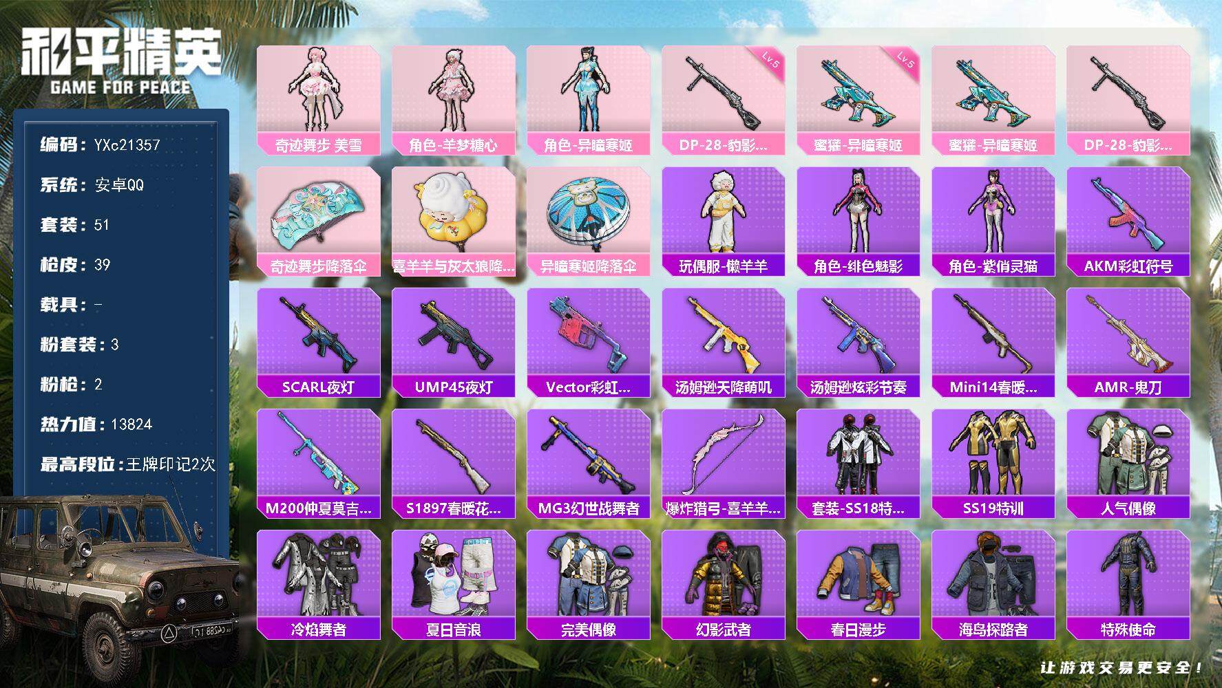 PX_2288140-??二次-苹果Q-60537热力值,13王牌印记4卓越2传奇1绝世,历史无敌战神,战神框,身法号,紫螳螂,雪国,梦幻火箭,木乃伊,赤蝎,都市,天命,身法鲨鱼裤,红眼罩,满级五爪,小白龙,123套装,162枪皮,【3载具】,路特斯EL灰色,兰博轿车灰色,焰龙咆哮,【5稀有】,木乃伊,奇异狩猎者,赤蝎幽灵,都市猎人,浪漫天命,【8粉装】,紫螳螂,梦幻火箭,雪国幻梦,垂柳戏鸭,智能音符,新星烈龙,旋转彩虹,海盐物语,【6特效枪】,M416-五爪金龙,(7级),SCAR-L-纯梦嫁纱,(6级),Kar98K-巳巳如意,(5级),AKM-梦之光华,(7级),UMP45-玉魂晶魄,(7级),Vector-环太平洋,(5级),【3飞行器】,伏魔团飞行器,黄族统领飞行器,仙剑飞行器,【17热门】,龟仙人,雪山精英,鹰眼刺客,迅捷狂鲨,大橘为重,暗影哥特,赛罗奥特曼,团圆交子,瑞龙福将,豚鼠丹丹,漫步者,军刀雅典娜,英勇保护者,M762-奇异狩猎者,M762-瑞龙福将,M24-奇异狩猎者,S686-奇异狩猎者,【3头盔】,雪国精灵头盔,百万伏特头盔,深海小丑鱼头盔,【3背包】,梦幻火箭背包,雪国精灵背包,深海小丑鱼背包,营地ID:763778426