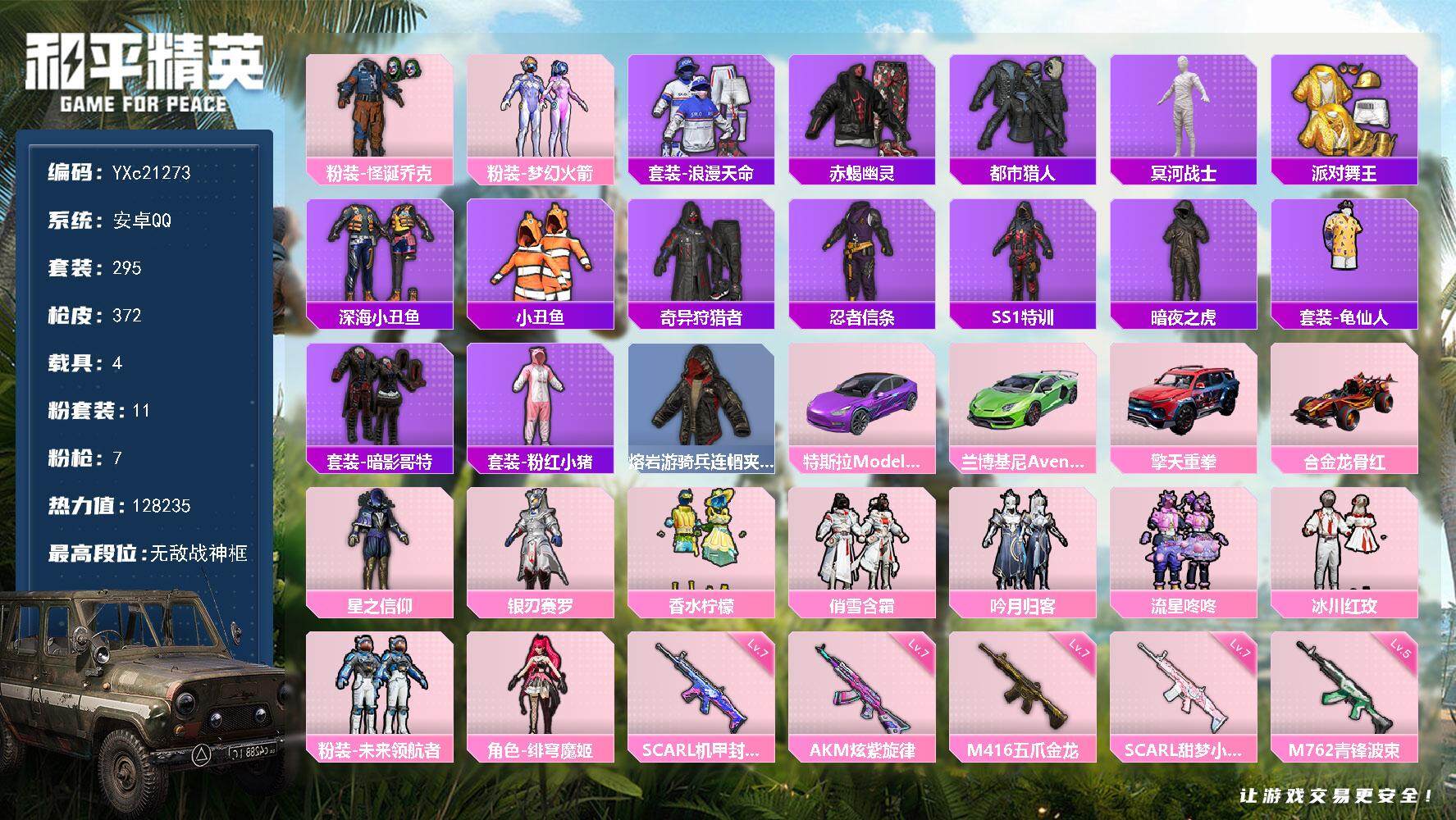 PX_2305737-2-【无二次协助处理】【因赛季更新游戏段付以上号为准!】 ,安卓Q-3载具4粉装4特效枪15热门165套装232枪皮,,9印记,历史超级王牌5星, 【3载具】,玛莎拉蒂粉色,兰博轿车灰色,双人摩托梦幻火箭, 【4粉装】,绯穹魔姬,洛天依,挚爱序曲,音爆索尼克, 【4特效枪】,M416-电玩时刻,(5级),Kar98K-巳巳如意,(5级),DP-28-豹影疾电,(5级),MG3-洛神天依,(7级), 【15热门】,龟仙人,青涩年华,醒狮腾龙,团圆交子,瑞龙福将,粉红小猪,爱神,破蛋小黄鸡,极速红龙,军刀雅典娜,英勇保护者,AKM-奇异狩猎者,M762-瑞龙福将,M24-奇异狩猎者,S686-奇异狩猎者, 【1头盔】,梦幻火箭头盔,