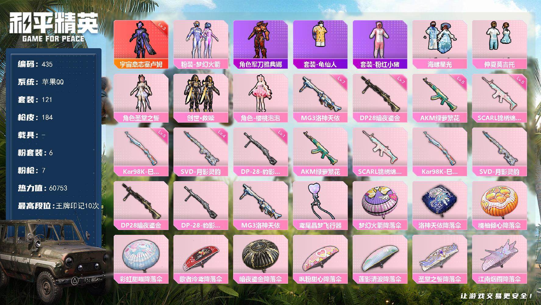 PX_2305650-可二次-苹果,手Q-1神装-6粉装-7特效枪-0载具-1粉色飞行器-60753热力值-10王牌印记-121套装-184枪皮 【红色神装等级】:宇宙意志-塞卢姆(三级) 【红色角色神装】:宇宙意志-塞卢姆 【热门品类】:粉装-梦幻火箭,角色-军刀雅典娜,套装-龟仙人,套装-粉红小猪 【粉色套装】:粉装-梦幻火箭,粉装-海螺星光,粉装-仲夏莫吉托,角色-圣堂之誓,套装-创世·救赎,角色-樱桃泡泡 【粉色枪皮等级】:AKM-绿萝繁花(五级),SCAR-L-锦绣绵绵(五级),Kar98K-巳巳如意(五级),SVD-月影灵韵(四级),DP-28-暗夜鎏金(七级),DP-28-豹影疾电(一级),MG3-洛神天依(七级) 【粉色枪皮】:AKM-绿萝繁花,SCAR-L-锦绣绵绵,Kar98K-巳巳如意,SVD-月影灵韵,DP-28-暗夜鎏金,DP-28-豹影疾电,MG3-洛神天依 【粉色飞行器】:鸢尾晶梦飞行器 【粉色降落伞】:梦幻火箭降落伞,洛神天依降落伞,橘柚倾心降落伞,彩虹甜喵降落伞,歌者泠鸢降落伞,暗夜鎏金降落伞,飒粉甜心降落伞,莲影清波降落伞,圣堂之誓降落伞,江南烟雨降落伞,鸢尾晶梦降落伞,守护天翼降落伞,千金淑猫降落伞,盛世惊鸿降落伞,赛博古神降落伞 【稀有套装】:套装-龟仙人,套装-巳巳如意,套装-糖糖葫芦,套装-青团波波,套装-棉花软糖,角色-摩登魅猫,套装-燕燕于飞,套装-鱼渊荷华 【稀有枪皮】:AKM-墨染幽兰,AKM-彩虹符号,AKM-江南烟雨,AKM-生命誓言,AKM-破晓战魂,AKM-霓虹街区,AKM-龙的传人,M16A4-幻世战舞者,M16A4-千金淑猫,SCAR-L-夜灯,SCAR-L-炫彩节奏,SCAR-L-玉兔迎春,SCAR-L-红色方程式,M416-糯团青竹,M416-蓝色火焰,GROZA-恐龙拽拽,GROZA-懵萌河马,GROZA-田园牧歌,AUG-天降萌叽,AUG-海螺星光,AUG-耀粉歌者,QBZ-洛神天依,M762-天降萌叽,M762-彩虹符号,M762-暗夜鎏金,M762-橘柚倾心,Mk47-妙红点点,Mk47-洛神天依,G36C-懵萌河马,AC-VAL-天降萌叽,AC-VAL-快闪甜心,蜜獾-天降萌叽,蜜獾-娇憨猪猪,Famas-镜域双华,UZI-啾咪啾咪,UZI-天降萌叽,UZI-娇憨猪猪,UZI-红色方程式,UMP4