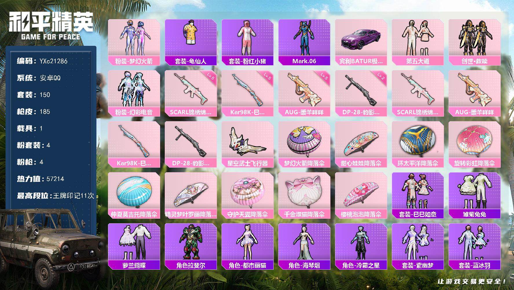 PX_2305708-??满天赋,蓝螳螂,新101】YXc21286-【可二次】【因赛季更新游戏段付以上号为准!】 安卓Q-1载具4粉装4特效枪7热门150套装185枪皮,11印记,历史超级王牌10星, 【1载具】,宾利BATUR(极速紫), 【4粉装】,梦幻火箭,创世救赎,幻彩电音,第五大道, 【4特效枪】,SCAR-L-锦绣绵绵,(5级),Kar98K-巳巳如意,(5级),DP-28-豹影疾电,(2级),AUG-暖羊咩咩,(5级), 【7热门】,Mark.06,龟仙人,鹰眼刺客,暗夜契约,粉红小猪,破蛋小黄鸡,极速红龙, 【2头盔】,梦幻火箭头盔,深海小丑鱼头盔
