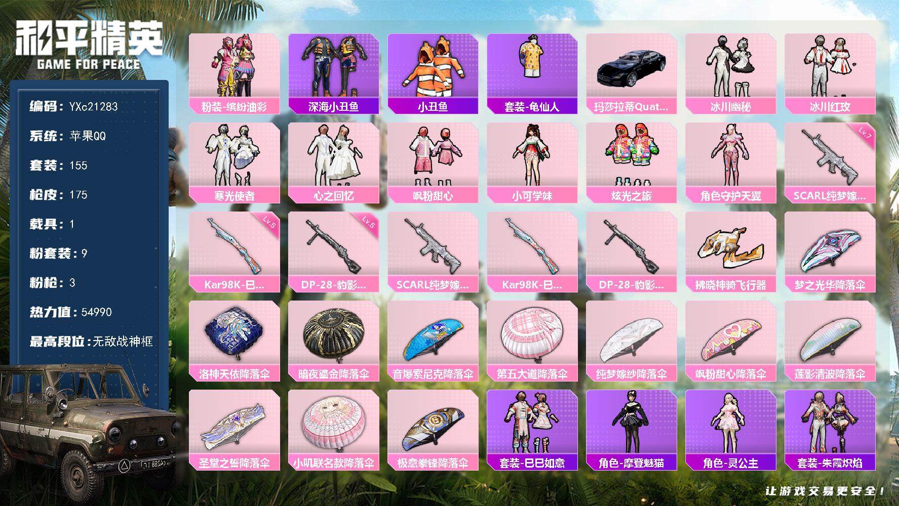 PX_2305712-??转区】【战神框,猪妹,猫鞋,地铁满天赋】YXc21283-【可二次】【因赛季更新游戏段付以上号为准!】 苹果Q-1载具9粉装3特效枪11热门155套装175枪皮,12印记,历史无敌战神, 【1载具】,玛莎拉蒂Q蓝色, 【9粉装】,炫光之旅,守护天翼,飒粉甜心,小可学妹,缤纷油彩,心之回忆,冰川幽秘,冰川红玫,寒光使者, 【3特效枪】,SCAR-L-纯梦嫁纱,(7级),Kar98K-巳巳如意,(5级),DP-28-豹影疾电,(5级), 【11热门】,小丑鱼,龟仙人,呆萌铁蟹,鹰眼刺客,激萌罗小黑,深海小丑鱼,漫步者,破蛋小黄鸡,极速红龙,Kar98K-深海曼妙,GROZA-林间仙鹿, 【1飞行器】,拂晓神骑飞行器, 【1背包】,深海小丑鱼背包