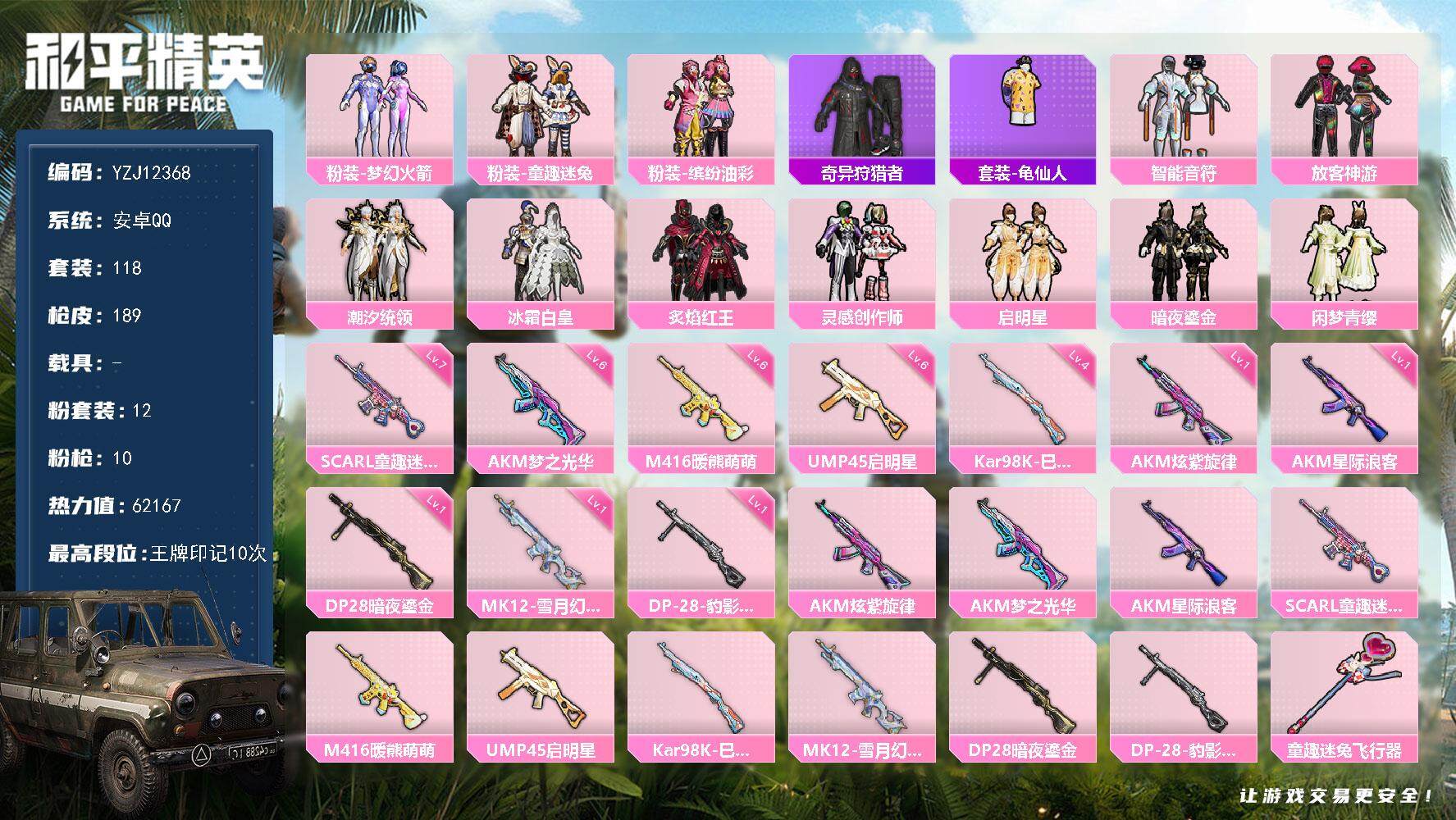 PX_2305209-可二次,安卓Q-1稀有12粉装10特效枪11热门118套装189枪皮,62167热力值,精品女号,火箭少女,猪妹,童趣迷兔,智能音符,LED发光眼罩,灵感创作师,启明星,闲梦青缨,冰霜白皇,奇异狩猎者,满级斯嘎童趣迷兔,6级M4暖熊萌萌,6级AK梦之光华,6级UMP45启明星,10印记,历史超级王牌13星,【1稀有】,奇异狩猎者,【12粉装】,梦幻火箭,闲梦青缨,智能音符,缤纷油彩,放客神游,启明星,潮汐统领,灵感创作师,暗夜鎏金,童趣迷兔,冰霜白皇,炙焰红王,【10特效枪】,AKM-炫紫旋律,(1级),Kar98K-巳巳如意,(4级),DP-28-豹影疾电,(1级),MK12-雪月幻音,(1级),AKM-星际浪客,(1级),SCAR-L-童趣迷兔,(7级),M416-暖熊萌萌,(6级),AKM-梦之光华,(6级),UMP45-启明星,(6级),DP-28-暗夜鎏金,(1级),【11热门】,龟仙人,团圆交子,瑞龙福将,豚鼠丹丹,冰爽海盐,青龙圣者,海洋之心,黑色刀锋,M762-奇异狩猎者,M762-瑞龙福将,M24-奇异狩猎者,【1飞行器】,童趣迷兔飞行器,【1头盔】,梦幻火箭头盔,【3背包】,九霄背包,梦幻火箭背包,金风玉露背包,营地ID:704797054