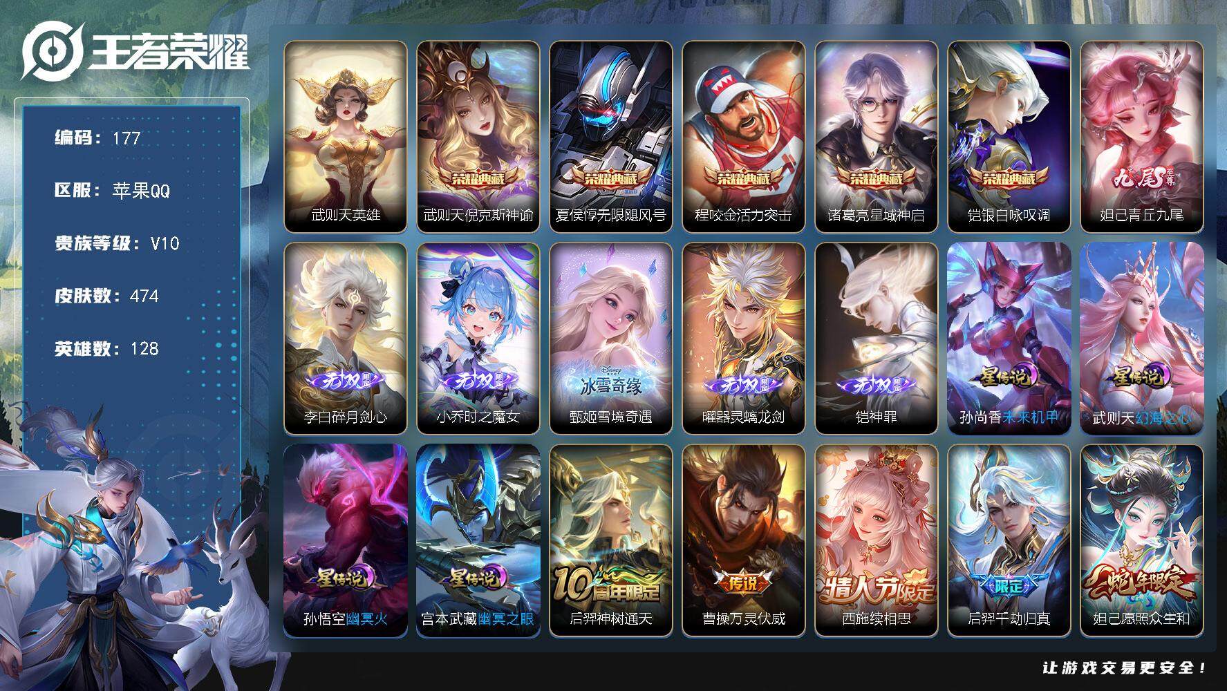 PX_2294925-Q-V10-最强王者段位-128英雄-474皮肤-5典藏-6无双-47传说-148史诗 【英雄全皮】:墨子全皮,扁鹊全皮,达摩全皮,孙权全皮,娜可露露全皮,钟馗全皮,狂铁全皮,猪八戒全皮,蒙恬全皮,盘古全皮,金蝉全皮,戈娅全皮,空空儿全皮 【荣耀典藏】:武则天英雄,武则天倪克斯神谕,夏侯惇无限飓风号,程咬金活力突击,诸葛亮星域神启,铠银白咏叹调 【无双皮肤】:妲己青丘九尾,李白碎月剑心,小乔时之魔女,甄姬雪境奇遇,曜器灵螭龙剑,铠神罪 【传说皮肤】:后羿神树通天,曹操万灵伏威,西施续相思,后羿千劫归真,妲己愿照众生和,蔡文姬愿照福禄聚,虞姬愿照岁时盈,云缨幻光神枪,桑启鸣野蒿,墨子黄金天蝎座,海月金乌负日,亚连落雪白狼,典韦战鼓燎原,孙尚香乘龙问璇玑,孙策乘龙淬吴钩,赵云乘龙铭钟鼎,艾琳觅芳踪,云缨鹤归松栖,百里守约碎云,娜可露露前尘镜,后羿无尽星芒,女娲补天,孙尚香异界灵契,赵云淬星耀世,王昭君乞巧织情,西施游龙清影,曜李逍遥,,周瑜音你心动,小乔音你心动,李元芳飞鸢探春,铠绛天战甲,虞姬启明星使,孙悟空零号赤焰,曜云鹰飞将,李信一念神魔,刘备时之恋人,张良黄金白羊座,干将莫邪久胜战神,达摩黄金狮子座,花木兰冠军飞将,梦奇胖达荣荣,孙尚香末日机甲,宫本武藏地狱之眼,孙悟空地狱火,吕布天魔缭乱,武则天海洋之心,狄仁杰超时空战士 【限定皮肤】:白起狰,蔡文姬夏日便利店,虞姬夏日便利店,姜子牙天穹之誓,狄仁杰阴阳师,小乔纯白花嫁,虞姬凯尔特女王,廉颇寅虎御盾,赵云皇家上将,墨子神迹守卫,墨子降魔,妲己热情桑巴,嬴政白昼王子,孙尚香蔷薇恋人,孙尚香异界灵契,鲁班七号狮舞东方,庄周蜃楼王,庄周高山流水,高渐离玩趣恶龙,钟无艳王者之锤,钟无艳超时空战士,孙膑妖精王,扁鹊炼金王,扁鹊奇幻香踪,白起夜都怪侠,芈月重明,芈月幻夜卜梦,吕布天魔缭乱,吕布猎兽之王,周瑜真爱至上,周瑜赤莲之焰,元歌云间偶戏,元歌无心,夏侯惇朔风刀,夏侯惇匿光决锋者,甄姬女儿国国王,甄姬游园惊梦,甄姬落雪兰心,曹操烛龙,典韦穷奇,典韦蓝屏警告,典韦岱宗,马可波罗暗影游猎,狄仁杰魔术师,狄仁杰万华元夜,达摩星际陆战队,达摩沙漠行僧,项羽海滩派对,项羽霸王别姬,老夫子圣诞老人,老夫子醍醐杖,老夫子航海奇遇记,程咬金演武夺筹,刘邦夺宝奇兵,王昭君凤凰于飞,王昭君午后时光,兰陵王驯魔猎人,兰陵王金庭之子,娜