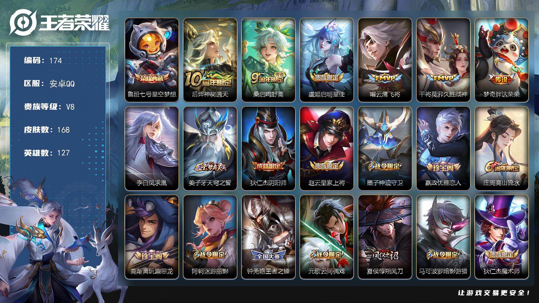 PX_2295091-Q-V8-最强王者段位-打野18段--127英雄-168皮肤-1典藏--7传说-57史诗 【荣耀典藏】:鲁班七号星空梦想 【传说皮肤】:后羿神树通天,桑启鸣野蒿,虞姬启明星使,曜云鹰飞将,干将莫邪久胜战神,梦奇胖达荣荣,李白凤求凰 【限定皮肤】:姜子牙天穹之誓,狄仁杰阴阳师,赵云皇家上将,墨子神迹守卫,嬴政优雅恋人,庄周高山流水,高渐离玩趣恶龙,阿轲迷踪丽影,钟无艳王者之锤,元歌云间偶戏,夏侯惇朔风刀,马可波罗暗影游猎,狄仁杰魔术师,狄仁杰万华元夜,达摩星际陆战队,达摩沙漠行僧,项羽海滩派对,老夫子醍醐杖,老夫子航海奇遇记,程咬金演武夺筹,刘邦夺宝奇兵,韩信逐梦之影,兰陵王金庭之子,亚瑟潮玩骑士王,孙悟空至尊宝,后羿圣弓游侠,李元芳银河之约,李元芳云中旅人,虞姬启明星使,钟馗驱傩正仪,杨玉环遇见飞天,干将莫邪真爱魔法,雅典娜单词大作战,雅典娜黎明之约,鬼谷子原初探秘者,鬼谷子五谷丰年,苏烈千军破阵,百里玄策原初追逐者,百里守约朱雀志,弈星混沌棋,公孙离蜜橘之夏,沈梦溪星空之诺,沈梦溪大漠名商,明世隐疑决卦,裴擒虎李小龙,裴擒虎擒涛扼浪,米莱狄胡桃异想国,云中君纤云弄巧,伽罗天狼溯光者,猪八戒西部大镖客,上官婉儿梁祝,上官婉儿天狼绘梦者,蒙犽狂想玩偶喵,桑启海盐诗旅,鬼谷子天穹祈灯,姬小满妄想食味 【年限皮肤】:百里守约朱雀志,李白凤求凰 【赛季限定】:夏侯惇朔风刀,狄仁杰万华元夜,达摩沙漠行僧,老夫子醍醐杖,程咬金演武夺筹,兰陵王金庭之子,李元芳云中旅人,钟馗驱傩正仪,雅典娜黎明之约,鬼谷子原初探秘者,苏烈千军破阵,百里玄策原初追逐者,弈星混沌棋,沈梦溪大漠名商,明世隐疑决卦,裴擒虎擒涛扼浪,桑启海盐诗旅,鬼谷子天穹祈灯,姜子牙天穹之誓 【战令限定】:墨子神迹守卫,阿轲迷踪丽影,元歌云间偶戏,马可波罗暗影游猎,达摩星际陆战队,老夫子航海奇遇记,刘邦夺宝奇兵,亚瑟潮玩骑士王,后羿圣弓游侠,李元芳银河之约,干将莫邪真爱魔法,雅典娜单词大作战,沈梦溪星空之诺,米莱狄胡桃异想国,猪八戒西部大镖客,蒙犽狂想玩偶喵 【史诗皮肤】:鲁班七号电玩小子,露娜紫霞仙子,钟无艳王者之锤,赵云皇家上将,赵云未来纪元,貂蝉圣诞恋歌,王昭君偶像歌手,狄仁杰魔术师,宫本武藏鬼剑武藏,孙尚香水果甜心,嬴政优雅恋人,妲己魅力维加斯,妲己女仆咖啡,墨子龙骑士,墨子金属风暴,吕布圣诞狂欢,刘禅绅士