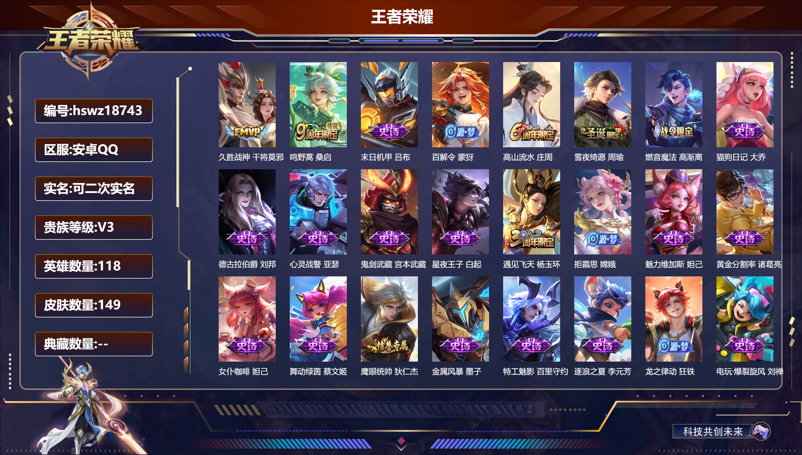 PX_2292219-实名:,可修改,贵族等级:,V7,英雄数:,124,皮肤数:,233,星传说:,未来机甲,传说皮:,云霓雀翎,末日机甲-孙尚香,音你心动-小乔,胖达荣荣,游龙清影,炽翼辉光,记忆之芯,霜月吟,貂蝉曦玄引,朵莉亚心动手记,限定皮:,游园惊梦,五谷丰年,山海·碧波行,至美·乘鲤谣,鸣野蒿