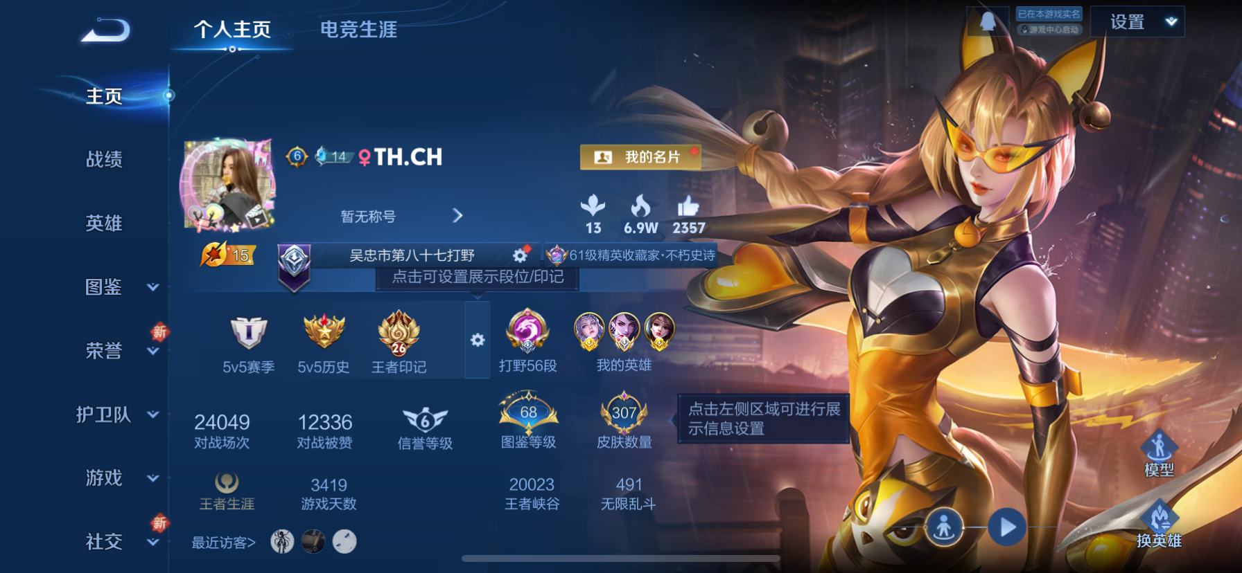 PX_2305528-实名:,可修改,贵族等级:,V6,英雄数:,124,皮肤数:,171,传说皮:,山海·琳琅生,追逃游戏(安琪拉),貂蝉曦玄引,幻光神枪,续相思,限定皮:,魔法小厨娘,山海·碧波行,至美·乘鲤谣,鸣野蒿,愿照·众生和