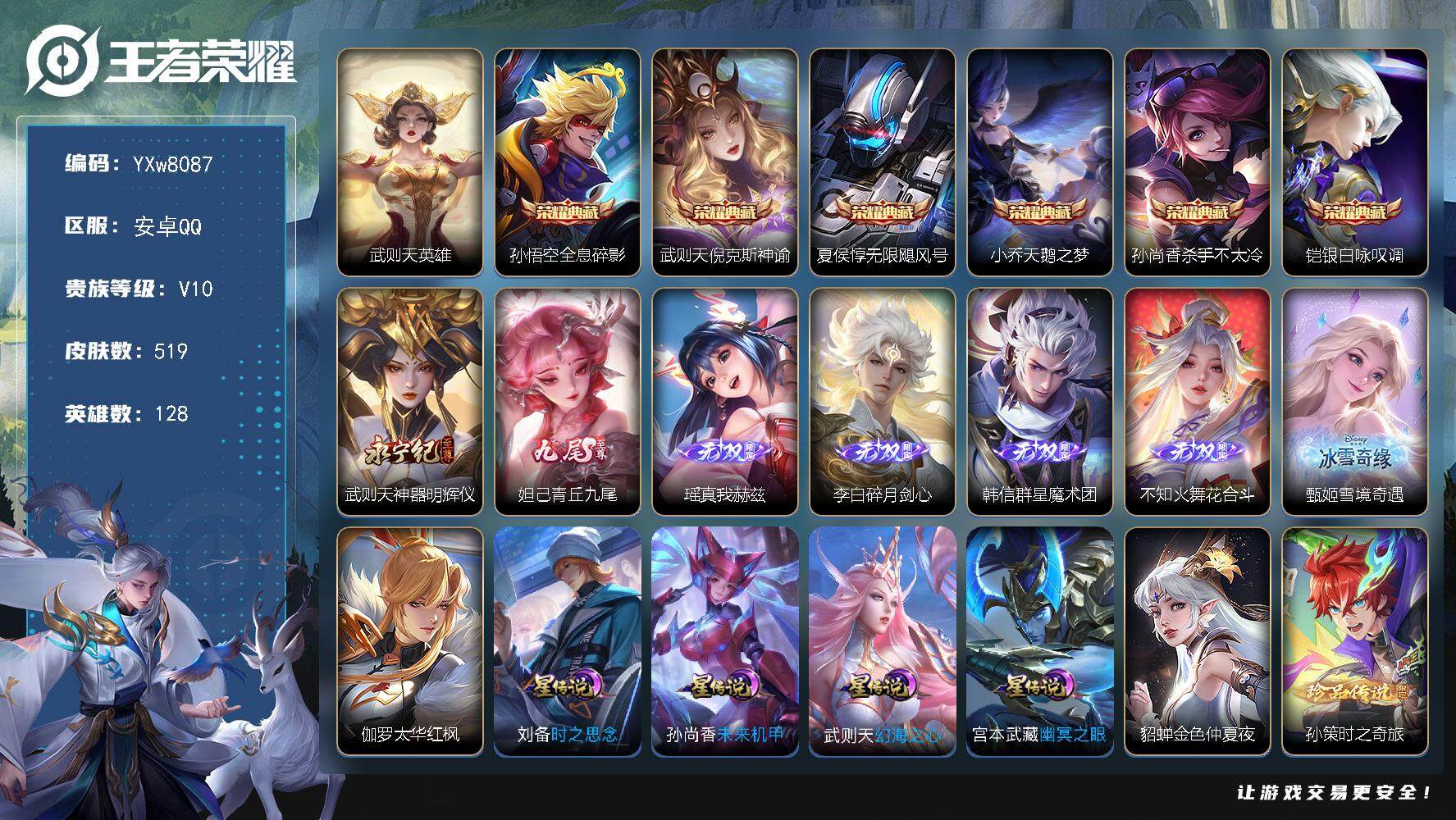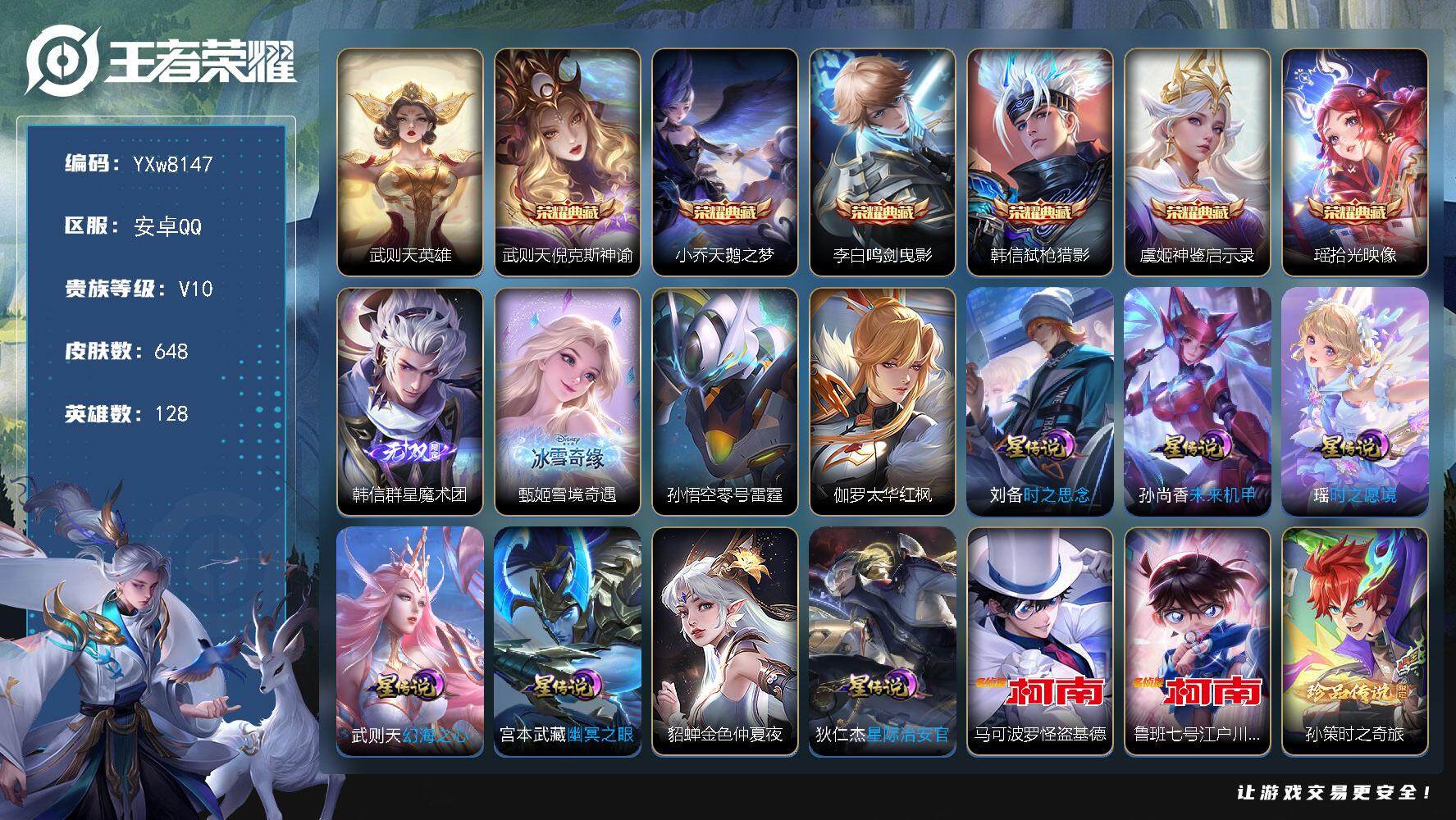 PX_2305514-??质量贵族v10·7典藏·2无双·5珍品·120传说·全皮大乔·全皮西施·全皮甄姬·全皮王昭君·全皮虞姬·全皮露娜·全皮马可波罗·全皮韩信·全皮镜·全皮马超·全皮吕布·全皮百里守约·9星传说·紫瑶·红枫·时之思念·金虎啸春天幕·可二次】YXw8147-安卓Q-128英雄-648皮肤-7王者印记-300铭文-贵族积分36w【贵族10】【7典藏·2无双·5珍品·9星传说·120传说·1天幕·34按键·913个性戳戳】【因赛季更新游戏段付以上号为准!】 【英雄全皮】:墨子全皮,刘禅全皮,阿轲全皮,孙膑全皮,扁鹊全皮,白起全皮,吕布全皮,甄姬全皮,马可波罗全皮,达摩全皮,司马懿全皮,露娜全皮,姜子牙全皮,韩信全皮,孙权全皮,王昭君全皮,艾琳全皮,娜可露露全皮,橘右京全皮,虞姬全皮,钟馗全皮,东皇太一全皮,鬼谷子全皮,大乔全皮,黄忠全皮,百里守约全皮,沈梦溪全皮,云中君全皮,李信全皮,盾山全皮,孙策全皮,猪八戒全皮,马超全皮,海月全皮,西施全皮,蒙犽全皮,鲁班大师全皮,镜全皮,夏洛特全皮,司空震全皮,云缨全皮,金蝉全皮,莱西奥全皮,戈娅全皮,空空儿全皮,影全皮,海诺全皮,少司缘全皮 【荣耀典藏】:武则天英雄,武则天倪克斯神谕,小乔天鹅之梦,李白鸣剑曳影,韩信弑枪猎影,虞姬神鉴启示录,瑶拾光映像 【无双皮肤】:韩信群星魔术团,甄姬雪境奇遇 【珍品传说】:马可波罗怪盗基德,鲁班七号江户川柯南,孙策时之奇旅,瑶大耳狗之梦,安琪拉酷洛米之心 【星元皮肤】:伽罗太华红枫,狄仁杰星际治安官,刘备时之思念,瑶时之愿境,孙悟空零号雷霆,孙尚香未来机甲,武则天幻海之心,宫本武藏幽冥之眼,貂蝉金色仲夏夜 【天幕】:金虎啸春天幕 【传说皮肤】:后羿神树通天,司马懿九山相柳,西施续相思,司空震愿照山河定,女娲愿照千秋盛,妲己愿照众生和,澜愿照九州拓,蔡文姬愿照福禄聚,虞姬愿照岁时盈,云缨幻光神枪,裴擒虎祥瑞亨通,嬴政玄雷天君,王昭君映山客,桑启鸣野蒿,庄周牧神诗旅,夏侯惇霜北刀,铠冥王哈迪斯,朵莉亚心动手记,云中君群星魔术团,墨子黄金天蝎座,海月金乌负日,亚连落雪白狼,吕布曦玄引,貂蝉曦玄引,典韦战鼓燎原,孙尚香乘龙问璇玑,孙策乘龙淬吴钩,赵云乘龙铭钟鼎,马超琥珀纪元,铠琥珀纪元,澜逐花归海,艾琳觅芳踪,露娜霜月吟,孙膑小动物乐团,狄仁杰夜礼服假面,王昭君永恒水手月亮,甄姬至美化雀舞,大乔时之奇旅,鲁班七号时之奇旅,兰陵王影龙天霄,吕布遇见神鼓,宫本武藏惊梅引,云缨鹤归松栖,上官婉儿妄想奇谈,马可波罗妄想实况,东皇太一灼幽烈阳,诸葛亮鹤羽星尊,亚瑟追逃游戏,安琪拉追逃游戏,公孙离记忆之芯,夏洛特浮生妄,干将莫邪画中仙,花木兰燃星之曲,虞姬无限倾心,项羽无限倾心,伽罗炽翼辉光,孙悟空齐天大圣,小乔山海琳琅生,曜山海苍雷引,李信山海炽霜斩,吕布怒海麟威,李白诗剑行,狄仁杰神器狴犴令,不知火舞绯月行,王昭君星穹之声,百里守约碎云,橘右京枫霜尽,娜可露露前尘镜,孙尚香音你闪耀,马可波罗深海之息,后羿无尽星芒,马超无双飞将,大乔挚爱花嫁,孙策挚爱之约,露娜启示之音,蔡文姬花朝如约,女娲补天,孙策末日机甲,瑶时之祈愿,裴擒虎寅虎赤拳,鲁班七号寅虎瑞焰,孙尚香异界灵契,貂蝉遇见胡旋,赵云淬星耀世,王昭君乞巧织情,西施游龙清影,曜李逍遥,,周瑜音你心动,小乔音你心动,李元芳飞鸢探春,兰陵王默契交锋,公孙离祈雪灵祝,诸葛亮时雨天司,铠绛天战甲,镜炽阳神光,虞姬启明星使,孙悟空零号赤焰,关羽武圣,曜云鹰飞将,李信一念神魔,刘备时之恋人,伽罗太华,貂蝉猫影幻舞,张良黄金白羊座,干将莫邪久胜战神,虞姬云霓雀翎,达摩黄金狮子座,百里玄策白虎志,花木兰冠军飞将,梦奇胖达荣荣,后羿黄金射手座,诸葛亮武陵仙君,貂蝉仲夏夜之梦,李白凤求凰,孙尚香末日机甲,宫本武藏地狱之眼,孙悟空地狱火,吕布天魔缭乱,武则天海洋之心,狄仁杰超时空战士 【限定皮肤】:白起狰,夏侯惇霜北刀,铠冥王哈迪斯,暃埋骨钱,蒙犽顽岩魄,蔡文姬夏日便利店,大乔绒语心约,虞姬夏日便利店,姜子牙天穹之誓,杨戬破阵退雄兵,李白谪仙醉月,狄仁杰阴阳师,小乔纯白花嫁,虞姬凯尔特女王,廉颇寅虎御盾,小乔山海琳琅生,赵云皇家上将,赵云引擎之心,赵云龙胆,赵云百木心枪,墨子神迹守卫,墨子降魔,妲己热情桑巴,妲己时之彼端,妲己时之奇旅,孙尚香蔷薇恋人,孙尚香异界灵契,鲁班七号狮舞东方,鲁班七号乒乒小将,鲁班七号寅虎瑞焰,鲁班七号时之奇旅,庄周云端筑梦师,庄周玄嵩,庄周高山流水,阿轲迷踪丽影,钟无艳超时空战士,孙膑妖精王,孙膑天狼运算者,孙膑寅虎展翼,扁鹊炼金王,扁鹊奇幻香踪,白起夜都怪侠,芈月重明,芈月白晶晶,芈月幻夜卜梦,吕布天魔缭乱,吕布猎兽之王,吕布御风骁将,吕布遇见神鼓,周瑜真爱至上,元歌云间偶戏,元歌无心,夏侯惇朔风刀,夏侯惇匿光决锋者,甄姬幽恒,甄姬女儿国国王,甄姬游园惊梦,甄姬落雪兰心,甄姬至美化雀舞,曹操烛龙,曹操天狼征服者,典韦蓝屏警告,典韦岱宗,马可波罗逐梦之星,马可波罗暗影游猎,马可波罗深海之息,马可波罗山海玄木吟,马可波罗妄想实况,狄仁杰魔术师,狄仁杰神器狴犴令,达摩星际陆战队,达摩沙漠行僧,项羽海滩派对,项羽霸王别姬,项羽无限倾心,老夫子醍醐杖,老夫子航海奇遇记,关羽冰锋战神,关羽武圣,貂蝉逐梦之音,貂蝉遇见胡旋,安琪拉魔法小厨娘,安琪拉追逃游戏,程咬金演武夺筹,露娜一生所