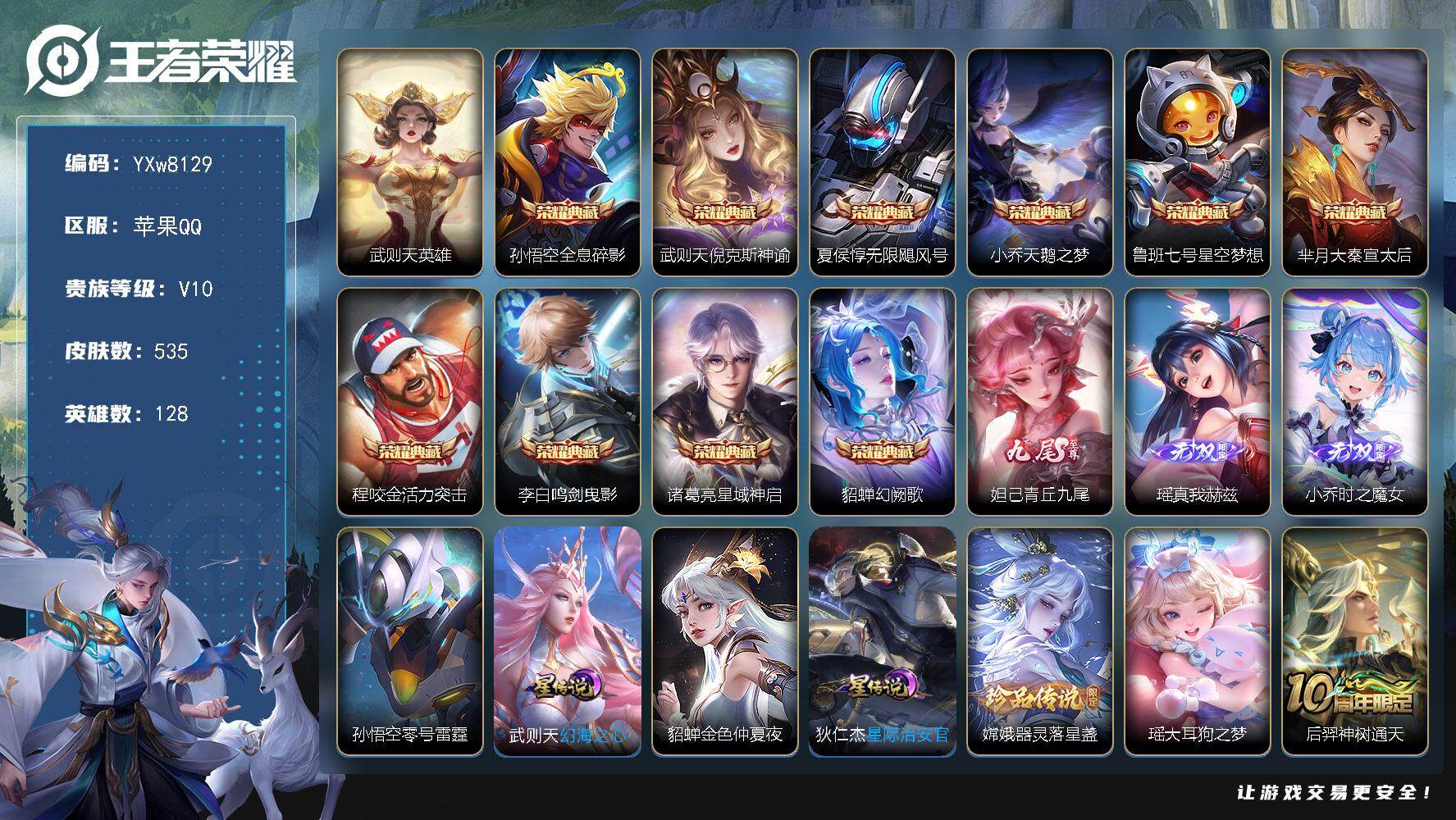 PX_2305522-??贵族v10·连体吃鸡6粉2特效3车·11典藏·3无双·2珍品·74传说·4星传说·路在脚下天幕·挚爱童话天幕·秋月华灯天幕·满虎年限定·满牛年限定·满鼠年限定·可二次】YXw8129-苹果Q-128英雄-535皮肤-23王者印记-300铭文-贵族积分38w【贵族10】【11典藏·3无双·2珍品·4星传说·74传说·5天幕·21按键·134个性戳戳】【因赛季更新游戏段付以上号为准!】 【英雄全皮】:阿轲全皮,达摩全皮,孙权全皮,娜可露露全皮,橘右京全皮,钟馗全皮,鬼谷子全皮,苏烈全皮,狂铁全皮,盾山全皮,猪八戒全皮,鲁班大师全皮,金蝉全皮,赵怀真全皮,莱西奥全皮,戈娅全皮,影全皮 【荣耀典藏】:武则天英雄,孙悟空全息碎影,武则天倪克斯神谕,夏侯惇无限飓风号,小乔天鹅之梦,鲁班七号星空梦想,芈月大秦宣太后,程咬金活力突击,李白鸣剑曳影,诸葛亮星域神启,貂蝉幻阙歌 【无双皮肤】:妲己青丘九尾,瑶真我赫兹,小乔时之魔女 【珍品传说】:嫦娥器灵落星盏,瑶大耳狗之梦 【星元皮肤】:狄仁杰星际治安官,武则天幻海之心,孙悟空零号雷霆,貂蝉金色仲夏夜 【天幕】:路在脚下天幕,挚爱童话天幕,秋月华灯天幕,共赏芳华天幕,鲲天幕 【传说皮肤】:后羿神树通天,澜愿照九州拓,桑启鸣野蒿,艾琳觅芳踪,云缨鹤归松栖,上官婉儿妄想奇谈,马可波罗妄想实况,东皇太一灼幽烈阳,诸葛亮鹤羽星尊,澜电玩雷克斯,亚瑟追逃游戏,安琪拉追逃游戏,公孙离记忆之芯,干将莫邪画中仙,吕布怒海麟威,李白诗剑行,狄仁杰神器狴犴令,不知火舞绯月行,王昭君星穹之声,百里守约碎云,橘右京枫霜尽,娜可露露前尘镜,孙尚香音你闪耀,马可波罗深海之息,后羿无尽星芒,马超无双飞将,大乔挚爱花嫁,孙策挚爱之约,露娜启示之音,蔡文姬花朝如约,女娲补天,孙策末日机甲,瑶时之祈愿,裴擒虎寅虎赤拳,鲁班七号寅虎瑞焰,孙尚香异界灵契,貂蝉遇见胡旋,赵云淬星耀世,王昭君乞巧织情,西施游龙清影,曜李逍遥,,周瑜音你心动,小乔音你心动,李元芳飞鸢探春,兰陵王默契交锋,公孙离祈雪灵祝,诸葛亮时雨天司,铠绛天战甲,镜炽阳神光,虞姬启明星使,孙悟空零号赤焰,关羽武圣,曜云鹰飞将,李信一念神魔,刘备时之恋人,伽罗太华,貂蝉猫影幻舞,张良黄金白羊座,干将莫邪久胜战神,虞姬云霓雀翎,达摩黄金狮子座,百里玄策白虎志,花木兰冠军飞将,梦奇胖达荣荣,后羿黄金射手座,诸葛亮武陵仙君,貂蝉仲夏夜之梦,李白凤求凰,孙尚香末日机甲,宫本武藏地狱之眼,孙悟空地狱火,吕布天魔缭乱,武则天海洋之心,狄仁杰超时空战士 【限定皮肤】:白起狰,姜子牙天穹之誓,狄仁杰阴阳师,虞姬凯尔特女王,廉颇寅虎御盾,赵云皇家上将,赵云引擎之心,赵云龙胆,赵云百木心枪,墨子神迹守卫,妲己热情桑巴,妲己时之彼端,妲己时之奇旅,嬴政白昼王子,孙尚香异界灵契,鲁班七号狮舞东方,鲁班七号乒乒小将,鲁班七号寅虎瑞焰,庄周蜃楼王,庄周云端筑梦师,庄周玄嵩,高渐离死亡摇滚,阿轲迷踪丽影,钟无艳超时空战士,孙膑妖精王,孙膑天狼运算者,孙膑寅虎展翼,扁鹊炼金王,扁鹊奇幻香踪,白起夜都怪侠,芈月重明,芈月白晶晶,芈月幻夜卜梦,吕布天魔缭乱,吕布猎兽之王,吕布御风骁将,周瑜赤莲之焰,元歌云间偶戏,元歌无心,夏侯惇朔风刀,夏侯惇匿光决锋者,甄姬幽恒,甄姬女儿国国王,甄姬落雪兰心,曹操天狼征服者,典韦穷奇,典韦蓝屏警告,典韦岱宗,马可波罗逐梦之星,马可波罗暗影游猎,马可波罗深海之息,马可波罗妄想实况,狄仁杰魔术师,狄仁杰万华元夜,狄仁杰神器狴犴令,达摩星际陆战队,达摩沙漠行僧,项羽海滩派对,项羽霸王别姬,老夫子圣诞老人,老夫子醍醐杖,老夫子航海奇遇记,关羽冰锋战神,关羽武圣,貂蝉遇见胡旋,安琪拉魔法小厨娘,安琪拉追逃游戏,程咬金演武夺筹,露娜一生所爱,露娜启示之音,刘邦夺宝奇兵,韩信逐梦之影,韩信飞衡,韩信傲雪梅枪,王昭君凤凰于飞,王昭君午后时光,王昭君星穹之声,兰陵王默契交锋,兰陵王驯魔猎人,兰陵王金庭之子,花木兰瑞麟志,花木兰默契交锋,不知火舞绯月行,娜可露露前尘镜,橘右京枫霜尽,亚瑟狮心王,亚瑟潮玩骑士王,亚瑟追逃游戏,孙悟空美猴王,孙悟空至尊宝,孙悟空大圣娶亲,孙悟空零号赤焰,孙悟空孙行者,牛魔御旌,牛魔奔雷神使,后羿辉光之辰,后羿如梦令,后羿圣弓游侠,后羿无尽星芒,张飞虎魄,李元芳银河之约,李元芳匿光侦查者,李元芳云中旅人,虞姬霸王别姬,虞姬启明星使,钟馗神迹守卫,钟馗驱傩正仪,杨玉环寅虎心曲,杨戬潮玩骑兵,女娲朔望之晖,女娲补天,干将莫邪冰霜恋舞曲,干将莫邪胡桃夹子,干将莫邪真爱魔法,干将莫邪画中仙,雅典娜单词大作战,雅典娜黎明之约,蔡文姬奇迹圣诞,蔡文姬繁星吟游,太乙真人饕餮,东皇太一逐梦之光,鬼谷子原初探秘者,鬼谷子五谷丰年,诸葛亮武陵仙君,诸葛亮时雨天司,诸葛亮鹤羽星尊,大乔白鹤梁神女,大乔挚爱花嫁,黄忠烈魂,黄忠火炮绅士,铠青龙志,苏烈玄武志,苏烈千军破阵,百里玄策白虎志,百里玄策原初追逐者,百里守约朱雀志,弈星混沌棋,梦奇顽趣,公孙离蜜橘之夏,公孙离祈雪灵祝,公孙离玉兔公主,沈梦溪星空之诺,沈梦溪大漠名商,明世隐疑决卦,明世隐吟游魔法,裴擒虎天狼狩猎者,裴擒虎李小龙,裴擒虎寅虎赤拳,裴擒虎擒涛扼浪,狂铁御狮,狂铁电玩高手,米莱狄御霄,米莱狄胡桃异想国,瑶时之祈愿,云中君纤云弄巧,云中君时之祈愿,伽罗太华,伽罗天狼溯光者,盾山