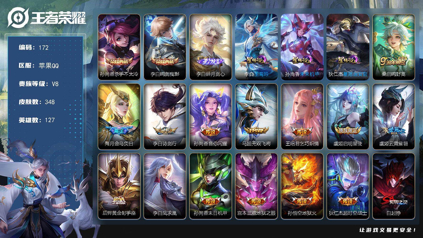 PX_2294929-Q-V8-最强王者段位-127英雄-348皮肤-2典藏-1无双-14传说-99史诗 【英雄全皮】:孙权全皮,海月全皮,蒙恬全皮,海诺全皮 【荣耀典藏】:孙尚香杀手不太冷,李白鸣剑曳影 【无双皮肤】:李白碎月剑心 【传说皮肤】:桑启鸣野蒿,海月金乌负日,李白诗剑行,孙尚香音你闪耀,马超无双飞将,王昭君乞巧织情,虞姬启明星使,虞姬云霓雀翎,后羿黄金射手座,李白凤求凰,孙尚香末日机甲,宫本武藏地狱之眼,孙悟空地狱火,狄仁杰超时空战士 【限定皮肤】:白起狰,姜子牙天穹之誓,杨戬破阵退雄兵,狄仁杰阴阳师,虞姬凯尔特女王,赵云皇家上将,嬴政优雅恋人,嬴政白昼王子,孙尚香蔷薇恋人,鲁班七号狮舞东方,庄周高山流水,阿轲迷踪丽影,钟无艳王者之锤,钟无艳超时空战士,扁鹊炼金王,扁鹊奇幻香踪,芈月重明,芈月幻夜卜梦,吕布猎兽之王,周瑜赤莲之焰,元歌云间偶戏,夏侯惇朔风刀,甄姬游园惊梦,甄姬落雪兰心,曹操烛龙,典韦穷奇,典韦蓝屏警告,马可波罗暗影游猎,狄仁杰魔术师,狄仁杰万华元夜,达摩星际陆战队,达摩沙漠行僧,项羽海滩派对,老夫子醍醐杖,程咬金演武夺筹,刘邦夺宝奇兵,韩信傲雪梅枪,兰陵王驯魔猎人,兰陵王金庭之子,花木兰默契交锋,亚瑟潮玩骑士王,孙悟空大圣娶亲,牛魔御旌,李元芳银河之约,李元芳匿光侦查者,李元芳云中旅人,虞姬启明星使,钟馗神迹守卫,钟馗驱傩正仪,杨玉环遇见飞天,杨戬潮玩骑兵,女娲朔望之晖,雅典娜单词大作战,雅典娜黎明之约,太乙真人饕餮,鬼谷子原初探秘者,鬼谷子五谷丰年,黄忠火炮绅士,苏烈千军破阵,百里玄策原初追逐者,弈星混沌棋,梦奇顽趣,公孙离玉兔公主,沈梦溪星空之诺,沈梦溪大漠名商,明世隐疑决卦,裴擒虎李小龙,裴擒虎擒涛扼浪,狂铁御狮,米莱狄御霄,米莱狄胡桃异想国,云中君纤云弄巧,盾山御銮,猪八戒西部大镖客,上官婉儿梁祝,嫦娥拒霜思,西施玲珑珍味,蒙犽狂想玩偶喵,鲁班大师探海日志,桑启海盐诗旅,戈娅驭风魔法,艾琳女武神,艾琳流音漫舞,司空震地狱燃心,阿古朵江河有灵,张良古海寻踪,蒙犽百解令,蒙恬荣光圣徽,高渐离燃音魔法,妲己灵卜魔法,鬼谷子天穹祈灯,李白碎月剑心,伽罗琥珀纪元,沈梦溪龙舞盛年,鲁班七号蔬乡物语,李元芳蔬乡物语,海月金乌负日,刘邦剑破天穹,程咬金群星魔术团,镜青焰无极,项羽苍威无极,海诺心动手记,刘备异域游侠,周瑜熔金海岸 【年限皮肤】:李白凤求凰 【赛