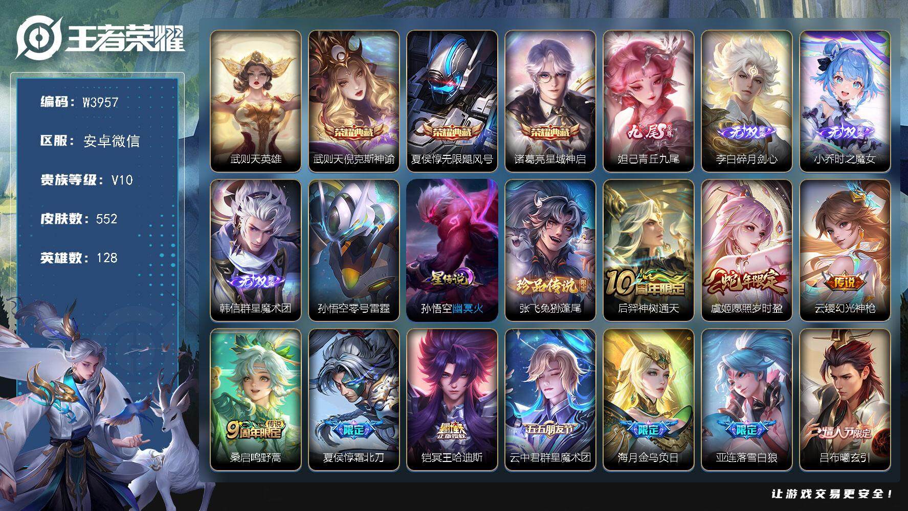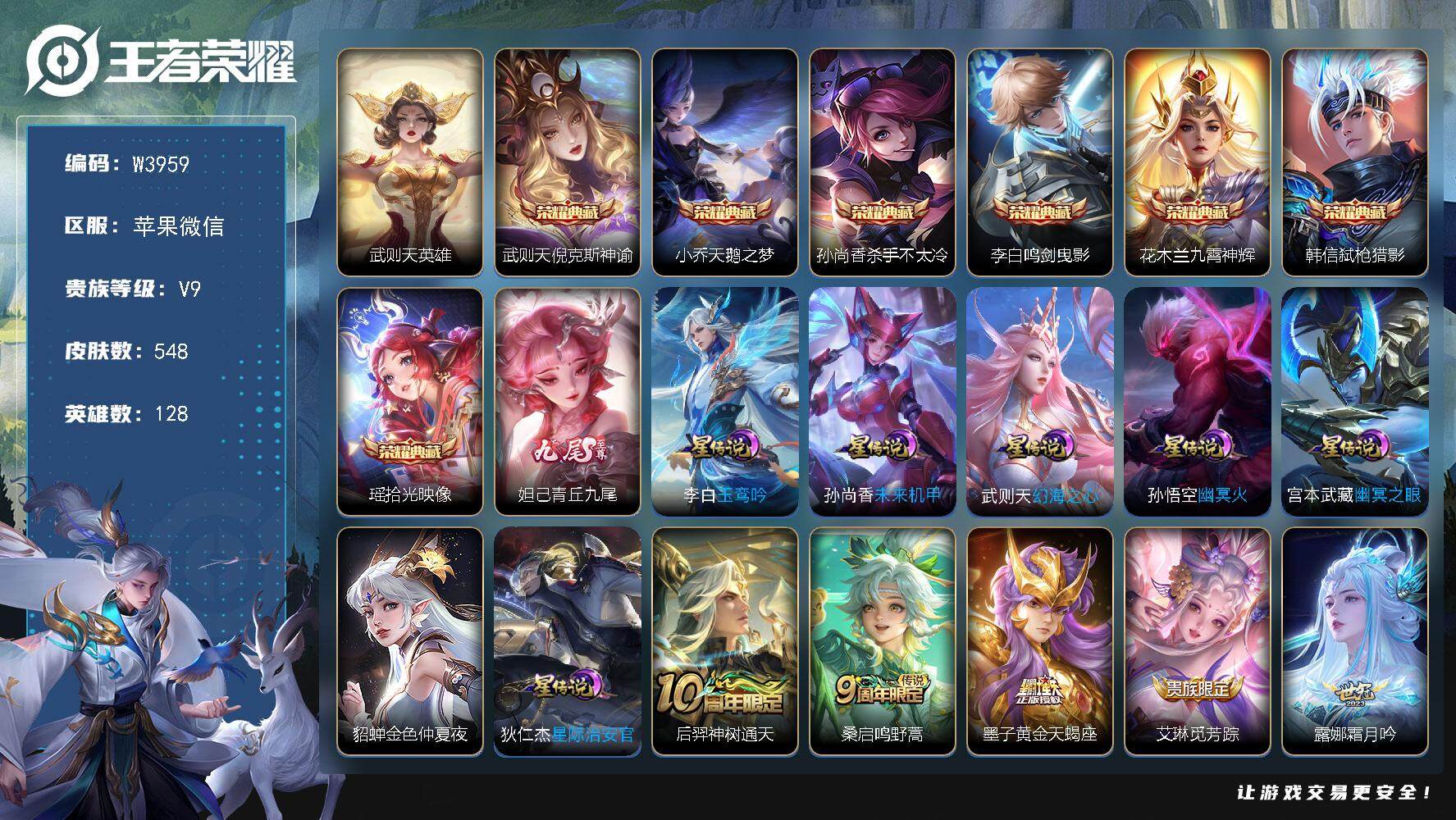 PX_2306759-【W3959】苹果微信-无二次-贵10-128英雄-548皮肤-9典藏(1水晶/武则天)-1无双-63传说-4天幕-7星元-22按键-满铭文-绝版神奇女侠/拾光映像/弑枪猎影/九霄神辉/鸣剑·曳影/倪克斯神谕/天鹅之梦/杀手不太冷/青丘·九尾/霜月吟/鹤羽星尊/浮生妄/无限倾心/枫霜尽/淬星耀世/炽阳神光/白虎志/涂山红红/东方月初/至尊宝-贵族积分30W-营地ID:492412819 【星元皮肤】:孙悟空幽冥火,孙尚香未来机甲,李白玉鸾吟,武则天幻海之心,貂蝉金色仲夏夜,宫本武藏幽冥之眼,狄仁杰星际治安官