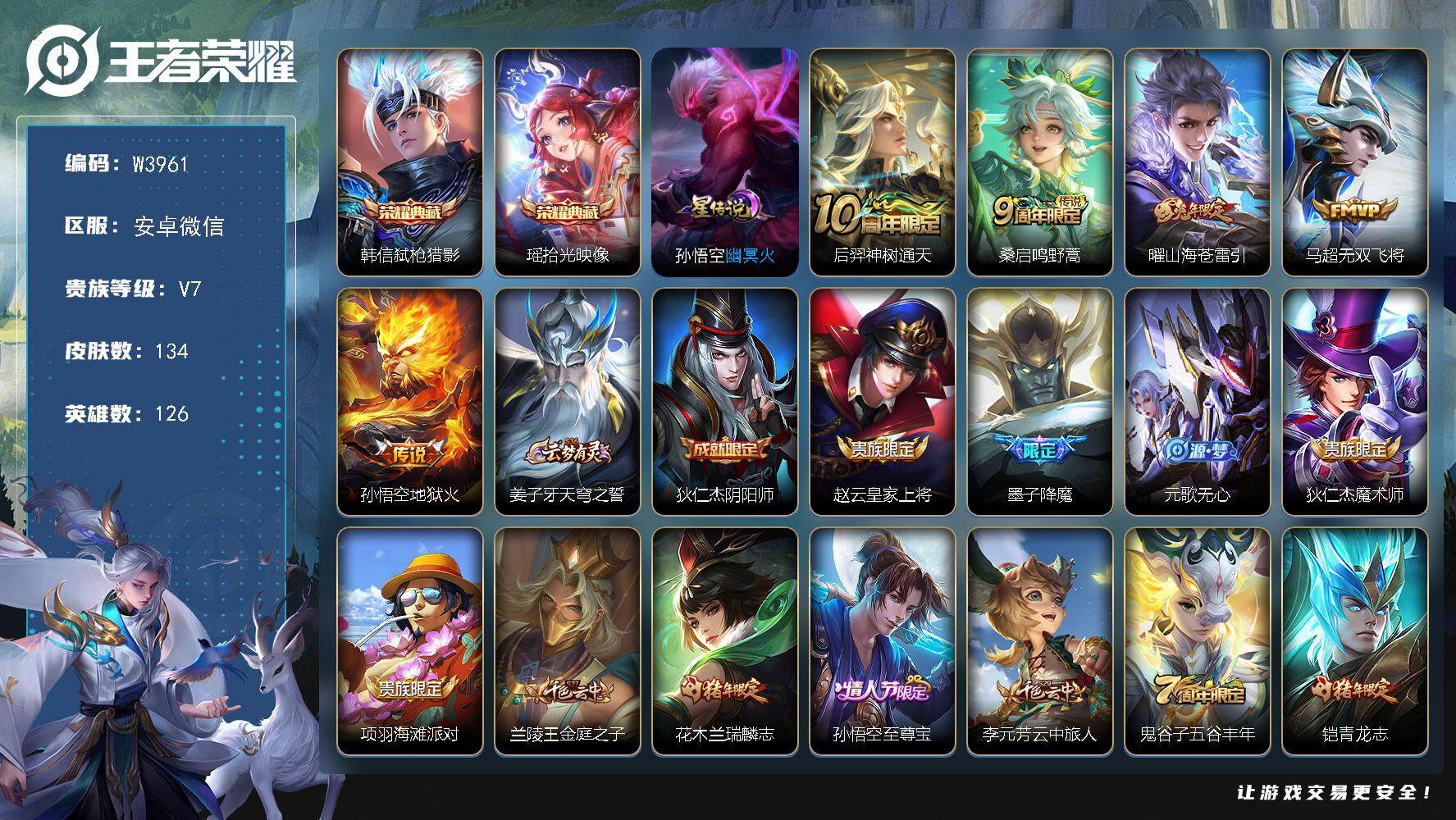 PX_2306763-【W3961】安卓微信-可二次-贵7-126英雄-134皮肤-2典藏-5传说-36史诗-43限定-1星元-3按键-神罪专属播报-拾光映像/弑枪猎影/至尊宝/无双飞将/山海·苍雷引/地狱火/神树通天/青龙志/瑞麟志/降魔-贵族积分2.5W-营地ID:1817318246 【星元皮肤】:孙悟空幽冥火