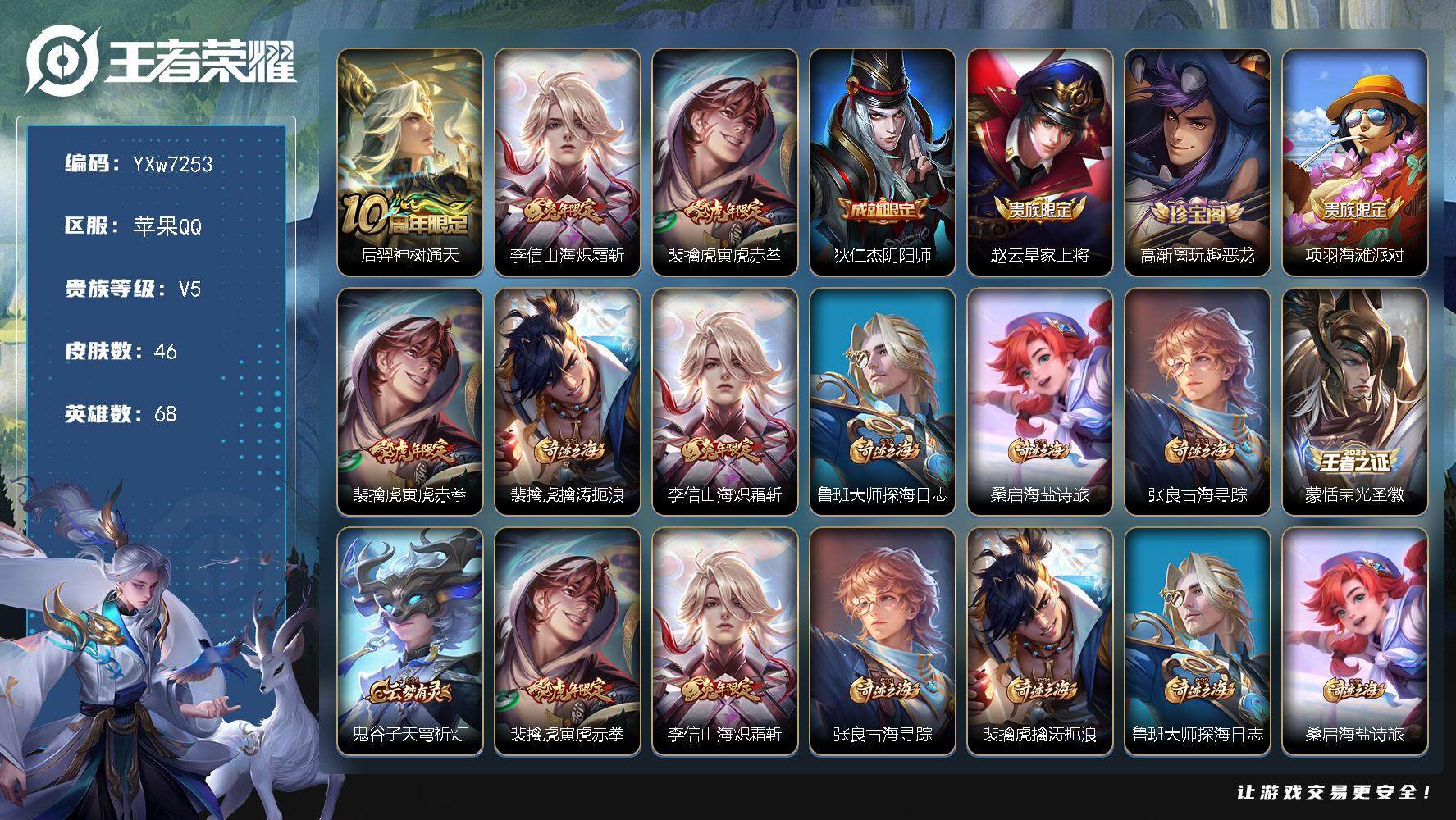 PX_2292101-??小号·国5小国标1.5w李信·山海炽霜斩·寅虎赤拳·可二次】YXw7253-苹果Q-68英雄-46皮肤-5王者印记-110铭文-贵族积分0w【贵族5】【3传说·2按键】【因赛季更新游戏段付以上号为准!】 【传说皮肤】:后羿神树通天,李信山海炽霜斩,裴擒虎寅虎赤拳 【限定皮肤】:狄仁杰阴阳师,赵云皇家上将,高渐离玩趣恶龙,项羽海滩派对,裴擒虎寅虎赤拳,裴擒虎擒涛扼浪,李信山海炽霜斩,鲁班大师探海日志,桑启海盐诗旅,张良古海寻踪,蒙恬荣光圣徽,鬼谷子天穹祈灯 【年限皮肤】:裴擒虎寅虎赤拳,李信山海炽霜斩 【赛季限定】:张良古海寻踪,裴擒虎擒涛扼浪,鲁班大师探海日志,桑启海盐诗旅,鬼谷子天穹祈灯,蒙恬荣光圣徽 【史诗皮肤】:露娜紫霞仙子,赵云皇家上将,嬴政摇滚巨星,妲己魅力维加斯,墨子金属风暴,吕布圣诞狂欢,白起星夜王子,沈梦溪月团寄思,蒙恬荣光圣徽 【其他皮肤】:项羽海滩派对,韩信街头霸王,赵云白执事,孙膑天使之翼,亚瑟死亡骑士,达摩拳王,张飞五福同心,后羿阿尔法小队,狄仁杰阴阳师,关羽龙腾万里,孙尚香沉稳之力,苏烈坚韧之力,大乔守护之力,高渐离玩趣恶龙,桑启海盐诗旅,牛魔牛运亨通,裴擒虎擒涛扼浪,鲁班大师探海日志,李元芳妄想特派,张良古海寻踪,钟无艳聚星闪耀,后羿完美运算,鬼谷子天穹祈灯,钟馗虚灵犬护,艾琳鹤鸣心笺,孙膑未来旅行,周瑜海军大将,马可波罗激情绿茵,铠龙域领主,苏烈爱与和平,李信灼热之刃,瑶森,澜孤猎,司空震启蛰 【内测皮肤】:高渐离玩趣恶龙