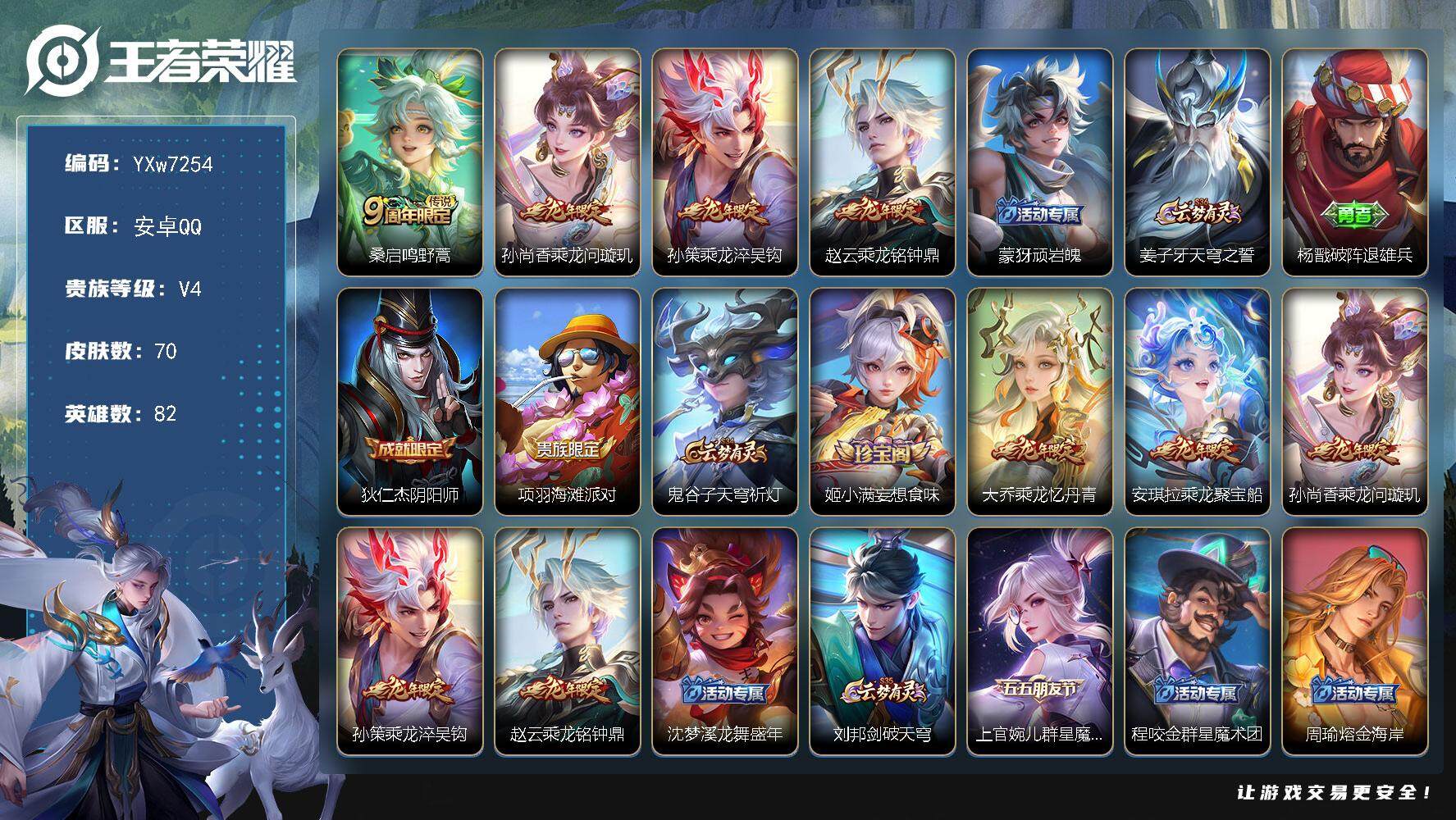 PX_2292117-??价比·满龙年限定·乘龙问璇玑·乘龙淬吴钩·乘龙铭钟鼎·乘龙忆丹青·乘龙聚宝船·可二次】YXw7254-安卓Q-82英雄-70皮肤-0王者印记-60铭文-贵族积分0w【贵族4】【·4传说·4按键】【因赛季更新游戏段付以上号为准!】 【传说皮肤】:桑启鸣野蒿,孙尚香乘龙问璇玑,孙策乘龙淬吴钩,赵云乘龙铭钟鼎 【限定皮肤】:蒙犽顽岩魄,姜子牙天穹之誓,杨戬破阵退雄兵,狄仁杰阴阳师,项羽海滩派对,鬼谷子天穹祈灯,姬小满妄想食味,大乔乘龙忆丹青,安琪拉乘龙聚宝船,孙尚香乘龙问璇玑,孙策乘龙淬吴钩,赵云乘龙铭钟鼎,沈梦溪龙舞盛年,刘邦剑破天穹,上官婉儿群星魔术团,程咬金群星魔术团,周瑜熔金海岸 【年限皮肤】:大乔乘龙忆丹青,安琪拉乘龙聚宝船,孙尚香乘龙问璇玑,孙策乘龙淬吴钩,赵云乘龙铭钟鼎 【赛季限定】:鬼谷子天穹祈灯,刘邦剑破天穹,姜子牙天穹之誓 【史诗皮肤】:甄姬冰雪圆舞曲,王昭君偶像歌手,廉颇地狱岩魂,宫本武藏鬼剑武藏,孙尚香水果甜心,妲己魅力维加斯,吕布圣诞狂欢,亚瑟心灵战警,雅典娜冰冠公主,姬小满妄想食味,安琪拉乘龙聚宝船,大乔乘龙忆丹青,上官婉儿群星魔术团,蒙犽顽岩魄,少司缘涂山红红,亚连破空之剑 【其他皮肤】:项羽海滩派对,赵云白执事,武则天东方不败,妲己少女阿狸,典韦黄金武士,亚瑟死亡骑士,狄仁杰阴阳师,大乔守护之力,狂铁特工战影,露娜瓷语鉴心,鲁班大师乓乓大师,猪八戒潮玩探月行,赵怀真太极少年,姬小满零食大作战,鬼谷子天穹祈灯,朵莉亚金色潮汐,亚瑟鸿运当头,沈梦溪龙舞盛年,钟无艳春野之旅,刘邦剑破天穹,程咬金群星魔术团,杨戬破阵退雄兵,姜子牙天穹之誓,周瑜熔金海岸,孙悟空神迹守卫,盘古敬我三分,东皇太一噬灭天穹,钟馗虚灵犬护,阿古朵布丁狗之约,露娜命运加冕,艾琳鹤鸣心笺,鲁班七号木偶奇遇记,露娜绯红之刃,钟无艳生化警戒,兰陵王隐刃,钟馗地府判官,李元芳特种部队,雅典娜战争女神,马可波罗激情绿茵,杨戬埃及法老,大乔伊势巫女,东皇太一东海龙王,明世隐占星师,弈星踏雪寻梅,伽罗花见巫女,沈梦溪棒球奇才,上官婉儿修竹墨客,鲁班大师归虚梦演,云缨赤焰之缨,暃碧珀绯影 【内测皮肤】:狂铁特工战影