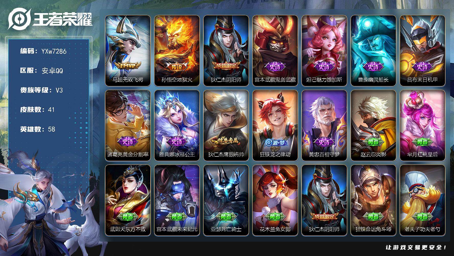PX_2292536-??对抗路小号·金标1.3w蒙恬·金标9k老夫子·银标8.4k马超·对抗路34段·无双飞将·幽灵船长·吕布末日机甲·龙之律动·可二次】YXw7286-安卓Q-53英雄-41皮肤-5王者印记-50铭文-贵族积分0w【贵族3】【2传说】【因赛季更新游戏段付以上号为准!】 【传说皮肤】:马超无双飞将,孙悟空地狱火 【限定皮肤】:狄仁杰阴阳师 【史诗皮肤】:宫本武藏鬼剑武藏,妲己魅力维加斯,曹操幽灵船长,吕布末日机甲,诸葛亮黄金分割率,雅典娜冰冠公主,狄仁杰鹰眼统帅,狂铁龙之律动,黄忠百相守梦 【其他皮肤】:赵云忍炎影,芈月红桃皇后,武则天东方不败,宫本武藏未来纪元,亚瑟死亡骑士,花木兰兔女郎,狄仁杰阴阳师,狂铁命运角斗场,老夫子功夫老勺,大乔守护之力,典韦铁甲之心,蒙恬蔚蓝守将,大司命暗都幽影,东皇太一噬灭天穹,苍苍林狼骑,太乙真人谧流熔炉,典韦铁骨偃魂,西施雪境奇遇,甄姬逆浪荇歌,庄周锦麟游梦,莱西奥踏浪烽翎,艾琳鹤鸣心笺,老夫子潮流仙人,杨戬埃及法老,铠龙域领主,梦奇美梦成真,李信灼热之刃,马超幸存者,蒙恬秩序猎龙将,司空震启蛰