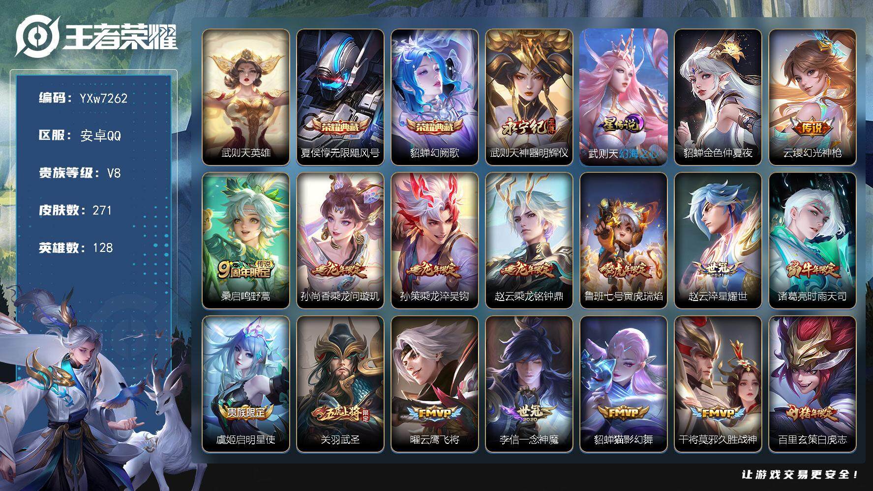 PX_2292286-??价比·无限飓风号·幻阙歌·武则天·神器明辉仪·幻海之心·金色貂蝉·龙腾四海天幕·满龙年限定·乘龙问璇玑·乘龙淬吴钩·乘龙铭钟鼎·寅虎瑞焰·时雨天司·武圣·白虎志·朱雀志·神威·烈魂·虎魄·龙胆·山海玄木吟·多年限·可二次】YXw7262-安卓Q-128英雄-271皮肤-10王者印记-280铭文-贵族积分9w【贵族8】【3典藏·1无双·2星传说·21传说·1天幕·5按键】【因赛季更新游戏段付以上号为准!】 【英雄全皮】:蒙恬全皮,空空儿全皮,影全皮 【荣耀典藏】:武则天英雄,夏侯惇无限飓风号,貂蝉幻阙歌 【无双皮肤】:武则天神器明辉仪 【星元皮肤】:武则天幻海之心,貂蝉金色仲夏夜 【天幕】:龙腾四海天幕 【传说皮肤】:云缨幻光神枪,桑启鸣野蒿,孙尚香乘龙问璇玑,孙策乘龙淬吴钩,赵云乘龙铭钟鼎,鲁班七号寅虎瑞焰,赵云淬星耀世,诸葛亮时雨天司,虞姬启明星使,关羽武圣,曜云鹰飞将,李信一念神魔,貂蝉猫影幻舞,干将莫邪久胜战神,百里玄策白虎志,后羿黄金射手座,貂蝉仲夏夜之梦,孙尚香末日机甲,宫本武藏地狱之眼,孙悟空地狱火,武则天海洋之心 【限定皮肤】:狄仁杰阴阳师,赵云皇家上将,赵云龙胆,嬴政白昼王子,鲁班七号寅虎瑞焰,庄周云端筑梦师,阿轲迷踪丽影,钟无艳超时空战士,芈月重明,芈月白晶晶,吕布猎兽之王,吕布御风骁将,元歌云间偶戏,元歌无心,夏侯惇朔风刀,甄姬落雪兰心,典韦穷奇,典韦蓝屏警告,马可波罗暗影游猎,马可波罗山海玄木吟,狄仁杰魔术师,狄仁杰万华元夜,项羽海滩派对,老夫子醍醐杖,老夫子航海奇遇记,关羽武圣,程咬金演武夺筹,刘邦夺宝奇兵,兰陵王金庭之子,花木兰默契交锋,亚瑟潮玩骑士王,牛魔御旌,牛魔奔雷神使,张飞虎魄,李元芳云中旅人,虞姬启明星使,钟馗驱傩正仪,杨玉环遇见飞天,杨戬潮玩骑兵,女娲朔望之晖,雅典娜单词大作战,蔡文姬繁星吟游,太乙真人华丽摇滚,鬼谷子原初探秘者,鬼谷子五谷丰年,诸葛亮时雨天司,黄忠烈魂,百里玄策白虎志,百里玄策原初追逐者,百里守约朱雀志,弈星混沌棋,明世隐疑决卦,裴擒虎李小龙,裴擒虎擒涛扼浪,米莱狄御霄,瑶山海碧波行,云中君纤云弄巧,猪八戒西部大镖客,嫦娥拒霜思,嫦娥暖冬兔眠,西施玲珑珍味,蒙犽狂想玩偶喵,鲁班大师探海日志,桑启海盐诗旅,暃星界游侠,戈娅驭风魔法,艾琳女武神,艾琳流音漫舞,司空震地狱燃心,阿古朵江河有灵,张良古海寻踪,蒙犽百解令,蒙恬荣光圣徽,高渐离燃音魔法,妲己灵卜魔法,鬼谷子天穹祈灯,伽罗琥珀纪元,大乔乘龙忆丹青,安琪拉乘龙聚宝船,孙尚香乘龙问璇玑,孙策乘龙淬吴钩,赵云乘龙铭钟鼎,沈梦溪龙舞盛年 【年限皮肤】:百里玄策白虎志,百里守约朱雀志,鲁班七号寅虎瑞焰,吕布御风骁将,牛魔奔雷神使,诸葛亮时雨天司,马超神威,关羽武圣,黄忠烈魂,张飞虎魄,赵云龙胆,瑶山海碧波行,马可波罗山海玄木吟,大乔乘龙忆丹青,安琪拉乘龙聚宝船,孙尚香乘龙问璇玑,孙策乘龙淬吴钩,赵云乘龙铭钟鼎 【赛季限定】:芈月重明,夏侯惇朔风刀,典韦穷奇,狄仁杰万华元夜,老夫子醍醐杖,程咬金演武夺筹,兰陵王金庭之子,张良古海寻踪,牛魔御旌,李元芳云中旅人,钟馗驱傩正仪,鬼谷子原初探秘者,百里玄策原初追逐者,弈星混沌棋,明世隐疑决卦,裴擒虎擒涛扼浪,米莱狄御霄,鲁班大师探海日志,桑启海盐诗旅,鬼谷子天穹祈灯,蒙恬荣光圣徽 【战令限定】:嬴政白昼王子,阿轲迷踪丽影,钟无艳超时空战士,吕布猎兽之王,元歌云间偶戏,甄姬落雪兰心,典韦蓝屏警告,马可波罗暗影游猎,老夫子航海奇遇记,刘邦夺宝奇兵,艾琳流音漫舞,亚瑟潮玩骑士王,杨戬潮玩骑兵,女娲朔望之晖,雅典娜单词大作战,猪八戒西部大镖客,嫦娥暖冬兔眠,西施玲珑珍味,蒙犽狂想玩偶喵,司空震地狱燃心,暃星界游侠,戈娅驭风魔法,高渐离燃音魔法,妲己灵卜魔法 【史诗皮肤】:鲁班七号电玩小子,项羽苍穹之光,赵云皇家上将,貂蝉圣诞恋歌,甄姬冰雪圆舞曲,王昭君偶像歌手,狄仁杰魔术师,廉颇地狱岩魂,宫本武藏鬼剑武藏,孙尚香水果甜心,嬴政暗夜贵公子,嬴政摇滚巨星,妲己魅力维加斯,妲己女仆咖啡,墨子龙骑士,墨子金属风暴,吕布圣诞狂欢,刘禅绅士熊喵,曹操幽灵船长,李白千年之狐,吕布末日机甲,张飞乱世虎臣,韩信白龙吟,花木兰水晶猎龙者,刘邦德古拉伯爵,夏侯惇乘风破浪,小乔缤纷独角兽,兰陵王暗隐猎兽者,诸葛亮黄金分割率,亚瑟心灵战警,雅典娜冰冠公主,安琪拉心灵骇客,庄周云端筑梦师,百里守约特工魅影,铠曙光守护者,蔡文姬舞动绿茵,刘禅天才门将,李元芳逐浪之夏,程咬金功夫厨神,白起星夜王子,阿轲节奏热浪,杨玉环遇见飞天,嬴政白昼王子,孙策猫狗日记,大乔猫狗日记,百里守约朱雀志,典韦蓝屏警告,伽罗箭羽风息,狄仁杰鹰眼统帅,公孙离无限星赏官,蔡文姬繁星吟游,不知火舞魅语,阿轲迷踪丽影,橘右京修罗,马超神威,赵云龙胆,黄忠烈魂,马可波罗暗影游猎,张飞虎魄,蒙犽狂想玩偶喵,百里玄策原初追逐者,裴擒虎李小龙,云中君纤云弄巧,元歌云间偶戏,芈月白晶晶,牛魔奔雷神使,吕布御风骁将,花木兰默契交锋,老夫子航海奇遇记,嫦娥拒霜思,钟无艳超时空战士,鬼谷子五谷丰年,元歌无心,暃星界游侠,马可波罗山海玄木吟,瑶山海碧波行,戈娅驭风魔法,司空震地狱燃心,阿古朵江河有灵,蒙犽百解令,周瑜雪夜绮愿,妲己灵卜魔法,高渐离燃音魔法,蒙恬荣光圣徽,伽罗琥珀纪元,安琪