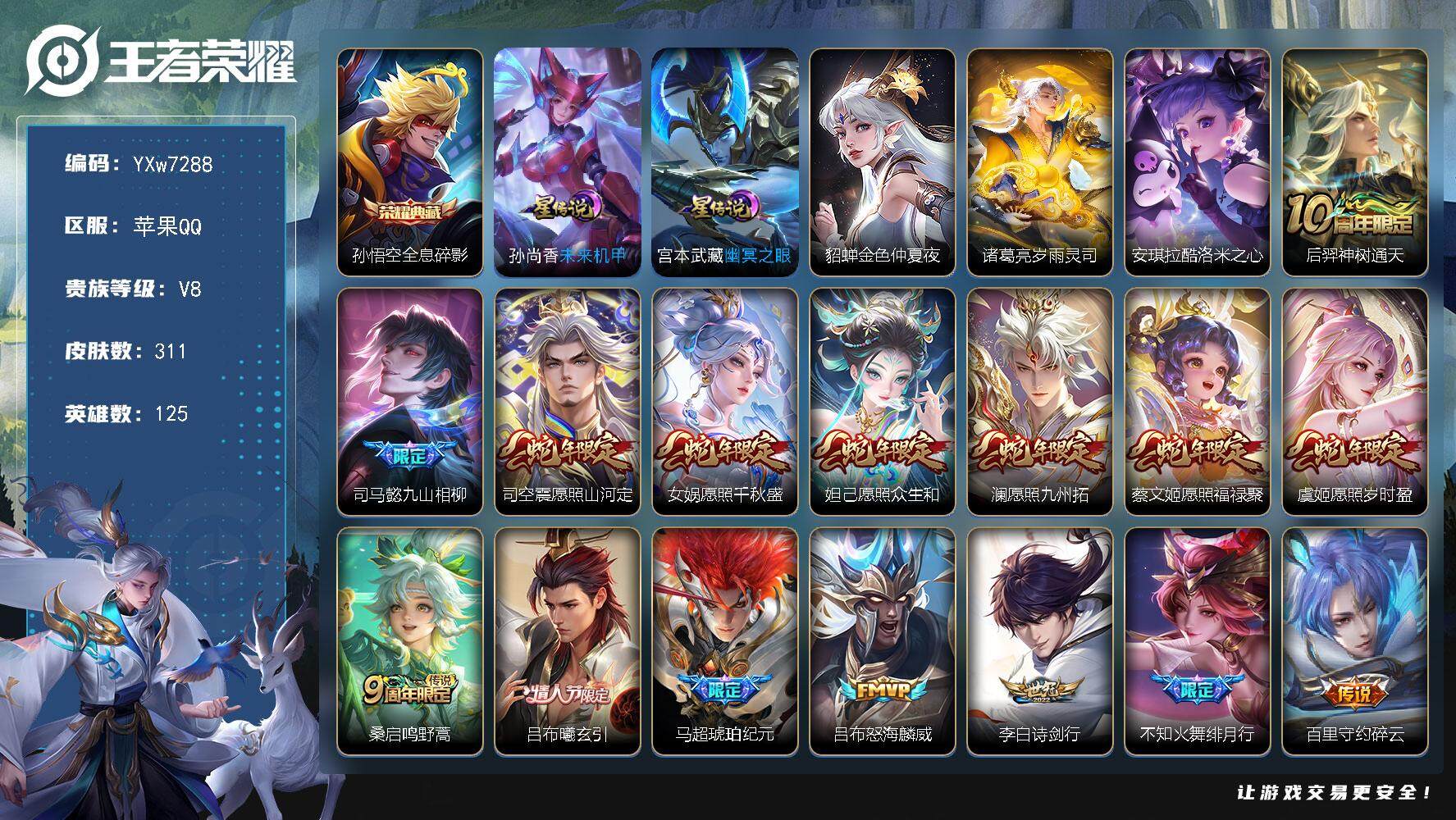 PX_2292537-??精选·精品质量v8·44段打野·万战金标守约·金标李白·金标元歌·金标张良·马超全皮·满蛇年限定·全息碎影·酷洛米之心·九山相柳·曦玄引·寅虎赤拳·白虎志·时雨天司·太华·怒海麟威·诗剑行·绯月行·碎云·深海之息·无双飞将·炽阳神光·至尊宝·4星传说·岁雨灵司·可二次】YXw7288-苹果Q-125英雄-311皮肤-21王者印记-310铭文-贵族积分6w【贵族8】【1典藏·1珍品传说·4星传说·32传说·1天幕·12按键】【因赛季更新游戏段付以上号为准!】 【英雄全皮】:司马懿全皮,孙权全皮,鬼谷子全皮,马超全皮,戈娅全皮,空空儿全皮 【荣耀典藏】:孙悟空全息碎影 【星元皮肤】:孙尚香未来机甲,宫本武藏幽冥之眼,貂蝉金色仲夏夜,诸葛亮岁雨灵司 【天幕】:共赏芳华天幕 【珍品传说】:安琪拉酷洛米之心 【传说皮肤】:后羿神树通天,司马懿九山相柳,司空震愿照山河定,女娲愿照千秋盛,妲己愿照众生和,澜愿照九州拓,蔡文姬愿照福禄聚,虞姬愿照岁时盈,桑启鸣野蒿,吕布曦玄引,马超琥珀纪元,吕布怒海麟威,李白诗剑行,不知火舞绯月行,百里守约碎云,马可波罗深海之息,马超无双飞将,孙策末日机甲,裴擒虎寅虎赤拳,诸葛亮时雨天司,镜炽阳神光,虞姬启明星使,曜云鹰飞将,李信一念神魔,伽罗太华,虞姬云霓雀翎,达摩黄金狮子座,百里玄策白虎志,貂蝉仲夏夜之梦,李白凤求凰,孙尚香末日机甲,宫本武藏地狱之眼 【限定皮肤】:姜子牙天穹之誓,狄仁杰阴阳师,赵云皇家上将,嬴政优雅恋人,庄周高山流水,高渐离死亡摇滚,钟无艳超时空战士,扁鹊奇幻香踪,元歌云间偶戏,元歌无心,夏侯惇朔风刀,甄姬游园惊梦,甄姬落雪兰心,马可波罗暗影游猎,马可波罗深海之息,狄仁杰魔术师,狄仁杰万华元夜,达摩沙漠行僧,项羽海滩派对,老夫子醍醐杖,程咬金演武夺筹,王昭君午后时光,兰陵王金庭之子,花木兰默契交锋,不知火舞绯月行,亚瑟潮玩骑士王,孙悟空至尊宝,孙悟空孙行者,牛魔御旌,后羿圣弓游侠,李元芳云中旅人,虞姬启明星使,钟馗驱傩正仪,杨戬潮玩骑兵,干将莫邪胡桃夹子,干将莫邪真爱魔法,雅典娜单词大作战,雅典娜黎明之约,鬼谷子原初探秘者,鬼谷子五谷丰年,诸葛亮时雨天司,苏烈千军破阵,百里玄策白虎志,百里玄策原初追逐者,百里守约朱雀志,弈星混沌棋,梦奇顽趣,沈梦溪大漠名商,明世隐疑决卦,裴擒虎天狼狩猎者,裴擒虎李小龙,裴擒虎寅虎赤拳,裴擒虎擒涛扼浪,狂铁电玩高手,米莱狄御霄,云中君纤云弄巧,伽罗太华,盾山御銮,猪八戒西部大镖客,上官婉儿梁祝,嫦娥拒霜思,嫦娥暖冬兔眠,西施玲珑珍味,蒙犽狂想玩偶喵,鲁班大师探海日志,桑启海盐诗旅,暃星界游侠,戈娅驭风魔法,艾琳女武神,阿古朵江河有灵,张良古海寻踪,蒙恬荣光圣徽,鬼谷子天穹祈灯,马超琥珀纪元,吕布曦玄引,沈梦溪龙舞盛年,刘邦剑破天穹,程咬金群星魔术团,周瑜熔金海岸 【年限皮肤】:百里玄策白虎志,百里守约朱雀志,裴擒虎寅虎赤拳,李白凤求凰,诸葛亮时雨天司,伽罗太华,马超神威 【赛季限定】:夏侯惇朔风刀,狄仁杰万华元夜,达摩沙漠行僧,老夫子醍醐杖,程咬金演武夺筹,兰陵王金庭之子,张良古海寻踪,牛魔御旌,李元芳云中旅人,钟馗驱傩正仪,雅典娜黎明之约,鬼谷子原初探秘者,苏烈千军破阵,百里玄策原初追逐者,弈星混沌棋,梦奇顽趣,沈梦溪大漠名商,明世隐疑决卦,裴擒虎擒涛扼浪,米莱狄御霄,盾山御銮,鲁班大师探海日志,桑启海盐诗旅,鬼谷子天穹祈灯,蒙恬荣光圣徽,刘邦剑破天穹,姜子牙天穹之誓 【战令限定】:钟无艳超时空战士,扁鹊奇幻香踪,元歌云间偶戏,甄姬落雪兰心,马可波罗暗影游猎,王昭君午后时光,亚瑟潮玩骑士王,后羿圣弓游侠,杨戬潮玩骑兵,干将莫邪真爱魔法,雅典娜单词大作战,狂铁电玩高手,猪八戒西部大镖客,嫦娥暖冬兔眠,西施玲珑珍味,蒙犽狂想玩偶喵,暃星界游侠,戈娅驭风魔法 【史诗皮肤】:露娜紫霞仙子,阿轲暗夜猫娘,赵云皇家上将,赵云未来纪元,貂蝉圣诞恋歌,甄姬冰雪圆舞曲,狄仁杰魔术师,廉颇地狱岩魂,宫本武藏鬼剑武藏,孙尚香水果甜心,嬴政优雅恋人,嬴政摇滚巨星,妲己魅力维加斯,墨子金属风暴,吕布圣诞狂欢,曹操幽灵船长,李白千年之狐,张飞乱世虎臣,孙悟空至尊宝,花木兰水晶猎龙者,刘邦德古拉伯爵,夏侯惇乘风破浪,兰陵王暗隐猎兽者,诸葛亮黄金分割率,甄姬游园惊梦,亚瑟心灵战警,安琪拉心灵骇客,百里守约特工魅影,铠曙光守护者,蔡文姬舞动绿茵,李元芳逐浪之夏,程咬金功夫厨神,白起星夜王子,阿轲节奏热浪,孙策猫狗日记,百里守约朱雀志,裴擒虎天狼狩猎者,狄仁杰鹰眼统帅,公孙离无限星赏官,上官婉儿梁祝,娜可露露晚萤,橘右京修罗,瑶遇见神鹿,马超神威,马可波罗暗影游猎,蒙犽狂想玩偶喵,百里玄策原初追逐者,裴擒虎李小龙,云中君纤云弄巧,元歌云间偶戏,花木兰默契交锋,干将莫邪真爱魔法,孙悟空孙行者,庄周高山流水,司马懿暗渊魔法,嫦娥拒霜思,雅典娜黎明之约,狂铁电玩高手,钟无艳超时空战士,鬼谷子五谷丰年,元歌无心,梦奇顽趣,暃星界游侠,扁鹊奇幻香踪,刘禅电玩爆裂旋风,戈娅驭风魔法,阿古朵江河有灵,蒙恬荣光圣徽,孙膑茶境仙,赵怀真器灵浮梦炉,阿轲化蝶舞,狂铁龙之律动,黄忠百相守梦,西施织梦人,公孙离涂山容容,少司缘巫礼祀神 【其他皮肤】:项羽海滩派对,韩信教廷特使,韩信街头霸王,露娜哥特玫瑰,阿轲爱心护理,达摩大发明家,赵