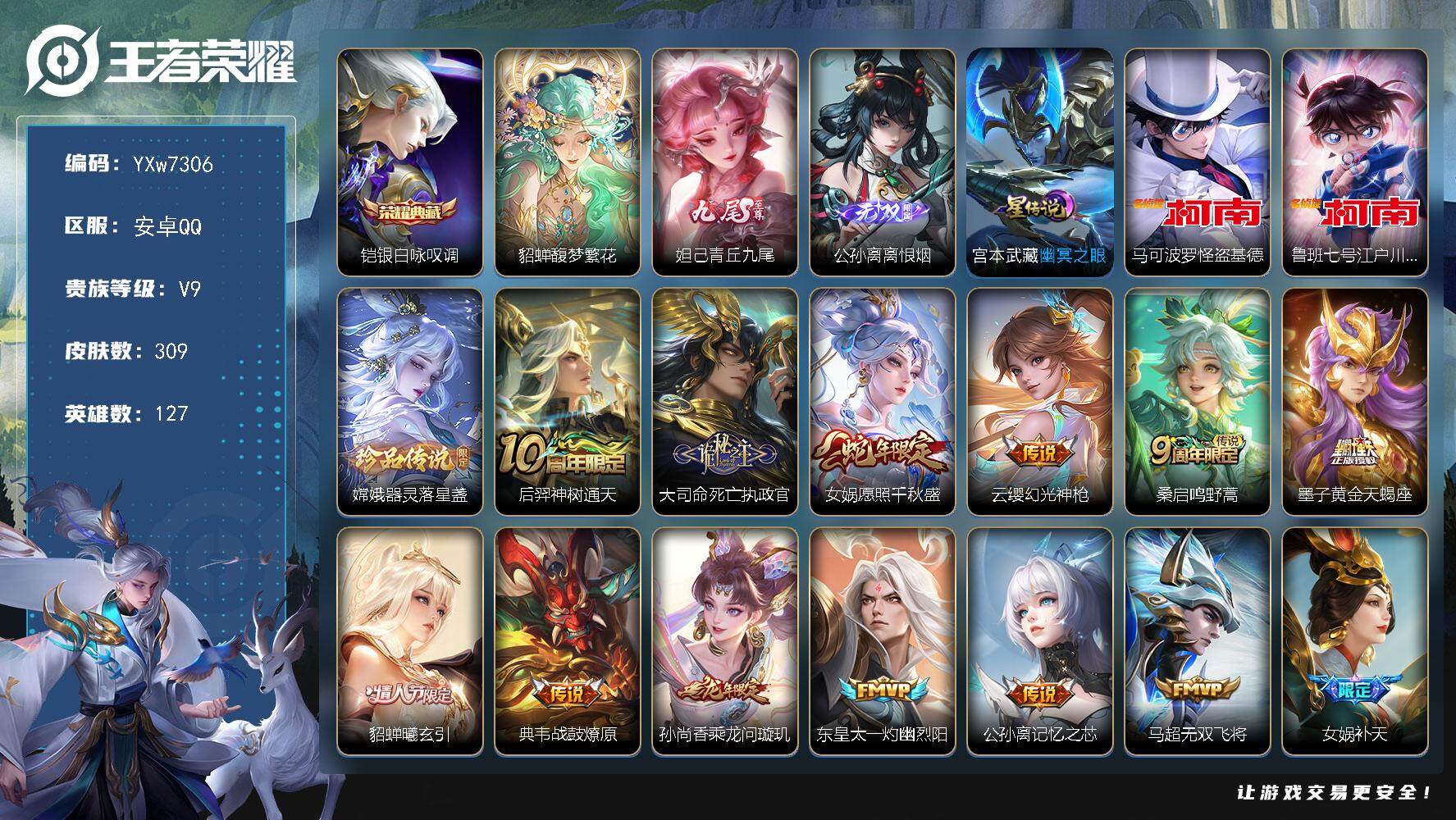 PX_2292866-??推荐高质量v9·59段对抗路·53段中路·1.3W小国梦奇·万战小国弈星·万战省7赵怀真·金标哪吒·金标杨玉环·馥梦繁花·青丘九尾·离恨烟·银白咏叹调·怪盗基德·江户川柯南·器灵落星盏·寅虎赤拳·可二次】YXw7306-安卓Q-127英雄-309皮肤-20王者印记-250铭文-贵族积分10w【贵族9】【1典藏·1珍品无双·2无双·3珍品传说·1星传说·23传说·15按键】【因赛季更新游戏段付以上号为准!】 【英雄全皮】:苏烈全皮,弈星全皮,大司命全皮 【荣耀典藏】:铠银白咏叹调 【珍品无双】:貂蝉馥梦繁花 【星元皮肤】:宫本武藏幽冥之眼 【无双皮肤】:妲己青丘九尾,公孙离离恨烟 【珍品传说】:马可波罗怪盗基德,鲁班七号江户川柯南,嫦娥器灵落星盏 【传说皮肤】:后羿神树通天,大司命死亡执政官,女娲愿照千秋盛,云缨幻光神枪,桑启鸣野蒿,墨子黄金天蝎座,貂蝉曦玄引,典韦战鼓燎原,孙尚香乘龙问璇玑,东皇太一灼幽烈阳,公孙离记忆之芯,马超无双飞将,女娲补天,裴擒虎寅虎赤拳,赵云淬星耀世,周瑜音你心动,铠绛天战甲,虞姬启明星使,刘备时之恋人,张良黄金白羊座,梦奇胖达荣荣,孙尚香末日机甲,宫本武藏地狱之眼 【限定皮肤】:白起狰,公孙离离恨烟,蒙犽顽岩魄,蔡文姬夏日便利店,大乔绒语心约,虞姬夏日便利店,姜子牙天穹之誓,狄仁杰阴阳师,虞姬凯尔特女王,赵云皇家上将,孙尚香蔷薇恋人,庄周云端筑梦师,扁鹊炼金王,扁鹊奇幻香踪,芈月重明,吕布猎兽之王,元歌无心,夏侯惇朔风刀,甄姬游园惊梦,曹操烛龙,典韦穷奇,马可波罗山海玄木吟,狄仁杰魔术师,狄仁杰万华元夜,达摩星际陆战队,达摩沙漠行僧,项羽海滩派对,老夫子醍醐杖,程咬金演武夺筹,兰陵王金庭之子,李元芳云中旅人,虞姬启明星使,钟馗驱傩正仪,杨玉环遇见飞天,杨玉环寅虎心曲,杨戬潮玩骑兵,女娲补天,雅典娜黎明之约,蔡文姬繁星吟游,太乙真人饕餮,鬼谷子原初探秘者,苏烈玄武志,苏烈千军破阵,百里玄策原初追逐者,弈星混沌棋,梦奇顽趣,沈梦溪大漠名商,沈梦溪匿光破解者,明世隐疑决卦,裴擒虎寅虎赤拳,裴擒虎擒涛扼浪,狂铁御狮,米莱狄御霄,米莱狄胡桃异想国,嫦娥如梦令,嫦娥拒霜思,嫦娥暖冬兔眠,西施至美乘鲤谣,桑启海盐诗旅,暃星界游侠,阿古朵江河有灵,张良古海寻踪,蒙恬荣光圣徽,高渐离燃音魔法,妲己灵卜魔法,鬼谷子天穹祈灯,姬小满妄想食味,大乔乘龙忆丹青,孙尚香乘龙问璇玑,貂蝉曦玄引,沈梦溪龙舞盛年,曹操夜都魔契,鲁班七号蔬乡物语,李元芳蔬乡物语,刘邦剑破天穹,程咬金群星魔术团,镜青焰无极,项羽苍威无极,海诺心动手记,刘备异域游侠,芈月浮光幕影,周瑜熔金海岸 【年限皮肤】:苏烈玄武志,裴擒虎寅虎赤拳,杨玉环寅虎心曲,马可波罗山海玄木吟,大乔乘龙忆丹青,孙尚香乘龙问璇玑 【赛季限定】:扁鹊炼金王,白起狰,芈月重明,夏侯惇朔风刀,曹操烛龙,典韦穷奇,狄仁杰万华元夜,达摩沙漠行僧,老夫子醍醐杖,程咬金演武夺筹,兰陵王金庭之子,张良古海寻踪,李元芳云中旅人,虞姬凯尔特女王,钟馗驱傩正仪,雅典娜黎明之约,太乙真人饕餮,鬼谷子原初探秘者,苏烈千军破阵,百里玄策原初追逐者,弈星混沌棋,梦奇顽趣,沈梦溪大漠名商,明世隐疑决卦,裴擒虎擒涛扼浪,狂铁御狮,米莱狄御霄,桑启海盐诗旅,鬼谷子天穹祈灯,蒙恬荣光圣徽,刘邦剑破天穹,姜子牙天穹之誓 【战令限定】:蔡文姬夏日便利店,虞姬夏日便利店,扁鹊奇幻香踪,吕布猎兽之王,达摩星际陆战队,杨戬潮玩骑兵,米莱狄胡桃异想国,嫦娥暖冬兔眠,暃星界游侠,高渐离燃音魔法,妲己灵卜魔法,鲁班七号蔬乡物语,李元芳蔬乡物语,镜青焰无极,项羽苍威无极 【史诗皮肤】:项羽苍穹之光,露娜紫霞仙子,赵云皇家上将,赵云未来纪元,貂蝉圣诞恋歌,甄姬冰雪圆舞曲,狄仁杰魔术师,廉颇地狱岩魂,宫本武藏鬼剑武藏,孙尚香蔷薇恋人,孙尚香水果甜心,嬴政暗夜贵公子,嬴政摇滚巨星,妲己魅力维加斯,妲己女仆咖啡,墨子龙骑士,墨子金属风暴,刘禅绅士熊喵,曹操幽灵船长,李白千年之狐,吕布末日机甲,张飞乱世虎臣,花木兰水晶猎龙者,刘邦德古拉伯爵,夏侯惇乘风破浪,小乔缤纷独角兽,兰陵王暗隐猎兽者,诸葛亮黄金分割率,甄姬游园惊梦,亚瑟心灵战警,雅典娜冰冠公主,庄周云端筑梦师,百里守约特工魅影,铠曙光守护者,蔡文姬舞动绿茵,刘禅天才门将,李元芳逐浪之夏,程咬金功夫厨神,白起星夜王子,阿轲节奏热浪,杨玉环遇见飞天,孙策猫狗日记,苏烈玄武志,伽罗箭羽风息,狄仁杰鹰眼统帅,蔡文姬繁星吟游,娜可露露晚萤,嫦娥如梦令,不知火舞魅语,橘右京修罗,百里玄策原初追逐者,米莱狄胡桃异想国,西施诗语江南,安琪拉时之奇旅,司马懿暗渊魔法,嫦娥拒霜思,雅典娜黎明之约,杨玉环寅虎心曲,哪吒雪上飞焰,夏洛特永昼,艾琳奇遇舞章,弈星滕王阁序,元歌无心,梦奇顽趣,暃星界游侠,马可波罗山海玄木吟,杨玉环银翎春语,扁鹊奇幻香踪,沈梦溪匿光破解者,海月浮梦罗烟,阿古朵江河有灵,西施至美乘鲤谣,妲己灵卜魔法,高渐离燃音魔法,蒙恬荣光圣徽,姬小满妄想食味,大乔乘龙忆丹青,曹操夜都魔契,鲁班七号蔬乡物语,镜青焰无极,海诺心动手记,芈月浮光幕影,蔡文姬夏日便利店,蒙犽顽岩魄,少司缘涂山红红,大司命东方月初,弈星炽弈燎原,艾琳陌上桑,牛魔星界战将,弈星万物之道,赵怀真器灵浮梦炉,狂铁龙之律动,云缨赞萌露比,黄忠百相守梦,西施织梦人,弈