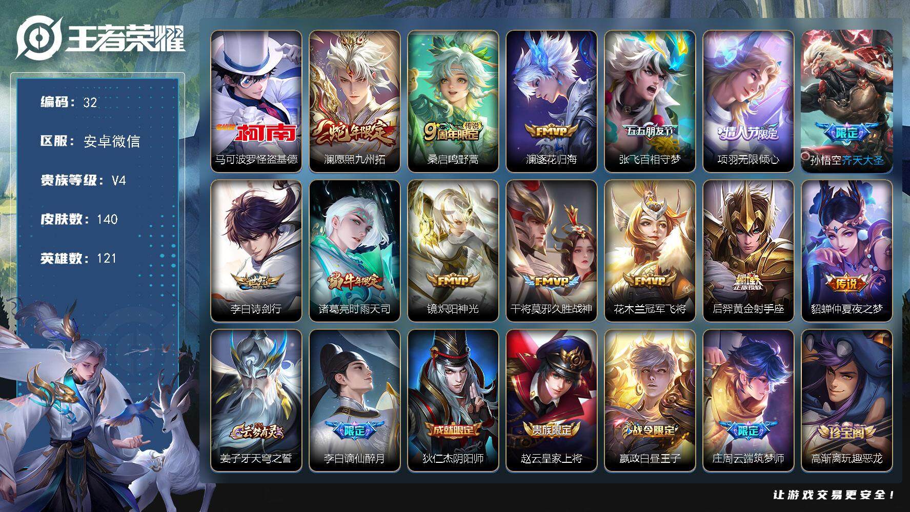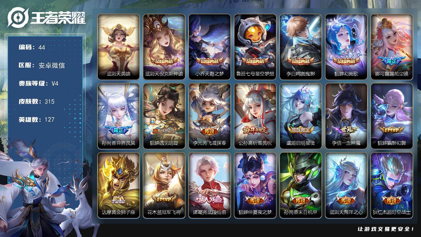 PX_2295043-WX-V9-社交限制-至尊星耀IV段位-123英雄-329皮肤-2典藏-0珍品无双-1无双-0珍品传说-27传说-91史诗 【英雄全皮】:刘邦全皮,蒙恬全皮 【荣耀典藏】:李白鸣剑曳影,花木兰九霄神辉 【无双皮肤】:李白碎月剑心 【传说皮肤】:桑启鸣野蒿,墨子黄金天蝎座,海月金乌负日,孙策乘龙淬吴钩,澜逐花归海,宫本武藏惊梅引,公孙离记忆之芯,吕布怒海麟威,百里守约碎云,后羿无尽星芒,孙尚香异界灵契,赵云淬星耀世,小乔音你心动,诸葛亮时雨天司,铠绛天战甲,镜炽阳神光,虞姬启明星使,孙悟空零号赤焰,关羽武圣,曜云鹰飞将,李信一念神魔,张良黄金白羊座,虞姬云霓雀翎,后羿黄金射手座,貂蝉仲夏夜之梦,孙尚香末日机甲,狄仁杰超时空战士 【限定皮肤】:白起狰,蒙犽顽岩魄,蔡文姬夏日便利店,大乔绒语心约,虞姬夏日便利店,姜子牙天穹之誓,杨戬破阵退雄兵,狄仁杰阴阳师,小乔纯白花嫁,赵云皇家上将,墨子神迹守卫,嬴政优雅恋人,孙尚香异界灵契,钟无艳超时空战士,扁鹊奇幻香踪,芈月幻夜卜梦,元歌无心,甄姬幽恒,甄姬女儿国国王,甄姬落雪兰心,典韦蓝屏警告,狄仁杰魔术师,狄仁杰万华元夜,达摩沙漠行僧,项羽海滩派对,老夫子醍醐杖,关羽武圣,程咬金演武夺筹,刘邦夺宝奇兵,韩信傲雪梅枪,王昭君午后时光,兰陵王金庭之子,花木兰青春决赛季,亚瑟潮玩骑士王,孙悟空大圣娶亲,孙悟空零号赤焰,孙悟空孙行者,后羿辉光之辰,后羿圣弓游侠,后羿无尽星芒,李元芳云中旅人,虞姬启明星使,杨戬潮玩骑兵,女娲朔望之晖,干将莫邪真爱魔法,雅典娜单词大作战,雅典娜黎明之约,鬼谷子原初探秘者,鬼谷子五谷丰年,诸葛亮时雨天司,黄忠火炮绅士,苏烈千军破阵,百里玄策原初追逐者,梦奇顽趣,沈梦溪大漠名商,裴擒虎李小龙,裴擒虎擒涛扼浪,狂铁电玩高手,云中君纤云弄巧,上官婉儿梁祝,嫦娥拒霜思,嫦娥暖冬兔眠,西施玲珑珍味,西施至美乘鲤谣,蒙犽狂想玩偶喵,鲁班大师探海日志,镜匿光追影者,桑启海盐诗旅,暃星界游侠,戈娅驭风魔法,艾琳流音漫舞,司空震地狱燃心,阿古朵江河有灵,张良古海寻踪,蒙犽百解令,蒙恬荣光圣徽,高渐离燃音魔法,妲己灵卜魔法,鬼谷子天穹祈灯,李白碎月剑心,伽罗琥珀纪元,姬小满妄想食味,安琪拉乘龙聚宝船,孙策乘龙淬吴钩,沈梦溪龙舞盛年,鲁班七号蔬乡物语,李元芳蔬乡物语,海月金乌负日,刘邦剑破天穹,程咬金群星魔术团,镜青焰无极,