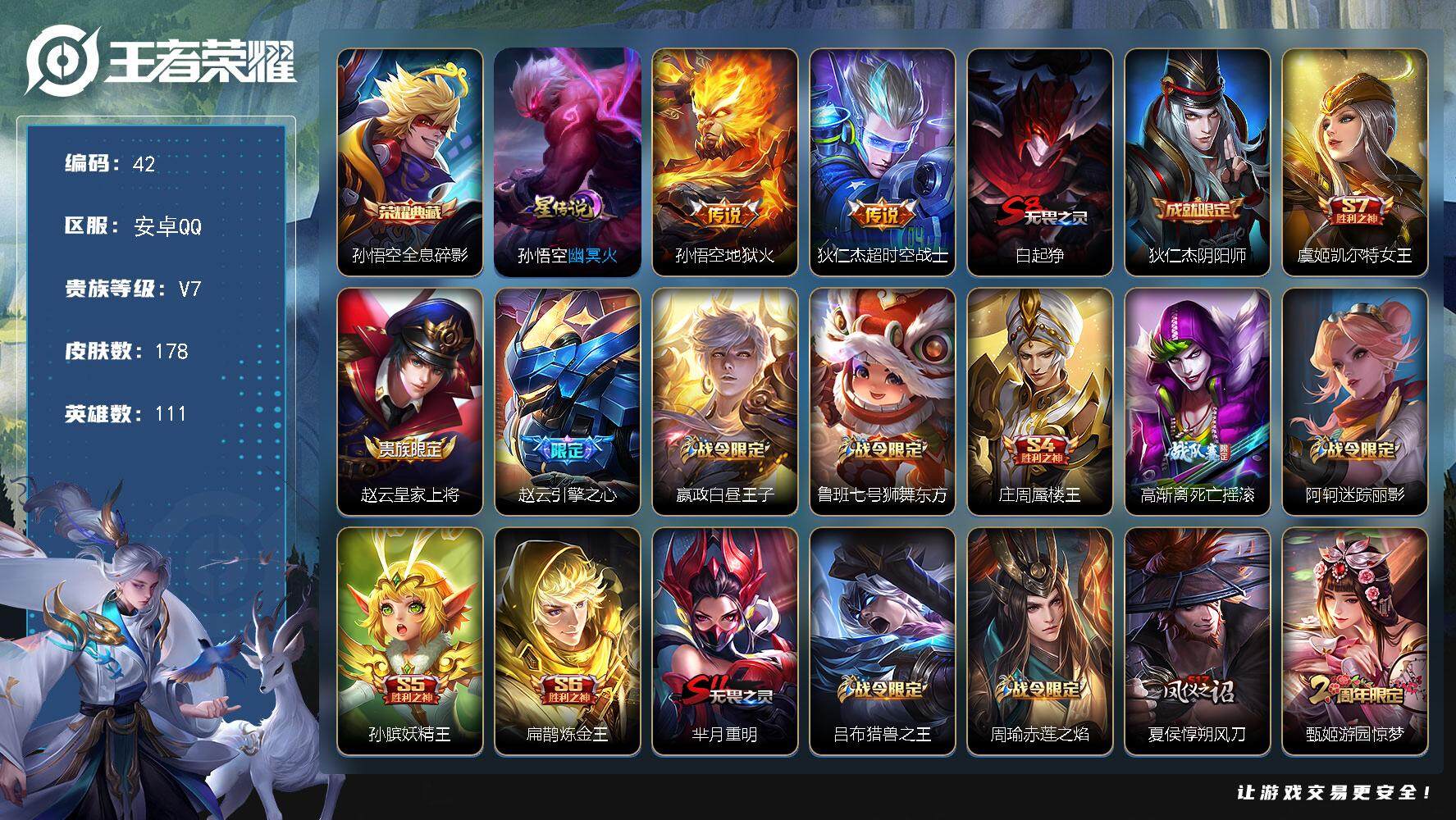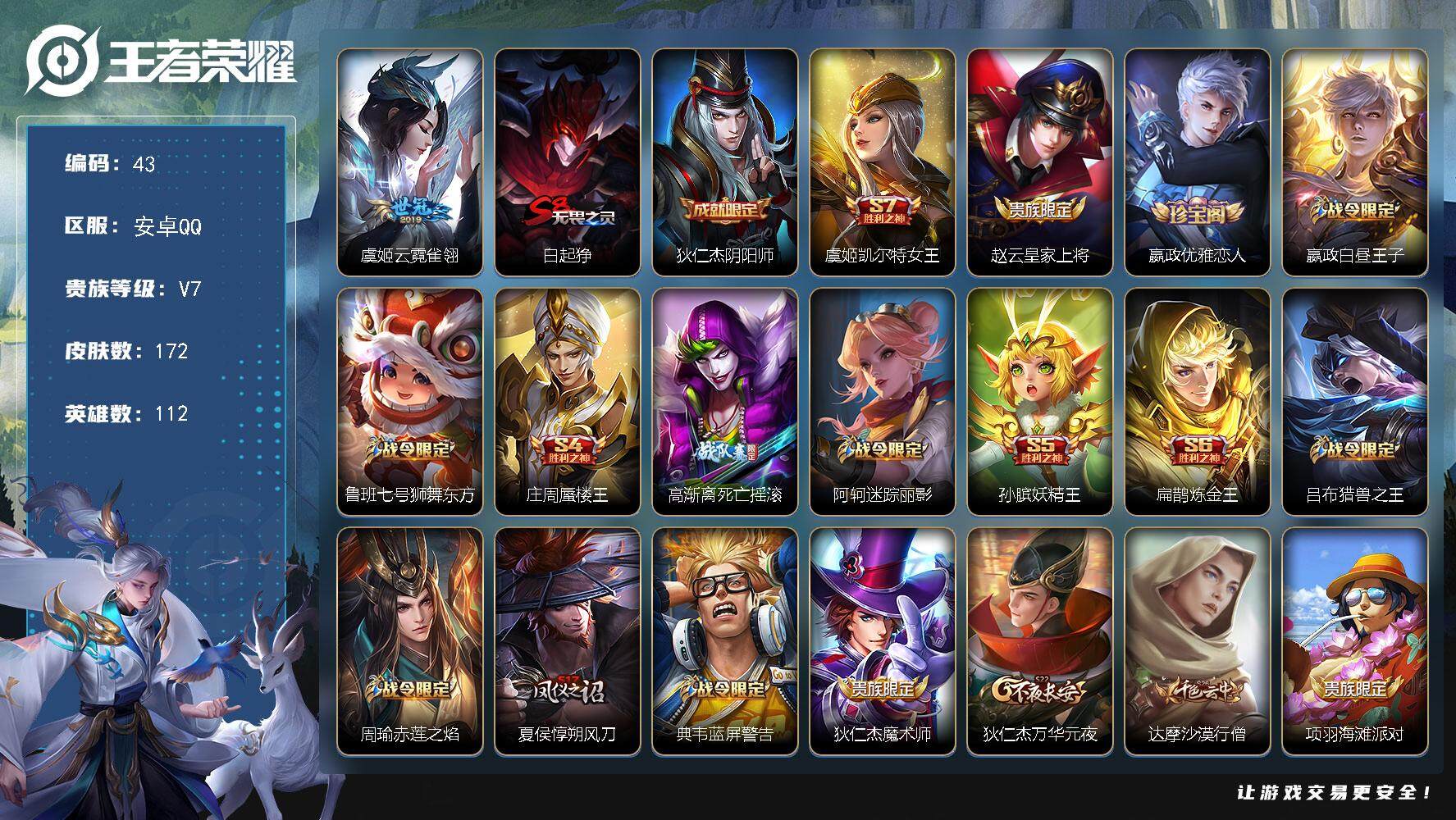 PX_2295133-Q-V7-至尊星耀III段位-112英雄-172皮肤-1传说-37史诗 【传说皮肤】:虞姬云霓雀翎 【限定皮肤】:白起狰,狄仁杰阴阳师,虞姬凯尔特女王,赵云皇家上将,嬴政优雅恋人,嬴政白昼王子,鲁班七号狮舞东方,庄周蜃楼王,高渐离死亡摇滚,阿轲迷踪丽影,孙膑妖精王,扁鹊炼金王,吕布猎兽之王,周瑜赤莲之焰,夏侯惇朔风刀,典韦蓝屏警告,狄仁杰魔术师,狄仁杰万华元夜,达摩沙漠行僧,项羽海滩派对,老夫子醍醐杖,程咬金演武夺筹,刘邦夺宝奇兵,兰陵王驯魔猎人,兰陵王金庭之子,花木兰瑞麟志,孙悟空至尊宝,牛魔御旌,李元芳银河之约,李元芳云中旅人,钟馗神迹守卫,钟馗驱傩正仪,女娲朔望之晖,干将莫邪冰霜恋舞曲,蔡文姬繁星吟游,鬼谷子原初探秘者,铠青龙志,弈星混沌棋,沈梦溪星空之诺,沈梦溪大漠名商,明世隐疑决卦,裴擒虎李小龙,狂铁御狮,米莱狄御霄,云中君纤云弄巧,盾山御銮,上官婉儿梁祝,桑启海盐诗旅 【年限皮肤】:花木兰瑞麟志,铠青龙志 【赛季限定】:庄周蜃楼王,孙膑妖精王,扁鹊炼金王,白起狰,夏侯惇朔风刀,狄仁杰万华元夜,达摩沙漠行僧,老夫子醍醐杖,程咬金演武夺筹,兰陵王金庭之子,牛魔御旌,李元芳云中旅人,虞姬凯尔特女王,钟馗驱傩正仪,鬼谷子原初探秘者,弈星混沌棋,沈梦溪大漠名商,明世隐疑决卦,狂铁御狮,米莱狄御霄,盾山御銮,桑启海盐诗旅 【战令限定】:嬴政白昼王子,鲁班七号狮舞东方,阿轲迷踪丽影,吕布猎兽之王,周瑜赤莲之焰,典韦蓝屏警告,刘邦夺宝奇兵,兰陵王驯魔猎人,李元芳银河之约,钟馗神迹守卫,女娲朔望之晖,沈梦溪星空之诺 【史诗皮肤】:鲁班七号电玩小子,露娜紫霞仙子,赵云皇家上将,赵云未来纪元,貂蝉圣诞恋歌,狄仁杰魔术师,宫本武藏鬼剑武藏,孙尚香水果甜心,嬴政优雅恋人,妲己魅力维加斯,墨子龙骑士,李白千年之狐,吕布末日机甲,韩信白龙吟,孙悟空至尊宝,夏侯惇乘风破浪,兰陵王暗隐猎兽者,诸葛亮黄金分割率,安琪拉心灵骇客,百里守约特工魅影,铠曙光守护者,李元芳逐浪之夏,阿轲节奏热浪,嬴政白昼王子,铠青龙志,干将莫邪冰霜恋舞曲,花木兰瑞麟志,典韦蓝屏警告,鲁班七号狮舞东方,狄仁杰鹰眼统帅,兰陵王驯魔猎人,上官婉儿梁祝,蔡文姬繁星吟游,李元芳银河之约,阿轲迷踪丽影,裴擒虎李小龙,云中君纤云弄巧 【其他皮肤】:项羽海滩派对,韩信教廷特使,韩信街头霸王,阿轲爱心护理,达摩大发明家,赵云