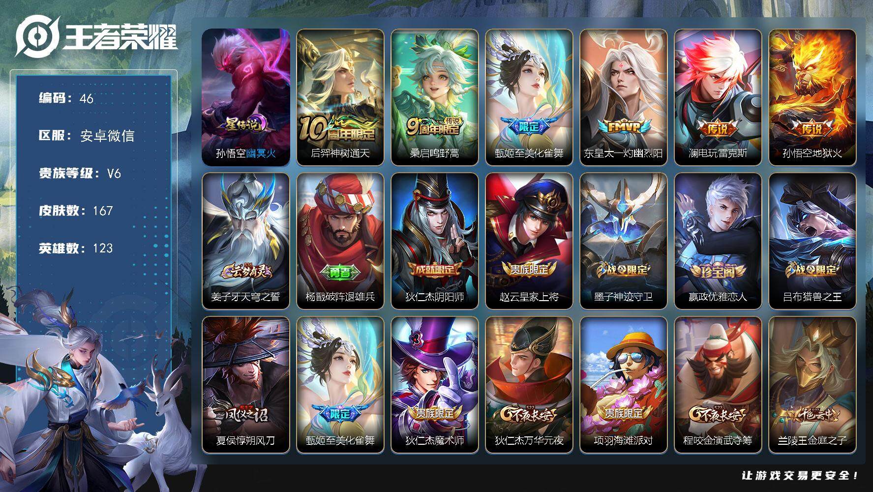 PX_2295059-WX-V6-至尊星耀V段位-中路12段,游走10段123英雄-167皮肤-1星元幽冥火-6传说-38史诗 【传说皮肤】:后羿神树通天,桑启鸣野蒿,甄姬至美化雀舞,东皇太一灼幽烈阳,澜电玩雷克斯,孙悟空地狱火 【限定皮肤】:姜子牙天穹之誓,杨戬破阵退雄兵,狄仁杰阴阳师,赵云皇家上将,墨子神迹守卫,嬴政优雅恋人,吕布猎兽之王,夏侯惇朔风刀,甄姬至美化雀舞,狄仁杰魔术师,狄仁杰万华元夜,项羽海滩派对,程咬金演武夺筹,兰陵王金庭之子,孙悟空孙行者,牛魔奔雷神使,李元芳云中旅人,杨玉环遇见飞天,鬼谷子原初探秘者,弈星混沌棋,沈梦溪大漠名商,明世隐疑决卦,裴擒虎擒涛扼浪,云中君纤云弄巧,嫦娥拒霜思,鲁班大师探海日志,桑启海盐诗旅,阿古朵江河有灵,张良古海寻踪,蒙犽百解令,高渐离燃音魔法,妲己灵卜魔法,鬼谷子天穹祈灯,大乔乘龙忆丹青,沈梦溪龙舞盛年,鲁班七号蔬乡物语,李元芳蔬乡物语,刘邦剑破天穹,周瑜熔金海岸 【年限皮肤】:牛魔奔雷神使,大乔乘龙忆丹青 【赛季限定】:夏侯惇朔风刀,狄仁杰万华元夜,程咬金演武夺筹,兰陵王金庭之子,张良古海寻踪,李元芳云中旅人,鬼谷子原初探秘者,弈星混沌棋,沈梦溪大漠名商,明世隐疑决卦,裴擒虎擒涛扼浪,鲁班大师探海日志,桑启海盐诗旅,鬼谷子天穹祈灯,刘邦剑破天穹,姜子牙天穹之誓 【战令限定】:墨子神迹守卫,吕布猎兽之王,高渐离燃音魔法,妲己灵卜魔法,鲁班七号蔬乡物语,李元芳蔬乡物语 【史诗皮肤】:赵云皇家上将,貂蝉圣诞恋歌,甄姬冰雪圆舞曲,狄仁杰魔术师,宫本武藏鬼剑武藏,孙尚香水果甜心,嬴政优雅恋人,嬴政暗夜贵公子,妲己魅力维加斯,墨子金属风暴,吕布圣诞狂欢,吕布末日机甲,张飞乱世虎臣,夏侯惇乘风破浪,亚瑟心灵战警,百里守约特工魅影,铠曙光守护者,蔡文姬舞动绿茵,李元芳逐浪之夏,程咬金功夫厨神,阿轲节奏热浪,杨玉环遇见飞天,狄仁杰鹰眼统帅,橘右京修罗,云中君纤云弄巧,牛魔奔雷神使,孙悟空孙行者,嫦娥拒霜思,阿古朵江河有灵,蒙犽百解令,妲己灵卜魔法,高渐离燃音魔法,大乔乘龙忆丹青,鲁班七号蔬乡物语,狂铁龙之律动,后羿石田雨龙,黄忠百相守梦,西施织梦人,女娲万灵启世 【其他皮肤】:项羽海滩派对,阿轲爱心护理,赵云白执事,芈月红桃皇后,武则天东方不败,宫本武藏未来纪元,安琪拉玩偶对对碰,孙膑天使之翼,妲己少女阿狸,典韦黄金武士,亚瑟死亡骑士,达摩拳王