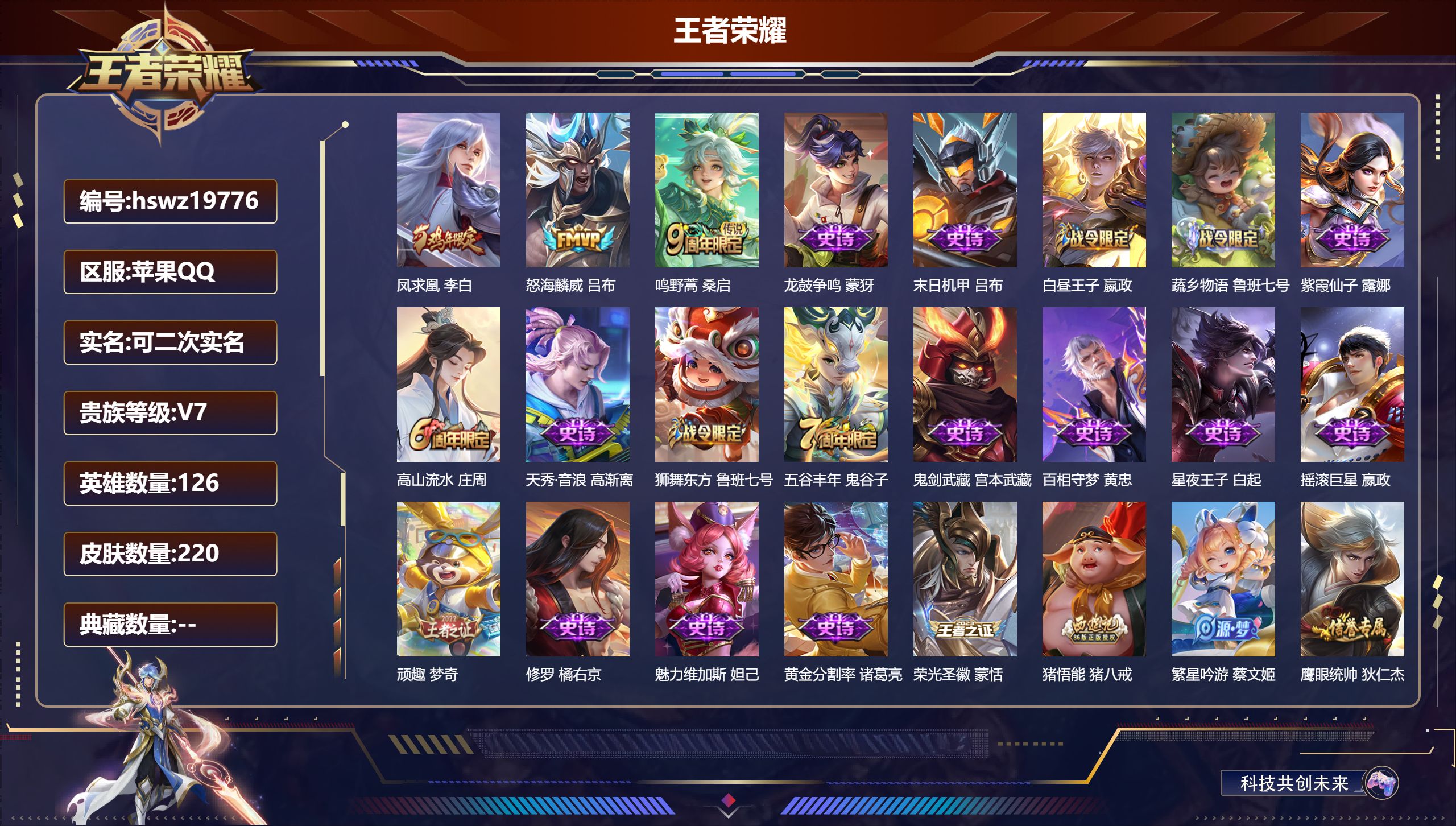 PX_2306751-Q/至尊星耀/220皮肤/126英雄/0典藏/0珍品无双/0无双/0珍品传说/3传说/57史诗/8稀有英雄 【3,传说皮肤】凤求凰,李白,怒海麟威,吕布,鸣野蒿,桑启, 【57,史诗皮肤】龙鼓争鸣,蒙犽,末日机甲,吕布,白昼王子,嬴政,蔬乡物语,鲁班七号,紫霞仙子,露娜,高山流水,庄周,天秀·音浪,高渐离,狮舞东方,鲁班七号,五谷丰年,鬼谷子,鬼剑武藏,宫本武藏,百相守梦,黄忠,星夜王子,白起,摇滚巨星,嬴政,顽趣,梦奇,修罗,橘右京,魅力维加斯,妲己,黄金分割率,诸葛亮,荣光圣徽,蒙恬,猪悟能,猪八戒,繁星吟游,蔡文姬,鹰眼统帅,狄仁杰,大圣娶亲,孙悟空,飞衡,韩信,驯魔猎人,兰陵王,金属风暴,墨子,特工魅影,百里守约,猫狗日记,孙策,原初追逐者,百里玄策,逐浪之夏,李元芳,未来纪元,赵云,黎明之约,雅典娜,魔术师,狄仁杰,龙之律动,狂铁,神威,马超,皇家上将,赵云,至尊宝,孙悟空,梁祝,上官婉儿,天才门将,刘禅,云间偶戏,元歌,涂山容容,公孙离,青焰无极,镜,魅语,不知火舞,茶境仙,孙膑,蔷薇恋人,孙尚香,冰雪圆舞曲,甄姬,千年之狐,李白,节奏热浪,阿轲,曙光守护者,铠,万灵启世,女娲,心灵骇客,安琪拉,箭羽风息,伽罗,绅士熊喵,刘禅,真爱魔法,干将莫邪,水果甜心,孙尚香,瑰影绮梦,芈月,乘风破浪,夏侯惇,暗隐猎兽者,兰陵王, 【105,勇者皮肤】圆桌骑士,盾山,沙漠行僧,达摩,大漠名商,沈梦溪,纽约教父,刘备,拳王,达摩,大发明家,达摩,丁香结,小乔,功夫炙烤,廉颇,沉稳之力,孙尚香,海盐诗旅,桑启,幻泉雾影,海月,朔风刀,夏侯惇,醍醐杖,老夫子,归虚梦演,孙膑,汉昭烈帝,刘备,白色死神,白起,黑桃队长,鲁班七号,黄金武士,典韦,御旌,牛魔,阴阳师,狄仁杰,次元突破,哪吒,古海寻踪,张良,功夫老勺,老夫子,西部大镖客,牛魔,鲨炮海盗猫,沈梦溪,海滩派对,项羽,万华元夜,狄仁杰,克喵,鬼谷子,踏浪烽翎,莱西奥,猎兽之王,吕布,野性能量,吕布,哥特玫瑰,露娜,守护之力,大乔,无双福将,程咬金,原初探秘者,鬼谷子,潮玩探月行,猪八戒,天穹祈灯,鬼谷子,疑决卦,明世隐,化身博士,扁鹊,潮玩骑士王,亚瑟,阿尔法小队,后羿,五福同心,张飞,幻乐之宴,鬼谷子,霸王丸,宫本武藏,虹云星官,明世隐,救世之瞳,扁鹊,赤莲之焰,周瑜,死亡骑士,亚瑟,敏锐之力,李白,危途狂花,戈娅,玩偶对对碰,安琪拉,掌控之力,诸葛亮,海滩丽影,钟无艳,圣弓游侠,后羿,忍·炎影,赵云,炽热元素使,姜子牙,坚韧之力,苏烈,唤灵魔甲,刘禅,万事如意,刘备,擒涛扼浪,裴擒虎,乓乓大师,鲁班大师,探海日志,鲁班大师,天使之翼,孙膑,雾都夜雨,干将莫邪,兔女郎,花木兰,龙腾万里,关羽,金庭之子,兰陵王,罗小黑战记,哪吒,千军破阵,苏烈,零食大作战,姬小满,荣光之誓,亚瑟,花好人间,甄姬,万象初新,宫本武藏,潮玩造梦师,刘备,御銮,盾山,秘密基地,刘禅,教廷特使,韩信,街头霸王,韩信,云中旅人,李元芳,妄想特派,李元芳,西部大镖客,孙悟空,蔬乡物语,李元芳,少女阿狸,妲己,混沌棋,弈星,御霄,米莱狄,驱傩正仪,钟馗,神迹守卫,钟馗,命运角斗场,狂铁,劲辣红锅,太乙真人,剑破天穹,刘邦,苍威无极,项羽,铁骨偃魂,典韦,苍林狼骑,苍,天穹之誓,姜子牙,访茗客,马超,星梦巡礼,姜子牙,谧流熔炉,太乙真人,群星魔术团,程咬金,暗都幽影,大司命,鹤鸣心笺,艾琳,云械蓝图,云中君,逆浪荇歌,甄姬,噬灭天穹,东皇太一,玫蓝誓约,戈娅,景韶洛都,明世隐, 【55,其他皮肤】伊势巫女,大乔,前尘,金蝉,圣殿之光,刘邦,芝加哥教父,黄忠,极冰防御线,盾山,龙域领主,铠,生化警戒,钟无艳,死神来了,曹操,超能战警,曹操,花见巫女,伽罗,爱与和平,苏烈,第七人偶,干将莫邪,灼热之刃,李信,熊喵少女,阿古朵,海之征途,孙策,木偶奇遇记,鲁班七号,帝国元帅,项羽,精灵王,后羿,绯红之刃,露娜,冰刃幻境,镜,魇语军师,司马懿,午夜歌剧院,元歌,启蛰,司空震,隐刃,兰陵王,花间舞,公孙离,异域舞娘,貂蝉,街头旋风,裴擒虎,归虚梦演,鲁班大师,剑舞者,花木兰,范海辛,李白,维京掠夺者,苍,归虚梦演,蒙犽,激情绿茵,马可波罗,埃及法老,杨戬,尼罗河女神,女娲,锦衣卫,狄仁杰,一千零一夜,张良,归虚梦演,曜,威尼斯狂欢,百里玄策,幸存者,马超,战争女神,雅典娜,创世神祝,盘古,特种部队,李元芳,绝影神枪,百里守约,森,瑶,孤猎,澜,加勒比小姐,虞姬,踏雪寻梅,弈星,秩序猎龙将,蒙恬,精准探案法,米莱狄,赤焰之缨,云缨,露花倒影,嫦娥,美梦成真,梦奇,天启骑士,关羽,西部大镖客,孙悟空, 【8,稀有英雄】嬴政,不知火舞,橘右京,夏洛特,娜可露露,韩信,艾琳,赵云, 营地ID:,