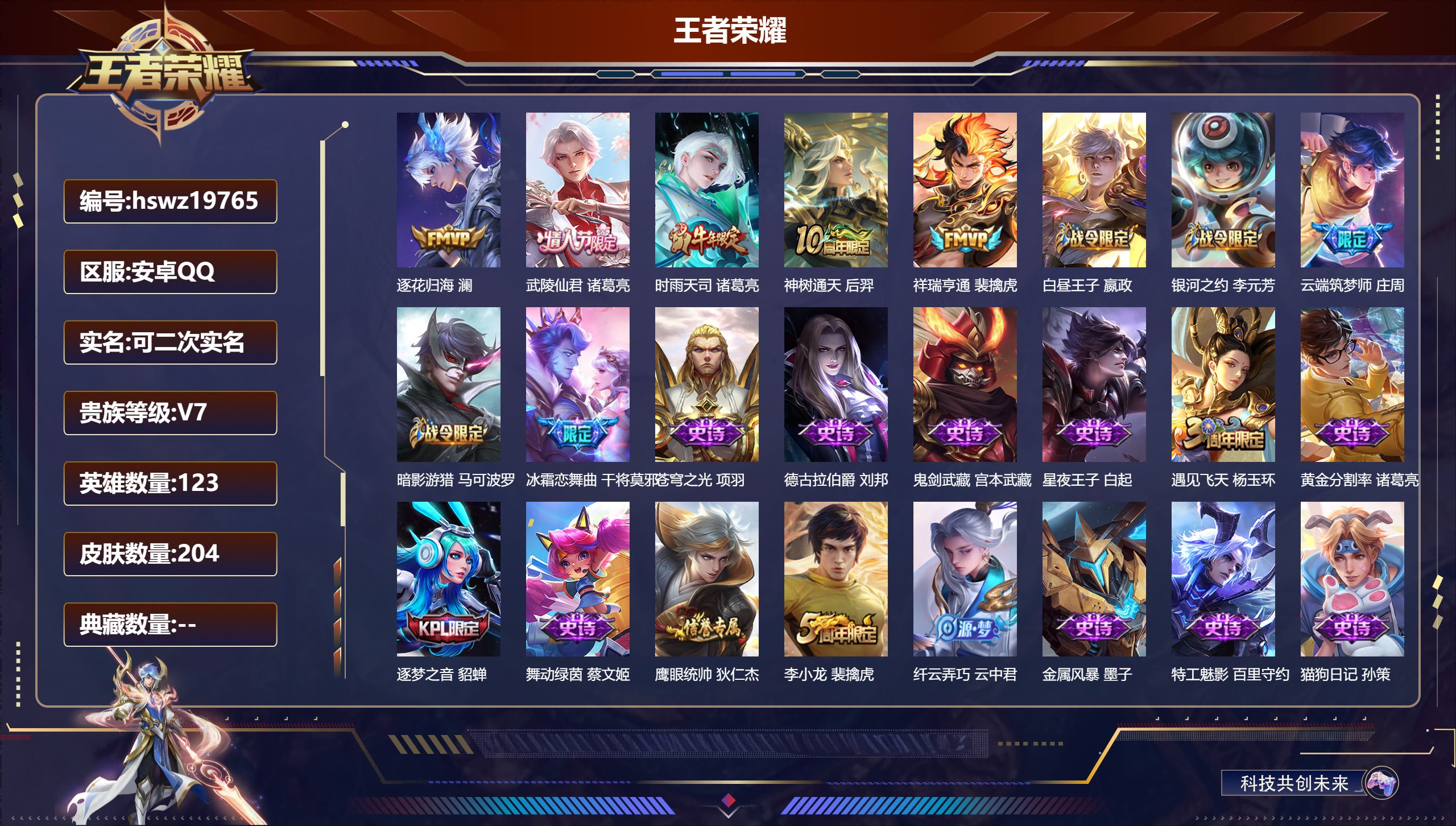 PX_2306749-Q/至尊星耀/204皮肤/123英雄/0典藏/0珍品无双/0无双/0珍品传说/5传说/46史诗/7稀有英雄 【5,传说皮肤】逐花归海,澜,武陵仙君,诸葛亮,时雨天司,诸葛亮,神树通天,后羿,祥瑞亨通,裴擒虎, 【46,史诗皮肤】白昼王子,嬴政,银河之约,李元芳,云端筑梦师,庄周,暗影游猎,马可波罗,冰霜恋舞曲,干将莫邪,苍穹之光,项羽,德古拉伯爵,刘邦,鬼剑武藏,宫本武藏,星夜王子,白起,遇见飞天,杨玉环,黄金分割率,诸葛亮,逐梦之音,貂蝉,舞动绿茵,蔡文姬,鹰眼统帅,狄仁杰,李小龙,裴擒虎,纤云弄巧,云中君,金属风暴,墨子,特工魅影,百里守约,猫狗日记,孙策,藏狐·褐绒,老夫子,雪豹·霜爪,百里守约,魔术师,狄仁杰,龙之律动,狂铁,皇家上将,赵云,冰冠公主,雅典娜,功夫厨神,程咬金,梁祝,上官婉儿,圣诞恋歌,貂蝉,云间偶戏,元歌,涂山容容,公孙离,御风骁将,吕布,魅语,不知火舞,茶境仙,孙膑,冰雪圆舞曲,甄姬,默契交锋,花木兰,千年之狐,李白,箭羽风息,伽罗,乱世虎臣,张飞,缤纷独角兽,小乔,水果甜心,孙尚香,狂想玩偶喵,蒙犽,化蝶舞,阿轲,江河有灵,阿古朵,幽灵船长,曹操,乘风破浪,夏侯惇,暗隐猎兽者,兰陵王, 【102,勇者皮肤】胡桃夹子,干将莫邪,圆桌骑士,盾山,烛龙,曹操,纽约教父,刘备,拳王,达摩,大发明家,达摩,功夫炙烤,廉颇,沉稳之力,孙尚香,爱与正义,程咬金,海盐诗旅,桑启,朔风刀,夏侯惇,醍醐杖,老夫子,归虚梦演,孙膑,汉昭烈帝,刘备,白色死神,白起,黑桃队长,鲁班七号,黄金武士,典韦,御旌,牛魔,阴阳师,狄仁杰,次元突破,哪吒,古海寻踪,张良,科学大爆炸,项羽,功夫老勺,老夫子,西部大镖客,牛魔,鲨炮海盗猫,沈梦溪,海滩派对,项羽,万华元夜,狄仁杰,克喵,鬼谷子,制霸全明星,牛魔,踏浪烽翎,莱西奥,演武夺筹,程咬金,猎兽之王,吕布,野性能量,吕布,哥特玫瑰,露娜,守护之力,大乔,无双福将,程咬金,原初探秘者,鬼谷子,星空之诺,沈梦溪,潮玩探月行,猪八戒,天穹祈灯,鬼谷子,疑决卦,明世隐,化身博士,扁鹊,潮玩骑士王,亚瑟,阿尔法小队,后羿,次元傲视,杨戬,幻乐之宴,鬼谷子,霸王丸,宫本武藏,虹云星官,明世隐,救世之瞳,扁鹊,浪漫序章,刘备,敏锐之力,李白,破局者,亚连,玩偶对对碰,安琪拉,海滩丽影,钟无艳,忍·炎影,赵云,重明,芈月,坚韧之力,苏烈,万事如意,刘备,擒涛扼浪,裴擒虎,乓乓大师,鲁班大师,死亡摇滚,高渐离,探海日志,鲁班大师,兔女郎,花木兰,龙腾万里,关羽,花好人间,甄姬,万象初新,宫本武藏,聚星闪耀,钟无艳,御銮,盾山,单词大作战,雅典娜,秘密基地,刘禅,穷奇,典韦,教廷特使,韩信,云中旅人,李元芳,妄想特派,李元芳,西部大镖客,孙悟空,进击墨子号,墨子,少女阿狸,妲己,混沌棋,弈星,御霄,米莱狄,春野闲踪,苏烈,布丁狗之约,阿古朵,命运加冕,露娜,小满鸭,姬小满,幻想奇妙夜,王昭君,灵野札记,张良,驱傩正仪,钟馗,虚灵犬护,钟馗,御狮,狂铁,劲辣红锅,太乙真人,剑破天穹,刘邦,铁骨偃魂,典韦,熔金海岸,周瑜,苍林狼骑,苍,天穹之誓,姜子牙,访茗客,马超,星梦巡礼,姜子牙,谧流熔炉,太乙真人,暗都幽影,大司命,鹤鸣心笺,艾琳,逆浪荇歌,甄姬,玫蓝誓约,戈娅,景韶洛都,明世隐, 【51,其他皮肤】金属狂潮,高渐离,战争骑士,夏侯惇,潮流仙人,老夫子,三太子,哪吒,棒球奇才,沈梦溪,极冰防御线,盾山,龙域领主,铠,生化警戒,钟无艳,花见巫女,伽罗,爱与和平,苏烈,未来旅行,孙膑,第七人偶,干将莫邪,万圣前夜,小乔,灼热之刃,李信,海之征途,孙策,木偶奇遇记,鲁班七号,绯红之刃,露娜,星航指挥官,诸葛亮,魇语军师,司马懿,英喵野望,刘禅,午夜歌剧院,元歌,启蛰,司空震,隐刃,兰陵王,霓裳曲,杨玉环,花间舞,公孙离,异域舞娘,貂蝉,街头旋风,裴擒虎,归虚梦演,鲁班大师,东海龙王,东皇太一,范海辛,李白,占星师,明世隐,激情绿茵,马可波罗,阿摩司公爵,鬼谷子,年年有余,猪八戒,尼罗河女神,女娲,归虚梦演,曜,幸存者,马超,战争女神,雅典娜,荷鲁斯之眼,云中君,创世神祝,盘古,特种部队,李元芳,绝影神枪,百里守约,森,瑶,孤猎,澜,踏雪寻梅,弈星,精准探案法,米莱狄,精灵公主,王昭君,赤焰之缨,云缨,露花倒影,嫦娥,地府判官,钟馗,西部大镖客,孙悟空, 【7,稀有英雄】不知火舞,橘右京,夏洛特,娜可露露,韩信,艾琳,赵云, 营地ID:,