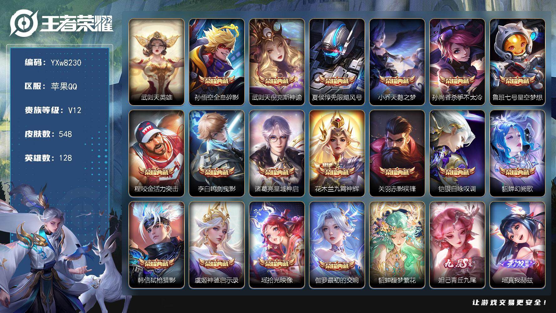PX_2307854-??主推·V12·在榜5个月·43W流光积分·全国排名281名·差芈月满典藏·9无双·6珍品·107传说·馥梦繁花·全皮瑶·紫瑶·全皮小乔·全皮西施·准全皮貂蝉·1.1W金标少司缘·准万战金标蔡文姬·蛇年全限定·龙年全限定·虎年全限定·可二次】YXw8230-苹果Q-128英雄-548皮肤-3王者印记-210铭文-贵族积分72w【荣耀贵族12】【18典藏·1珍品无双·9无双·6珍品·10星传说·107传说·11天幕·62按键·260个性戳戳·273幸运值】【因赛季更新游戏段付以上号为准!】 【英雄全皮】:小乔全皮,刘禅全皮,宫本武藏全皮,达摩全皮,司马懿全皮,露娜全皮,孙权全皮,朵莉亚全皮,娜可露露全皮,苍全皮,黄忠全皮,瑶全皮,伽罗全皮,孙策全皮,大司命全皮,马超全皮,西施全皮,澜全皮,镜全皮,桑启全皮,夏洛特全皮,司空震全皮,云缨全皮,赵怀真全皮,莱西奥全皮,戈娅全皮,空空儿全皮,影全皮,姬小满全皮,少司缘全皮 【荣耀典藏】:武则天英雄,孙悟空全息碎影,武则天倪克斯神谕,夏侯惇无限飓风号,小乔天鹅之梦,孙尚香杀手不太冷,鲁班七号星空梦想,程咬金活力突击,李白鸣剑曳影,诸葛亮星域神启,花木兰九霄神辉,关羽赤影疾锋,铠银白咏叹调,貂蝉幻阙歌,韩信弑枪猎影,虞姬神鉴启示录,瑶拾光映像,伽罗最初的交响 【珍品无双】:貂蝉馥梦繁花 【无双皮肤】:妲己青丘九尾,瑶真我赫兹,李白碎月剑心,小乔时之魔女,韩信群星魔术团,甄姬雪境奇遇,曜器灵螭龙剑,诸葛亮天机白泽,铠神罪 【珍品传说】:孙策时之奇旅,嫦娥器灵落星盏,瑶大耳狗之梦,安琪拉酷洛米之心,暃朽木白哉,宫本武藏黑崎一护 【星元皮肤】:诸葛亮岁雨灵司,诸葛亮苍灵仙君,镜破晓神光,貂蝉幻舞叠翠,瑶时之愿境,孙尚香未来机甲,武则天幻海之心,宫本武藏幽冥之眼,貂蝉金色仲夏夜,鲁班七号寅虎焰心 【天幕】:繁花交响诗天幕,箭叩九天天幕,不羡仙天幕,天机无算天幕,狸尾假日天幕,财神纳福天幕,铃舟系梦天幕,电音狂想天幕,金虎啸春天幕,秋月华灯天幕,荣耀贵族天幕 【小兵皮肤】:小兵青铜锵锵兵 【传说皮肤】:杨戬纵目迁山,后羿神树通天,曹操万灵伏威,干将莫邪千山共赴,元歌诡秘之主,大司命死亡执政官,司马懿九山相柳,公孙离云诺千山,西施续相思,杨玉环星之鸣奏,后羿千劫归真,司空震愿照山河定,女娲愿照千秋盛,妲己愿照众生和,澜愿照九州拓,蔡文姬愿照福禄聚,虞姬愿照岁时盈,云缨幻光神枪,裴擒虎祥瑞亨通,嬴政玄雷天君,桑启鸣野蒿,庄周牧神诗旅,夏侯惇霜北刀,朵莉亚心动手记,云中君群星魔术团,亚连落雪白狼,吕布曦玄引,貂蝉曦玄引,典韦战鼓燎原,孙尚香乘龙问璇玑,孙策乘龙淬吴钩,赵云乘龙铭钟鼎,马超琥珀纪元,铠琥珀纪元,澜逐花归海,艾琳觅芳踪,露娜霜月吟,孙膑小动物乐团,狄仁杰夜礼服假面,王昭君永恒水手月亮,甄姬至美化雀舞,大乔时之奇旅,鲁班七号时之奇旅,兰陵王影龙天霄,宫本武藏惊梅引,云缨鹤归松栖,上官婉儿妄想奇谈,东皇太一灼幽烈阳,澜电玩雷克斯,张飞百相守梦,公孙离记忆之芯,夏洛特浮生妄,干将莫邪画中仙,花木兰燃星之曲,虞姬无限倾心,伽罗炽翼辉光,小乔山海琳琅生,吕布怒海麟威,李白诗剑行,不知火舞绯月行,百里守约碎云,娜可露露前尘镜,孙尚香音你闪耀,马可波罗深海之息,马超无双飞将,大乔挚爱花嫁,孙策挚爱之约,露娜启示之音,蔡文姬花朝如约,女娲补天,孙策末日机甲,瑶时之祈愿,裴擒虎寅虎赤拳,鲁班七号寅虎瑞焰,孙尚香异界灵契,貂蝉遇见胡旋,赵云淬星耀世,王昭君乞巧织情,西施游龙清影,周瑜音你心动,小乔音你心动,李元芳飞鸢探春,公孙离祈雪灵祝,诸葛亮时雨天司,铠绛天战甲,镜炽阳神光,虞姬启明星使,曜云鹰飞将,李信一念神魔,刘备时之恋人,伽罗太华,貂蝉猫影幻舞,张良黄金白羊座,干将莫邪久胜战神,虞姬云霓雀翎,达摩黄金狮子座,花木兰冠军飞将,梦奇胖达荣荣,后羿黄金射手座,杨戬永曜之星,诸葛亮武陵仙君,貂蝉仲夏夜之梦,孙尚香末日机甲,宫本武藏地狱之眼,孙悟空地狱火,武则天海洋之心,狄仁杰超时空战士 【限定皮肤】:夏侯惇霜北刀,蔡文姬夏日便利店,虞姬夏日便利店,狄仁杰阴阳师,小乔纯白花嫁,廉颇寅虎御盾,小乔山海琳琅生,赵云皇家上将,赵云引擎之心,赵云百木心枪,墨子神迹守卫,墨子降魔,妲己时之奇旅,嬴政白昼王子,孙尚香异界灵契,鲁班七号寅虎瑞焰,鲁班七号时之奇旅,庄周玄嵩,庄周高山流水,高渐离玩趣恶龙,孙膑天狼运算者,孙膑寅虎展翼,白起夜都怪侠,芈月白晶晶,芈月幻夜卜梦,吕布御风骁将,周瑜真爱至上,元歌云间偶戏,夏侯惇匿光决锋者,甄姬至美化雀舞,马可波罗深海之息,马可波罗山海玄木吟,狄仁杰魔术师,狄仁杰万华元夜,达摩星际陆战队,达摩沙漠行僧,项羽海滩派对,老夫子航海奇遇记,关羽百相守梦,貂蝉逐梦之音,貂蝉遇见胡旋,程咬金演武夺筹,露娜一生所爱,露娜启示之音,韩信傲雪梅枪,兰陵王影龙天霄,兰陵王金庭之子,花木兰燃星之曲,不知火舞绯月行,娜可露露前尘镜,孙悟空至尊宝,孙悟空大圣娶亲,孙悟空孙行者,后羿辉光之辰,后羿如梦令,后羿圣弓游侠,刘备百相守梦,张飞百相守梦,李元芳云中旅人,虞姬霸王别姬,虞姬启明星使,虞姬无限倾心,钟馗驱傩正仪,杨玉环寅虎心曲,杨戬永曜之星,女娲补天,干将莫邪冰霜恋舞曲,干将莫邪真爱魔法,干将莫邪画中仙,蔡文姬奇迹圣诞,鬼谷子五谷丰年,诸葛亮武陵仙君,诸葛亮时雨天司,大乔白鹤