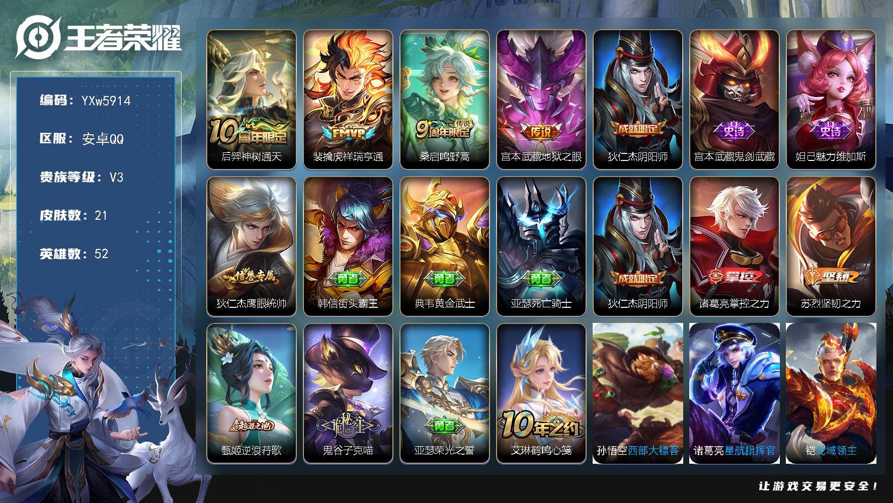 PX_2266892-??推荐33传说精品号·10年限皮肤·李信全皮·司空震全皮·妲己青丘九尾·曜器灵螭龙剑·九霄神辉·愿照九州拓·愿照岁时盈·黄金天蝎座·曦玄引·乘龙问璇玑·乘龙淬吴钩·乘龙铭钟鼎·霜月吟·影龙天霄·画中仙·诗剑行·山海苍雷引·挚爱之约·神威·凤求凰·可二次】YXw5919-安卓Q-127英雄-300皮肤-6王者印记-300铭文-贵族积分9w【贵族8】【1典藏·2无双·2星传说·33传说·1天幕·50按键】【因赛季更新游戏段付以上号为准!】 【英雄全皮】:钟馗全皮,李信全皮,司空震全皮 【荣耀典藏】:花木兰九霄神辉 【无双皮肤】:妲己青丘九尾,曜器灵螭龙剑 【星元皮肤】:孙悟空零号雷霆,孙尚香未来机甲 【天幕】:共赏芳华天幕 【传说皮肤】:后羿神树通天,司空震愿照山河定,澜愿照九州拓,虞姬愿照岁时盈,桑启鸣野蒿,墨子黄金天蝎座,吕布曦玄引,孙尚香乘龙问璇玑,孙策乘龙淬吴钩,赵云乘龙铭钟鼎,澜逐花归海,露娜霜月吟,兰陵王影龙天霄,干将莫邪画中仙,伽罗炽翼辉光,孙悟空齐天大圣,曜山海苍雷引,李信山海炽霜斩,李白诗剑行,百里守约碎云,马可波罗深海之息,马超无双飞将,孙策挚爱之约,铠绛天战甲,镜炽阳神光,虞姬启明星使,孙悟空零号赤焰,曜云鹰飞将,李信一念神魔,刘备时之恋人,李白凤求凰,孙尚香末日机甲,宫本武藏地狱之眼 【限定皮肤】:姜子牙天穹之誓,杨戬破阵退雄兵,狄仁杰阴阳师,赵云皇家上将,孙尚香蔷薇恋人,庄周高山流水,吕布猎兽之王,元歌无心,夏侯惇朔风刀,典韦蓝屏警告,马可波罗深海之息,马可波罗山海玄木吟,狄仁杰魔术师,狄仁杰万华元夜,达摩沙漠行僧,项羽海滩派对,老夫子醍醐杖,关羽冰锋战神,程咬金演武夺筹,韩信逐梦之影,韩信傲雪梅枪,兰陵王影龙天霄,兰陵王金庭之子,孙悟空大圣娶亲,孙悟空零号赤焰,孙悟空孙行者,孙悟空齐天大圣,后羿如梦令,李元芳银河之约,李元芳云中旅人,虞姬启明星使,钟馗神迹守卫,钟馗驱傩正仪,杨玉环遇见飞天,干将莫邪胡桃夹子,干将莫邪画中仙,鬼谷子原初探秘者,鬼谷子五谷丰年,百里玄策原初追逐者,百里守约朱雀志,公孙离玉兔公主,沈梦溪大漠名商,明世隐疑决卦,裴擒虎李小龙,裴擒虎擒涛扼浪,云中君纤云弄巧,李信山海炽霜斩,伽罗天狼溯光者,伽罗炽翼辉光,孙策挚爱之约,上官婉儿梁祝,嫦娥拒霜思,嫦娥暖冬兔眠,曜山海苍雷引,西施玲珑珍味,鲁班大师探海日志,桑启海盐诗旅,暃星界游侠,戈娅驭风魔法,艾琳流音漫舞,司空震地狱燃心,阿古朵江河有灵,张良古海寻踪,蒙犽百解令,高渐离燃音魔法,妲己灵卜魔法,鬼谷子天穹祈灯,孙尚香乘龙问璇玑,孙策乘龙淬吴钩,赵云乘龙铭钟鼎,吕布曦玄引,沈梦溪龙舞盛年,鲁班七号蔬乡物语,李元芳蔬乡物语,刘邦剑破天穹,程咬金群星魔术团,镜青焰无极,项羽苍威无极,芈月浮光幕影,周瑜熔金海岸 【年限皮肤】:百里守约朱雀志,李白凤求凰,马超神威,马可波罗山海玄木吟,李信山海炽霜斩,曜山海苍雷引,伽罗炽翼辉光,孙尚香乘龙问璇玑,孙策乘龙淬吴钩,赵云乘龙铭钟鼎 【赛季限定】:夏侯惇朔风刀,狄仁杰万华元夜,达摩沙漠行僧,老夫子醍醐杖,程咬金演武夺筹,兰陵王金庭之子,张良古海寻踪,李元芳云中旅人,钟馗驱傩正仪,鬼谷子原初探秘者,百里玄策原初追逐者,沈梦溪大漠名商,明世隐疑决卦,裴擒虎擒涛扼浪,鲁班大师探海日志,桑启海盐诗旅,鬼谷子天穹祈灯,刘邦剑破天穹,姜子牙天穹之誓 【战令限定】:吕布猎兽之王,典韦蓝屏警告,艾琳流音漫舞,李元芳银河之约,钟馗神迹守卫,嫦娥暖冬兔眠,西施玲珑珍味,司空震地狱燃心,暃星界游侠,戈娅驭风魔法,高渐离燃音魔法,妲己灵卜魔法,鲁班七号蔬乡物语,李元芳蔬乡物语,镜青焰无极,项羽苍威无极 【史诗皮肤】:鲁班七号电玩小子,阿轲暗夜猫娘,赵云皇家上将,赵云未来纪元,貂蝉圣诞恋歌,甄姬冰雪圆舞曲,狄仁杰魔术师,廉颇地狱岩魂,宫本武藏鬼剑武藏,孙尚香蔷薇恋人,孙尚香水果甜心,嬴政摇滚巨星,妲己魅力维加斯,妲己女仆咖啡,墨子龙骑士,墨子金属风暴,吕布圣诞狂欢,刘禅绅士熊喵,曹操幽灵船长,李白千年之狐,吕布末日机甲,张飞乱世虎臣,关羽冰锋战神,花木兰水晶猎龙者,刘邦德古拉伯爵,韩信逐梦之影,夏侯惇乘风破浪,小乔缤纷独角兽,兰陵王暗隐猎兽者,诸葛亮黄金分割率,亚瑟心灵战警,雅典娜冰冠公主,安琪拉心灵骇客,百里守约特工魅影,铠曙光守护者,李元芳逐浪之夏,程咬金功夫厨神,白起星夜王子,杨玉环遇见飞天,孙策猫狗日记,百里守约朱雀志,孙悟空大圣娶亲,典韦蓝屏警告,狄仁杰鹰眼统帅,上官婉儿梁祝,李元芳银河之约,娜可露露晚萤,后羿如梦令,不知火舞魅语,橘右京修罗,马超神威,孙尚香时之恋人,百里玄策原初追逐者,裴擒虎李小龙,云中君纤云弄巧,百里玄策热力回旋,伽罗天狼溯光者,钟馗乐园奇幻夜,孙悟空孙行者,庄周高山流水,司马懿暗渊魔法,嫦娥拒霜思,韩信傲雪梅枪,公孙离玉兔公主,澜赏金猎手,貂蝉唤灵魅影,鬼谷子五谷丰年,元歌无心,暃星界游侠,马可波罗山海玄木吟,戈娅驭风魔法,司空震地狱燃心,阿古朵江河有灵,蒙犽百解令,周瑜雪夜绮愿,妲己灵卜魔法,高渐离燃音魔法,鲁班七号蔬乡物语,镜青焰无极,黄忠怒海争锋,芈月浮光幕影,大司命东方月初,亚连破空之剑,马可波罗星界特工,弈星万物之道,赵怀真器灵浮梦炉,阿轲化蝶舞,狂铁龙之律动,周瑜百相守梦,公孙离涂山容容,女娲