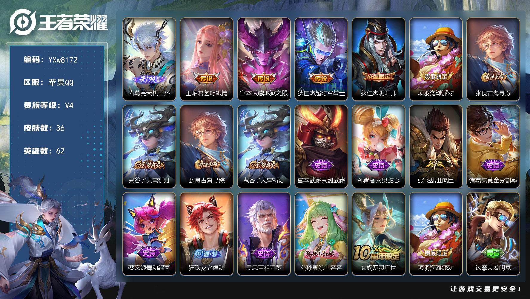 PX_2307415-??小号·天机白泽·乞巧织情·地狱之眼·超时空战士·可二次】YXw8172-苹果Q-62英雄-36皮肤-2王者印记-30铭文-贵族积分0w【贵族4】【·1无双·3传说·1按键】【因赛季更新游戏段付以上号为准!】 【无双皮肤】:诸葛亮天机白泽 【传说皮肤】:王昭君乞巧织情,宫本武藏地狱之眼,狄仁杰超时空战士 【限定皮肤】:狄仁杰阴阳师,项羽海滩派对,张良古海寻踪,鬼谷子天穹祈灯 【赛季限定】:张良古海寻踪,鬼谷子天穹祈灯 【史诗皮肤】:宫本武藏鬼剑武藏,孙尚香水果甜心,张飞乱世虎臣,诸葛亮黄金分割率,蔡文姬舞动绿茵,狂铁龙之律动,黄忠百相守梦,公孙离涂山容容,女娲万灵启世 【其他皮肤】:项羽海滩派对,达摩大发明家,芈月红桃皇后,花木兰兔女郎,狄仁杰阴阳师,吕布野性能量,典韦铁甲之心,张良古海寻踪,鬼谷子天穹祈灯,海诺时空谍影,甄姬逆浪荇歌,莱西奥踏浪烽翎,鬼谷子克喵,亚瑟荣光之誓,艾琳鹤鸣心笺,孙悟空西部大镖客,兰陵王隐刃,杨戬埃及法老,百里玄策威尼斯狂欢,米莱狄精准探案法,盘古创世神祝,马超幸存者,云缨赤焰之缨