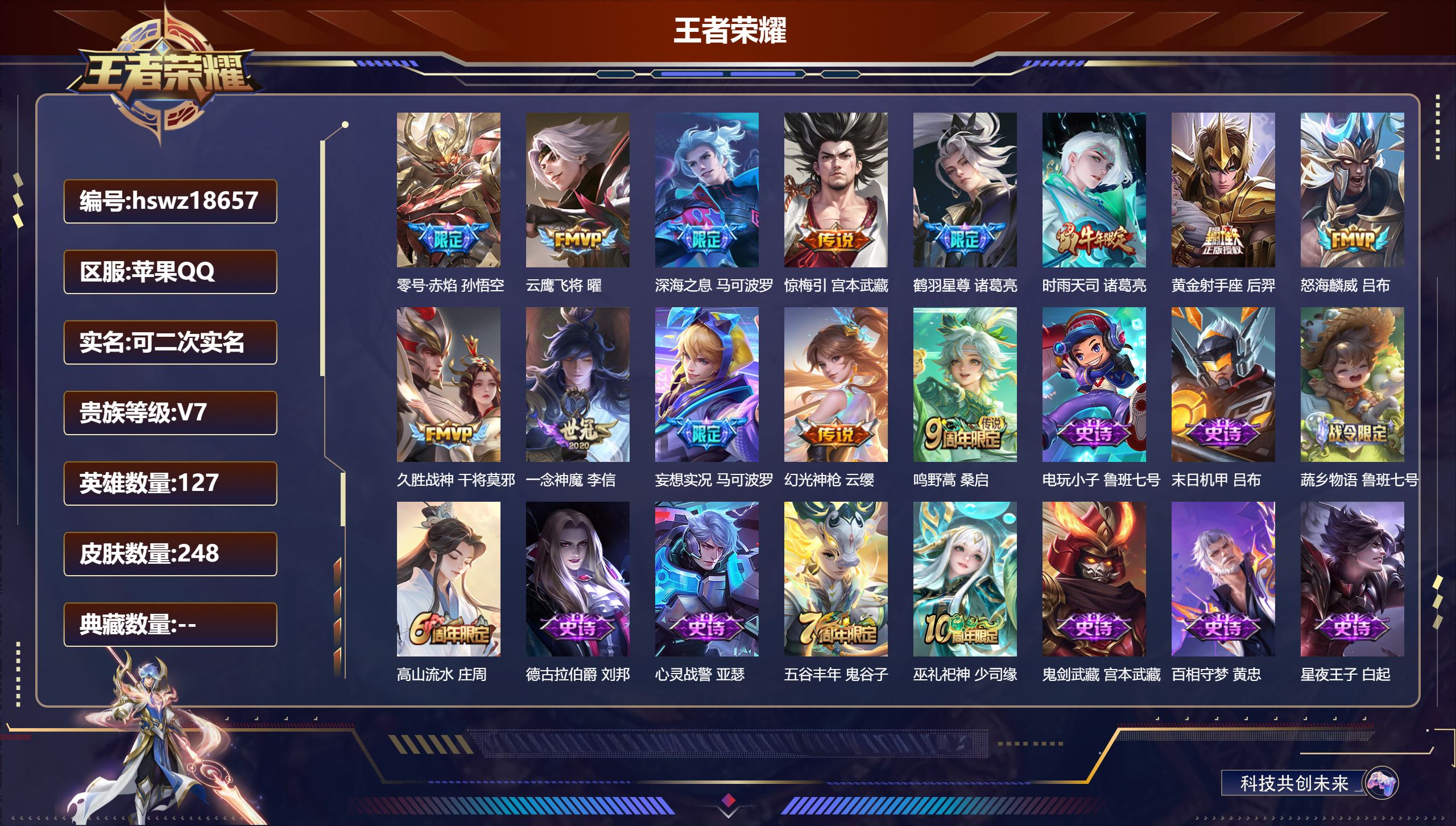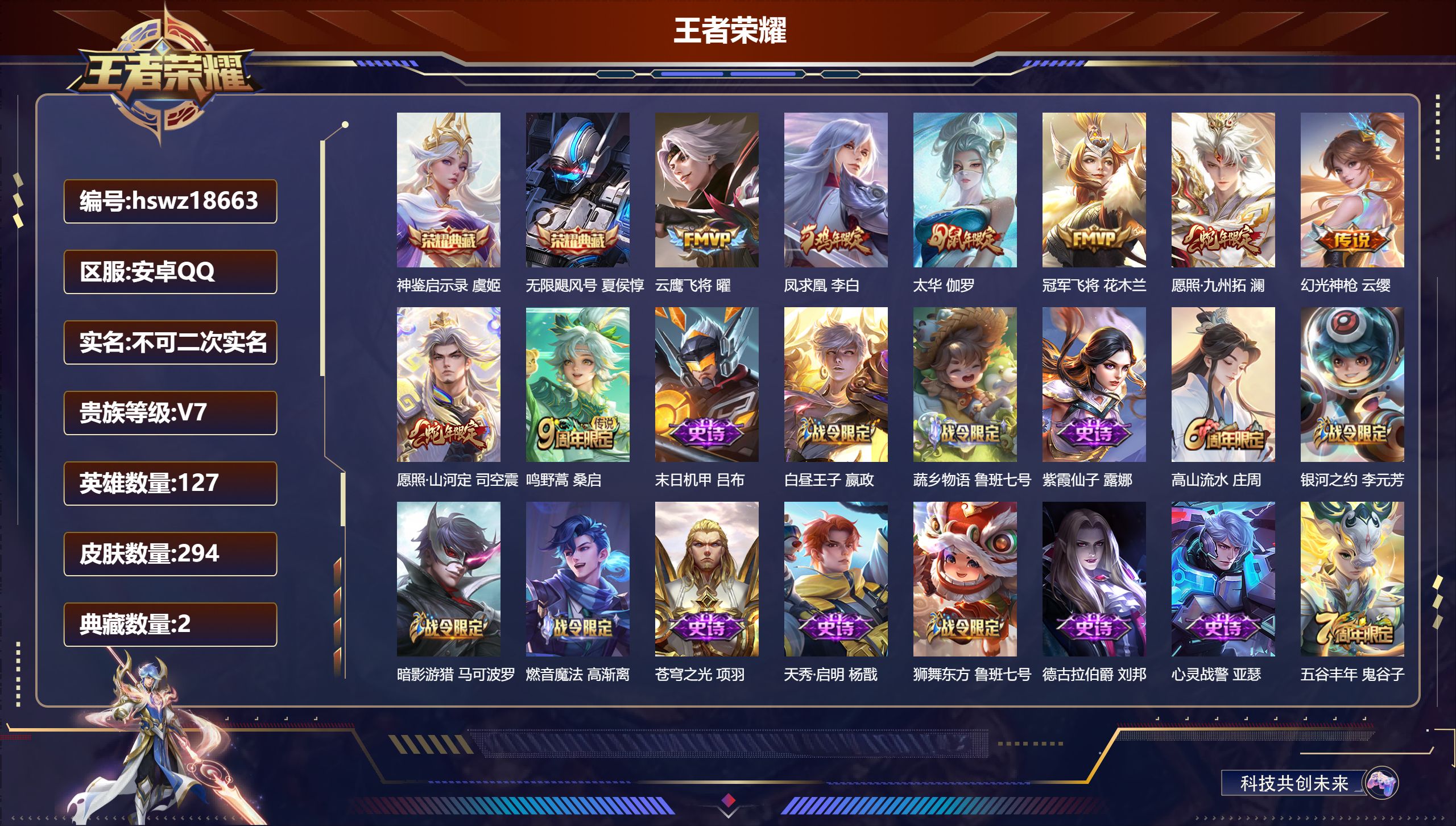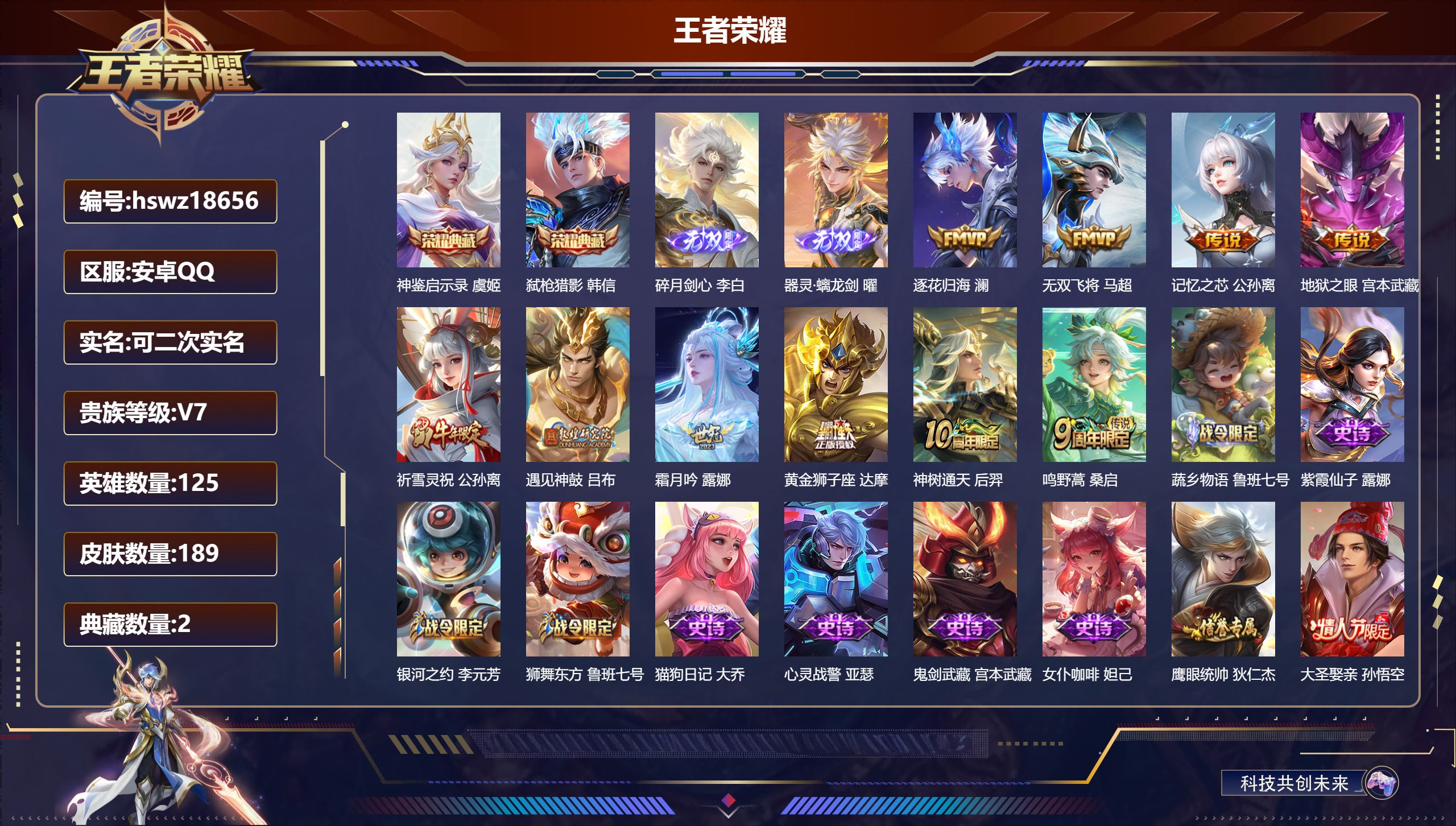 PX_2279243-Q/至尊星耀/189皮肤/125英雄/2典藏/0珍品无双/2无双/0珍品传说/10传说/47史诗/7稀有英雄 【2,典藏皮肤】神鉴启示录,虞姬,弑枪猎影,韩信, 【2,无双皮肤】碎月剑心,李白,器灵·螭龙剑,曜, 【10,传说皮肤】逐花归海,澜,无双飞将,马超,记忆之芯,公孙离,地狱之眼,宫本武藏,祈雪灵祝,公孙离,遇见神鼓,吕布,霜月吟,露娜,黄金狮子座,达摩,神树通天,后羿,鸣野蒿,桑启, 【47,史诗皮肤】蔬乡物语,鲁班七号,紫霞仙子,露娜,银河之约,李元芳,狮舞东方,鲁班七号,猫狗日记,大乔,心灵战警,亚瑟,鬼剑武藏,宫本武藏,女仆咖啡,妲己,鹰眼统帅,狄仁杰,大圣娶亲,孙悟空,飞衡,韩信,特工魅影,百里守约,原初追逐者,百里玄策,逐浪之夏,李元芳,未来纪元,赵云,雪豹·霜爪,百里守约,魔术师,狄仁杰,顽岩魄,蒙犽,皇家上将,赵云,冰冠公主,雅典娜,至尊宝,孙悟空,功夫厨神,程咬金,梁祝,上官婉儿,圣诞恋歌,貂蝉,云间偶戏,元歌,水晶猎龙者,花木兰,涂山容容,公孙离,破空之剑,亚连,青焰无极,镜,器灵·浮梦炉,赵怀真,夏日便利店,蔡文姬,茶境仙,孙膑,蔷薇恋人,孙尚香,冰雪圆舞曲,甄姬,千年之狐,李白,节奏热浪,阿轲,曙光守护者,铠,心灵骇客,安琪拉,百相守梦,周瑜,谪仙醉月,李白,星界特工,马可波罗,缤纷独角兽,小乔,百相守梦,百里守约,蓝屏警告,典韦,时之恋人,孙尚香,水果甜心,孙尚香,暗隐猎兽者,兰陵王, 【91,勇者皮肤】玲珑珍味,西施,圆桌骑士,盾山,爱心护理,阿轲,缤纷绘卷,张良,大发明家,达摩,龙舞盛年,沈梦溪,丁香结,小乔,醍醐杖,老夫子,白色死神,白起,黑桃队长,鲁班七号,黄金武士,典韦,御旌,牛魔,阴阳师,狄仁杰,戏梦巡演,空空儿,西部大镖客,牛魔,鲨炮海盗猫,沈梦溪,海滩派对,项羽,万华元夜,狄仁杰,克喵,鬼谷子,踏浪烽翎,莱西奥,演武夺筹,程咬金,原初探秘者,鬼谷子,潮玩探月行,猪八戒,疑决卦,明世隐,虹云星官,明世隐,死亡骑士,亚瑟,浪漫序章,刘备,敏锐之力,李白,玩偶对对碰,安琪拉,掌控之力,诸葛亮,海滩丽影,钟无艳,忍·炎影,赵云,雪境奇遇,西施,坚韧之力,苏烈,乓乓大师,鲁班大师,兔女郎,花木兰,龙腾万里,关羽,金庭之子,兰陵王,罗小黑战记,哪吒,千军破阵,苏烈,荣光之誓,亚瑟,花好人间,甄姬,万象初新,宫本武藏,御銮,盾山,秘密基地,刘禅,穷奇,典韦,教廷特使,韩信,街头霸王,韩信,西部大镖客,孙悟空,紫罗兰之誓,妲己,蔬乡物语,李元芳,混沌棋,弈星,御霄,米莱狄,蔚蓝守将,蒙恬,春野闲踪,苏烈,布丁狗之约,阿古朵,命运加冕,露娜,小满鸭,姬小满,幻想奇妙夜,王昭君,灵野札记,张良,驱傩正仪,钟馗,命运角斗场,狂铁,虚灵犬护,钟馗,御狮,狂铁,白执事,赵云,神迹守卫,孙悟空,剑破天穹,刘邦,异域游侠,刘备,苍威无极,项羽,铁骨偃魂,典韦,熔金海岸,周瑜,天穹之誓,姜子牙,长夏之忆,貂蝉,访茗客,马超,星梦巡礼,姜子牙,破阵·退雄兵,杨戬,谧流熔炉,太乙真人,群星魔术团,程咬金,暗都幽影,大司命,夏日便利店,虞姬,鹤鸣心笺,艾琳,锦麟游梦,庄周,逆浪荇歌,甄姬,百相守梦,孙策,百相守梦,老夫子,噬灭天穹,东皇太一,灵卦秘语,少司缘,动物派对,亚瑟,敬我三分,盘古,玫蓝誓约,戈娅,景韶洛都,明世隐, 【38,其他皮肤】伊势巫女,大乔,前尘,金蝉,战争骑士,夏侯惇,芝加哥教父,黄忠,三太子,哪吒,棒球奇才,沈梦溪,极冰防御线,盾山,龙域领主,铠,花见巫女,伽罗,爱与和平,苏烈,第七人偶,干将莫邪,万圣前夜,小乔,灼热之刃,李信,海之征途,孙策,福禄兄弟,鲁班七号,精灵王,后羿,海军大将,周瑜,星航指挥官,诸葛亮,午夜歌剧院,元歌,启蛰,司空震,隐刃,兰陵王,异域舞娘,貂蝉,街头旋风,裴擒虎,修竹墨客,上官婉儿,剑舞者,花木兰,激情绿茵,马可波罗,归虚梦演,西施,年年有余,猪八戒,锦衣卫,狄仁杰,一千零一夜,张良,幸存者,马超,创世神祝,盘古,绝影神枪,百里守约,孤猎,澜,加勒比小姐,虞姬,赤焰之缨,云缨,美梦成真,梦奇,西部大镖客,孙悟空, 【7,稀有英雄】不知火舞,橘右京,夏洛特,娜可露露,韩信,艾琳,赵云, 营地ID:,