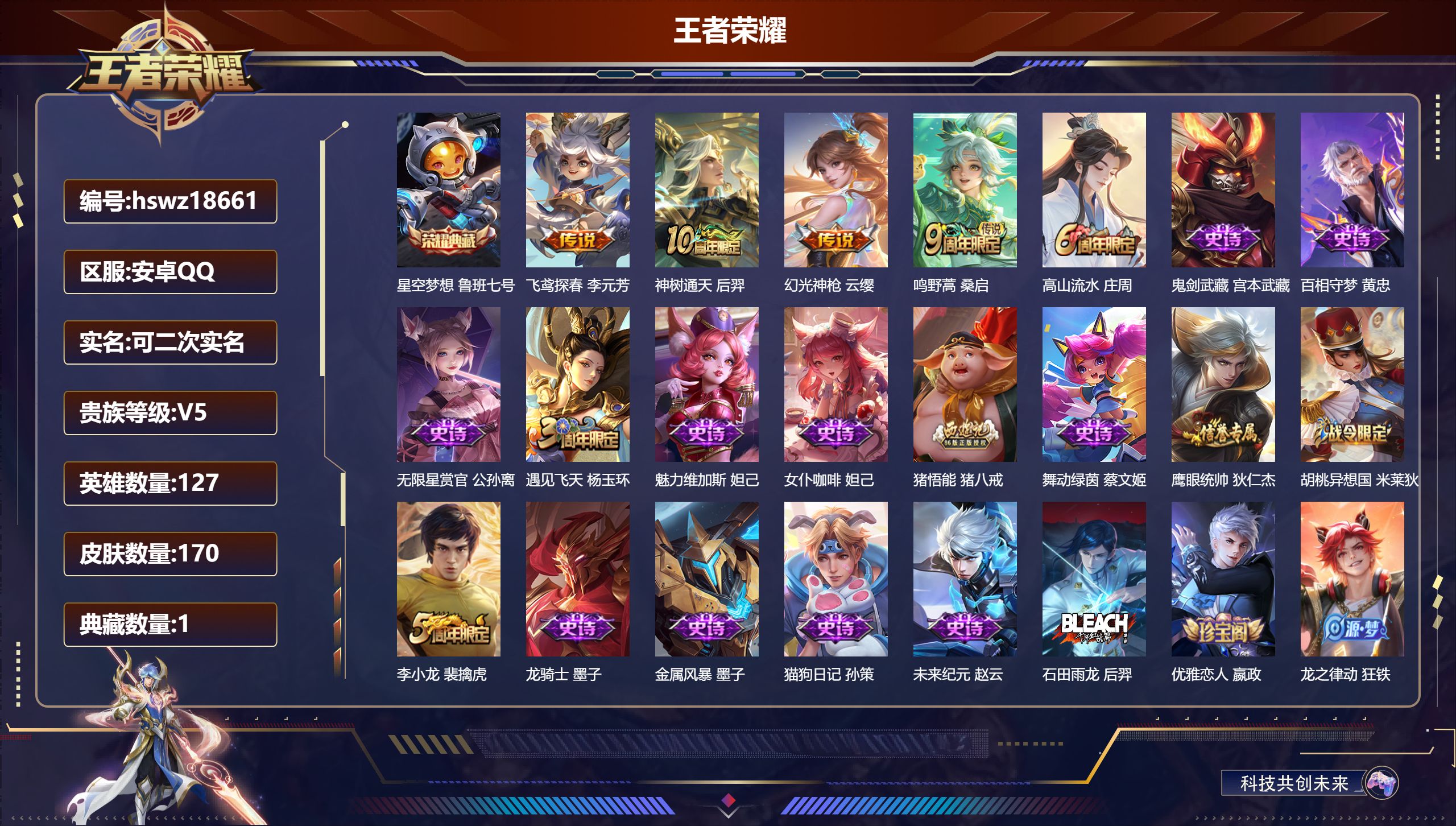 PX_2279169-Q/绝世王者/170皮肤/127英雄/1典藏/0珍品无双/0无双/0珍品传说/4传说/34史诗/9稀有英雄 【1,典藏皮肤】星空梦想,鲁班七号, 【4,传说皮肤】飞鸢探春,李元芳,神树通天,后羿,幻光神枪,云缨,鸣野蒿,桑启, 【34,史诗皮肤】高山流水,庄周,鬼剑武藏,宫本武藏,百相守梦,黄忠,无限星赏官,公孙离,遇见飞天,杨玉环,魅力维加斯,妲己,女仆咖啡,妲己,猪悟能,猪八戒,舞动绿茵,蔡文姬,鹰眼统帅,狄仁杰,胡桃异想国,米莱狄,李小龙,裴擒虎,龙骑士,墨子,金属风暴,墨子,猫狗日记,孙策,未来纪元,赵云,石田雨龙,后羿,优雅恋人,嬴政,龙之律动,狂铁,皇家上将,赵云,冰冠公主,雅典娜,功夫厨神,程咬金,涂山容容,公孙离,天狼绘梦者,上官婉儿,地狱岩魂,廉颇,冰雪圆舞曲,甄姬,织梦人,西施,心灵骇客,安琪拉,乱世虎臣,张飞,缤纷独角兽,小乔,水果甜心,孙尚香,幽灵船长,曹操,乘风破浪,夏侯惇,暗隐猎兽者,兰陵王, 【95,勇者皮肤】圆桌骑士,盾山,烛龙,曹操,星际陆战队,达摩,沙漠行僧,达摩,缤纷绘卷,张良,纽约教父,刘备,龙舞盛年,沈梦溪,功夫炙烤,廉颇,沉稳之力,孙尚香,海盐诗旅,桑启,朔风刀,夏侯惇,醍醐杖,老夫子,归虚梦演,孙膑,白色死神,白起,王牌新星,海月,御旌,牛魔,阴阳师,狄仁杰,炼金王,扁鹊,致命风华,阿轲,次元突破,哪吒,古海寻踪,张良,功夫老勺,老夫子,西部大镖客,牛魔,鲨炮海盗猫,沈梦溪,海滩派对,项羽,完美运算,后羿,万华元夜,狄仁杰,克喵,鬼谷子,踏浪烽翎,莱西奥,演武夺筹,程咬金,蜃楼王,庄周,哥特玫瑰,露娜,守护之力,大乔,无双福将,程咬金,原初探秘者,鬼谷子,潮玩探月行,猪八戒,天穹祈灯,鬼谷子,疑决卦,明世隐,如懿,安琪拉,五福同心,张飞,星际陆战队,程咬金,幻乐之宴,鬼谷子,霸王丸,宫本武藏,虹云星官,明世隐,死亡骑士,亚瑟,玩偶对对碰,安琪拉,海滩丽影,钟无艳,忍·炎影,赵云,狰,白起,重明,芈月,炽热元素使,姜子牙,坚韧之力,苏烈,唤灵魔甲,刘禅,万事如意,刘备,擒涛扼浪,裴擒虎,乓乓大师,鲁班大师,探海日志,鲁班大师,玩趣恶龙,高渐离,兔女郎,花木兰,龙腾万里,关羽,金庭之子,兰陵王,罗小黑战记,哪吒,千军破阵,苏烈,荣光之誓,亚瑟,花好人间,甄姬,万象初新,宫本武藏,御銮,盾山,春野之旅,钟无艳,秘密基地,刘禅,穷奇,典韦,教廷特使,韩信,云中旅人,李元芳,妄想特派,李元芳,西部大镖客,孙悟空,凯尔特女王,虞姬,少女阿狸,妲己,混沌棋,弈星,御霄,米莱狄,布丁狗之约,阿古朵,命运加冕,露娜,小满鸭,姬小满,幻想奇妙夜,王昭君,驱傩正仪,钟馗,特工战影,狂铁,虚灵犬护,钟馗,御狮,狂铁,饕餮,太乙真人,劲辣红锅,太乙真人,罗小黑战记,张良,剑破天穹,刘邦,星梦巡礼,姜子牙,群星魔术团,程咬金,鹤鸣心笺,艾琳,锦麟游梦,庄周,逆浪荇歌,甄姬, 【37,其他皮肤】伊势巫女,大乔,金属狂潮,高渐离,前尘,金蝉,战争骑士,夏侯惇,圣殿之光,刘邦,芝加哥教父,黄忠,三太子,哪吒,棒球奇才,沈梦溪,龙域领主,铠,死神来了,曹操,超能战警,曹操,花见巫女,伽罗,万圣前夜,小乔,灼热之刃,李信,熊喵少女,阿古朵,木偶奇遇记,鲁班七号,精灵王,后羿,绯红之刃,露娜,海军大将,周瑜,星航指挥官,诸葛亮,街头旋风,裴擒虎,归虚梦演,蒙犽,激情绿茵,马可波罗,阿摩司公爵,鬼谷子,画中游,桑启,年年有余,猪八戒,幸存者,马超,特种部队,李元芳,绝影神枪,百里守约,森,瑶,孤猎,澜,加勒比小姐,虞姬,踏雪寻梅,弈星,精灵公主,王昭君,赤焰之缨,云缨,地府判官,钟馗,西部大镖客,孙悟空, 【9,稀有英雄】敖隐,嬴政,不知火舞,橘右京,夏洛特,娜可露露,韩信,艾琳,赵云, 营地ID:,