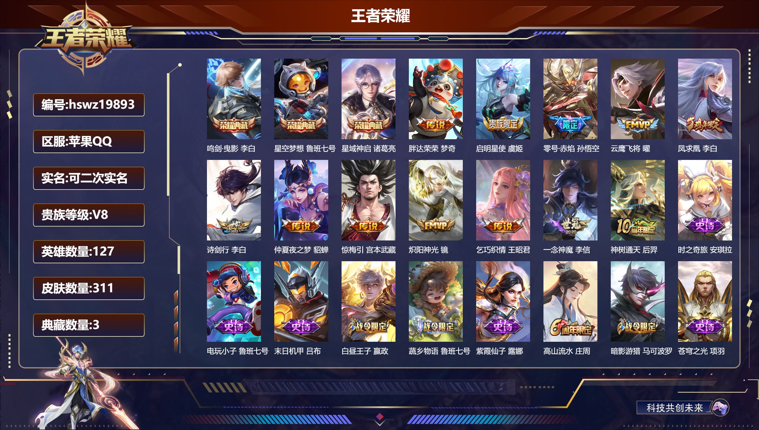 PX_2295601-贵族等级:,V8,英雄数:,127,皮肤数:,346,荣耀水晶:,幻阙歌,星传说:,未来机甲,幽冥火,金色仲夏夜,玉鸾吟,传说皮:,冠军飞将,猫影幻舞,久胜战神,末日机甲-孙尚香,地狱火,仲夏夜之梦,零号·赤焰,画中仙,电玩·雷克斯,妄想实况,妄想奇谈,霜月吟,貂蝉曦玄引,限定皮:,李小龙,祈雪灵祝,游园惊梦,梁祝,白晶晶,神威,时之彼端,飞衡,逐梦之音,天狼狩猎者,凤求凰,至尊宝,猪悟能,傲雪梅枪,逐霄战戟,愿照·千秋盛
