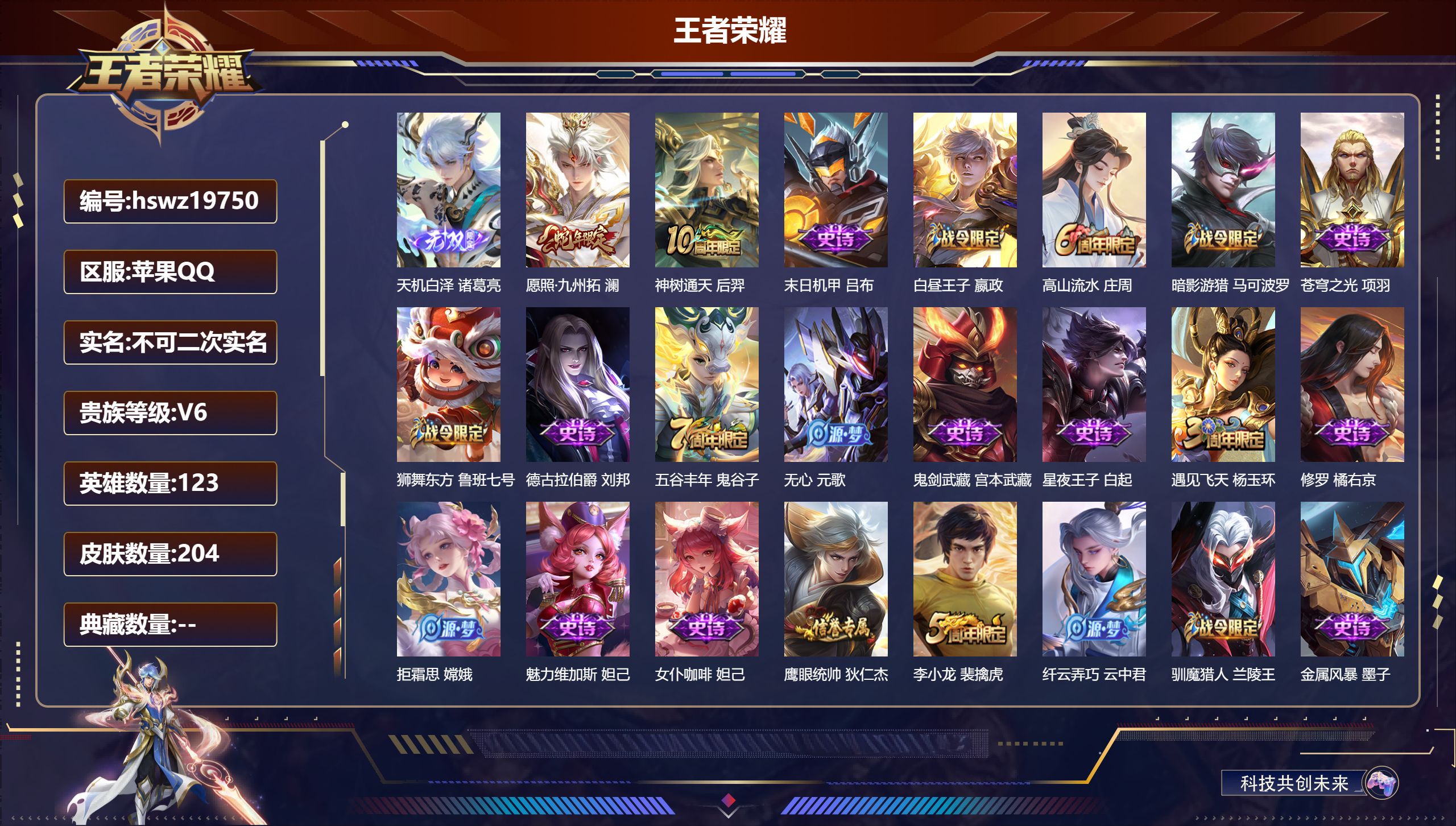 PX_2300269-Q/无双王者/204皮肤/123英雄/0典藏/0珍品无双/1无双/0珍品传说/2传说/40史诗/7稀有英雄 【1,无双皮肤】天机白泽,诸葛亮, 【2,传说皮肤】愿照·九州拓,澜,神树通天,后羿, 【40,史诗皮肤】末日机甲,吕布,白昼王子,嬴政,高山流水,庄周,暗影游猎,马可波罗,苍穹之光,项羽,狮舞东方,鲁班七号,德古拉伯爵,刘邦,五谷丰年,鬼谷子,无心,元歌,鬼剑武藏,宫本武藏,星夜王子,白起,遇见飞天,杨玉环,修罗,橘右京,拒霜思,嫦娥,魅力维加斯,妲己,女仆咖啡,妲己,鹰眼统帅,狄仁杰,李小龙,裴擒虎,纤云弄巧,云中君,驯魔猎人,兰陵王,金属风暴,墨子,逐浪之夏,李元芳,魔术师,狄仁杰,龙之律动,狂铁,皇家上将,赵云,梁祝,上官婉儿,圣诞恋歌,貂蝉,云间偶戏,元歌,蔷薇恋人,孙尚香,冰雪圆舞曲,甄姬,节奏热浪,阿轲,超时空战士,钟无艳,万灵启世,女娲,箭羽风息,伽罗,缤纷独角兽,小乔,蓝屏警告,典韦,真爱魔法,干将莫邪,水果甜心,孙尚香,乘风破浪,夏侯惇,暗隐猎兽者,兰陵王, 【99,勇者皮肤】胡桃夹子,干将莫邪,圆桌骑士,盾山,爱心护理,阿轲,沙漠行僧,达摩,大漠名商,沈梦溪,缤纷绘卷,张良,纽约教父,刘备,拳王,达摩,大发明家,达摩,乐园追猎者,白起,功夫炙烤,廉颇,铁甲之心,典韦,沉稳之力,孙尚香,海盐诗旅,桑启,朔风刀,夏侯惇,醍醐杖,老夫子,朔望之晖,女娲,归虚梦演,孙膑,白色死神,白起,黄金武士,典韦,落雪兰心,甄姬,御旌,牛魔,阴阳师,狄仁杰,径山谋武,孙权,次元突破,哪吒,古海寻踪,张良,功夫老勺,老夫子,西部大镖客,牛魔,鲨炮海盗猫,沈梦溪,海滩派对,项羽,完美运算,后羿,万华元夜,狄仁杰,红桃皇后,芈月,奇妙博物学,庄周,猎兽之王,吕布,野性能量,吕布,哥特玫瑰,露娜,守护之力,大乔,无双福将,程咬金,原初探秘者,鬼谷子,潮玩探月行,猪八戒,天穹祈灯,鬼谷子,西部大镖客,猪八戒,疑决卦,明世隐,化身博士,扁鹊,潮玩骑士王,亚瑟,五福同心,张飞,星际陆战队,程咬金,幻乐之宴,鬼谷子,霸王丸,宫本武藏,虹云星官,明世隐,潮玩牛仔,马可波罗,救世之瞳,扁鹊,赤莲之焰,周瑜,死亡骑士,亚瑟,敏锐之力,李白,玩偶对对碰,安琪拉,掌控之力,诸葛亮,海滩丽影,钟无艳,圣弓游侠,后羿,忍·炎影,赵云,雪境奇遇,西施,炽热元素使,姜子牙,坚韧之力,苏烈,万事如意,刘备,擒涛扼浪,裴擒虎,乓乓大师,鲁班大师,兔女郎,花木兰,龙腾万里,关羽,金庭之子,兰陵王,罗小黑战记,哪吒,千军破阵,苏烈,零食大作战,姬小满,荣光之誓,亚瑟,花好人间,甄姬,万象初新,宫本武藏,御銮,盾山,秘密基地,刘禅,教廷特使,韩信,云中旅人,李元芳,西部大镖客,孙悟空,少女阿狸,妲己,混沌棋,弈星,御霄,米莱狄,蔚蓝守将,蒙恬,幻想奇妙夜,王昭君,驱傩正仪,钟馗,神迹守卫,钟馗,特工战影,狂铁,御狮,狂铁,白执事,赵云,劲辣红锅,太乙真人,剑破天穹,刘邦,星梦巡礼,姜子牙,谧流熔炉,太乙真人,鹤鸣心笺,艾琳,云械蓝图,云中君,逆浪荇歌,甄姬,景韶洛都,明世隐, 【62,其他皮肤】伊势巫女,大乔,金属狂潮,高渐离,前尘,金蝉,圣殿之光,刘邦,芝加哥教父,黄忠,潮流仙人,老夫子,三太子,哪吒,龙域领主,铠,生化警戒,钟无艳,超能战警,曹操,花见巫女,伽罗,未来旅行,孙膑,第七人偶,干将莫邪,万圣前夜,小乔,灼热之刃,李信,熊喵少女,阿古朵,海之征途,孙策,木偶奇遇记,鲁班七号,福禄兄弟,鲁班七号,精灵王,后羿,绯红之刃,露娜,冰刃幻境,镜,海军大将,周瑜,星航指挥官,诸葛亮,魇语军师,司马懿,午夜歌剧院,元歌,启蛰,司空震,隐刃,兰陵王,花间舞,公孙离,异域舞娘,貂蝉,街头旋风,裴擒虎,归虚梦演,鲁班大师,剑舞者,花木兰,范海辛,李白,维京掠夺者,苍,归虚梦演,蒙犽,激情绿茵,马可波罗,埃及法老,杨戬,归虚梦演,西施,阿摩司公爵,鬼谷子,年年有余,猪八戒,尼罗河女神,女娲,锦衣卫,狄仁杰,归虚梦演,曜,幸存者,马超,战争女神,雅典娜,荷鲁斯之眼,云中君,创世神祝,盘古,特种部队,李元芳,绝影神枪,百里守约,蔷薇王座,蔡文姬,森,瑶,孤猎,澜,加勒比小姐,虞姬,踏雪寻梅,弈星,精准探案法,米莱狄,精灵公主,王昭君,赤焰之缨,云缨,美梦成真,梦奇,天启骑士,关羽,圆桌骑士,太乙真人,西部大镖客,孙悟空, 【7,稀有英雄】不知火舞,橘右京,夏洛特,娜可露露,韩信,艾琳,赵云, 营地ID:,