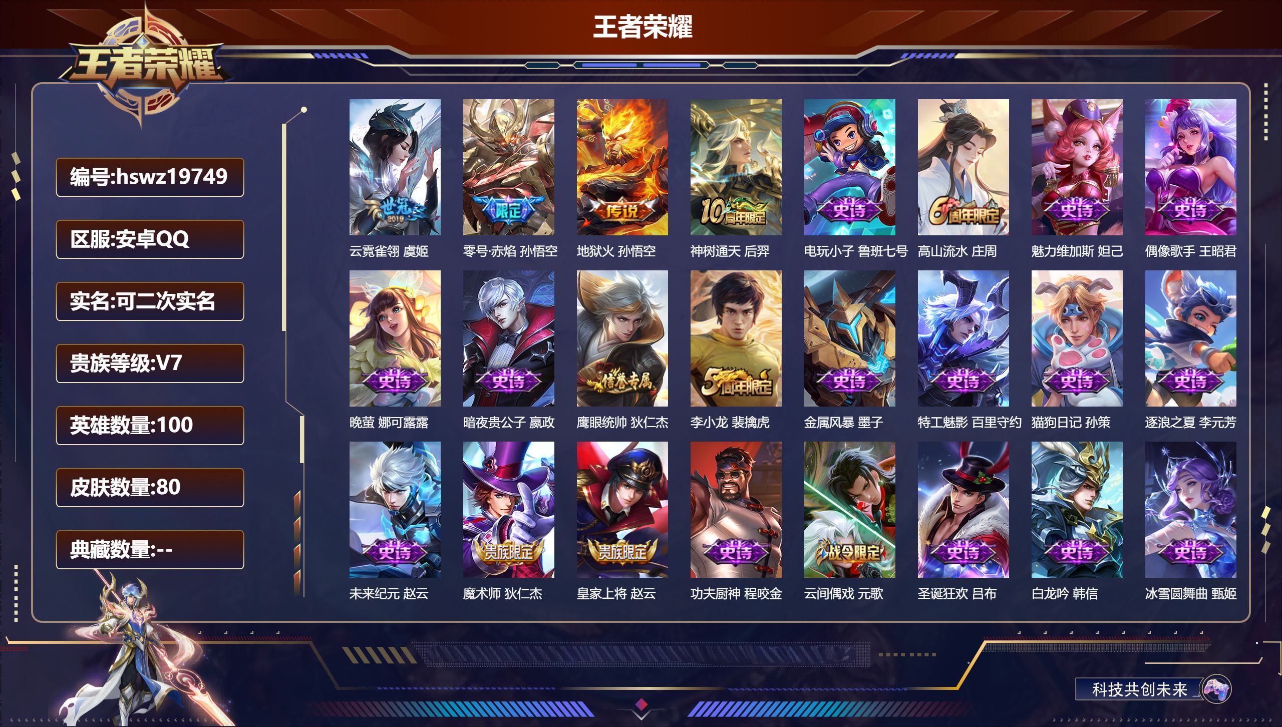 PX_2300267-Q/尊贵铂金/80皮肤/100英雄/0典藏/0珍品无双/0无双/0珍品传说/4传说/21史诗/8稀有英雄 【4,传说皮肤】云霓雀翎,虞姬,零号·赤焰,孙悟空,地狱火,孙悟空,神树通天,后羿, 【21,史诗皮肤】电玩小子,鲁班七号,高山流水,庄周,魅力维加斯,妲己,偶像歌手,王昭君,晚萤,娜可露露,暗夜贵公子,嬴政,鹰眼统帅,狄仁杰,李小龙,裴擒虎,金属风暴,墨子,特工魅影,百里守约,猫狗日记,孙策,逐浪之夏,李元芳,未来纪元,赵云,魔术师,狄仁杰,皇家上将,赵云,功夫厨神,程咬金,云间偶戏,元歌,圣诞狂欢,吕布,白龙吟,韩信,冰雪圆舞曲,甄姬,曙光守护者,铠, 【39,勇者皮肤】大漠名商,沈梦溪,缤纷绘卷,张良,拳王,达摩,海盐诗旅,桑启,白色死神,白起,阴阳师,狄仁杰,科学大爆炸,项羽,功夫老勺,老夫子,海滩派对,项羽,万华元夜,狄仁杰,无尽征程,廉颇,演武夺筹,程咬金,奇妙博物学,庄周,瓷语鉴心,露娜,原初探秘者,鬼谷子,潮玩骑士王,亚瑟,阿尔法小队,后羿,虹云星官,明世隐,死亡骑士,亚瑟,玩偶对对碰,安琪拉,忍·炎影,赵云,雪境奇遇,西施,坚韧之力,苏烈,探海日志,鲁班大师,未来纪元,宫本武藏,千军破阵,苏烈,万象初新,宫本武藏,云中旅人,李元芳,西部大镖客,孙悟空,少女阿狸,妲己,驱傩正仪,钟馗,特工战影,狂铁,白执事,赵云,铁骨偃魂,典韦,苍林狼骑,苍,天穹之誓,姜子牙,魅影绮裳,影,谧流熔炉,太乙真人,鹤鸣心笺,艾琳, 【17,其他皮肤】潮流仙人,老夫子,龙域领主,铠,生化警戒,钟无艳,灼热之刃,李信,精灵王,后羿,冰刃幻境,镜,星航指挥官,诸葛亮,魇语军师,司马懿,启蛰,司空震,隐刃,兰陵王,剑舞者,花木兰,荷鲁斯之眼,云中君,特种部队,李元芳,绝影神枪,百里守约,孤猎,澜,美梦成真,梦奇,西部大镖客,孙悟空, 【8,稀有英雄】嬴政,不知火舞,橘右京,夏洛特,娜可露露,韩信,艾琳,赵云, 营地ID:,