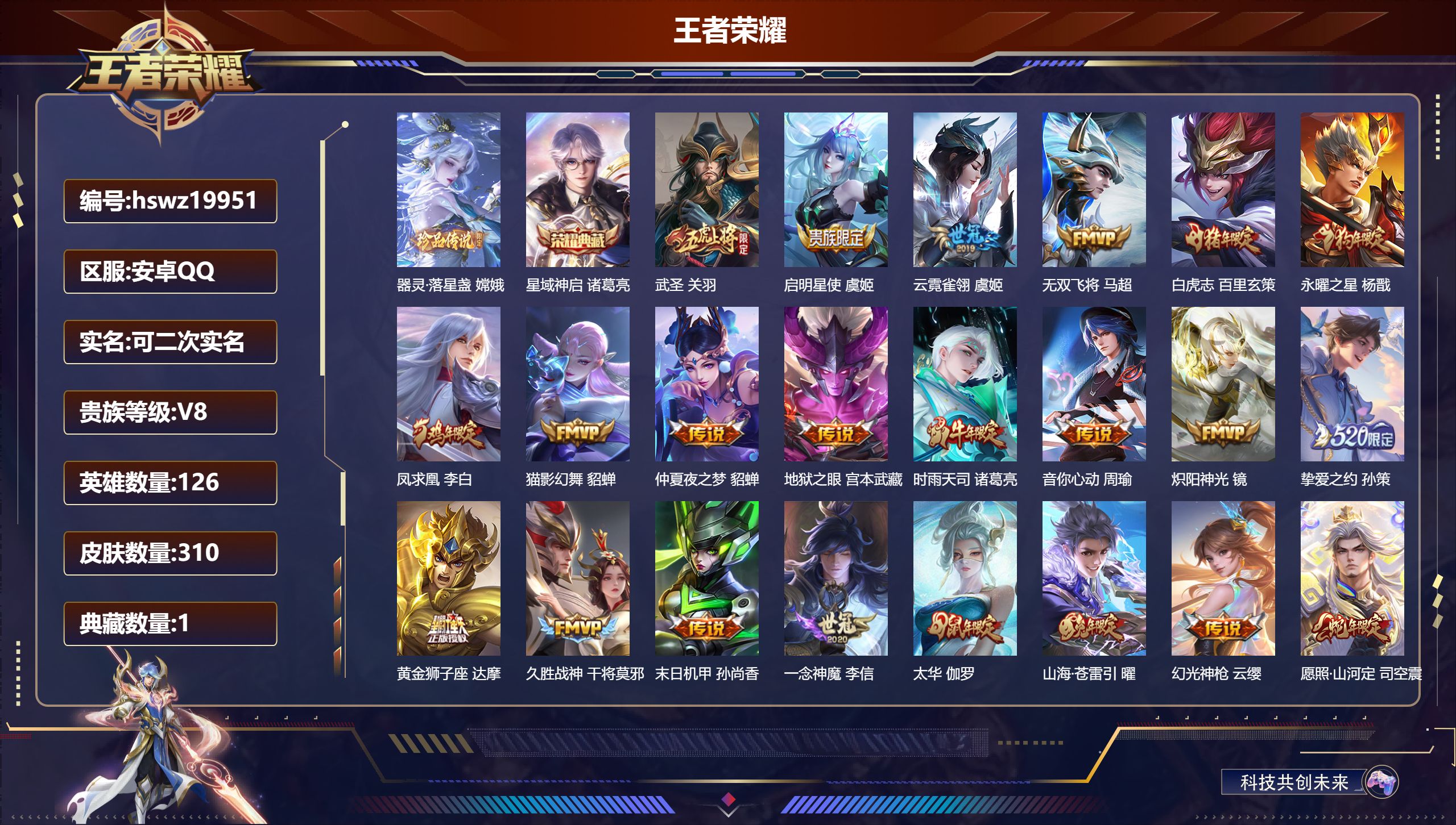 PX_2306430-Q/非凡王者/310皮肤/126英雄/1典藏/0珍品无双/0无双/1珍品传说/22传说/111史诗/8稀有英雄 【1,珍品传说】器灵·落星盏,嫦娥, 【1,典藏皮肤】星域神启,诸葛亮, 【22,传说皮肤】武圣,关羽,启明星使,虞姬,云霓雀翎,虞姬,无双飞将,马超,白虎志,百里玄策,永曜之星,杨戬,凤求凰,李白,猫影幻舞,貂蝉,仲夏夜之梦,貂蝉,地狱之眼,宫本武藏,时雨天司,诸葛亮,音你心动,周瑜,炽阳神光,镜,挚爱之约,孙策,黄金狮子座,达摩,久胜战神,干将莫邪,末日机甲,孙尚香,一念神魔,李信,太华,伽罗,山海·苍雷引,曜,幻光神枪,云缨,愿照·山河定,司空震, 【111,史诗皮肤】霸王别姬,项羽,时之奇旅,安琪拉,电玩小子,鲁班七号,末日机甲,吕布,紫霞仙子,露娜,百解令,蒙犽,高山流水,庄周,银河之约,李元芳,暗影游猎,马可波罗,天秀·启明,杨戬,狮舞东方,鲁班七号,猫狗日记,大乔,妄想食味,姬小满,德古拉伯爵,刘邦,山海·玄木吟,马可波罗,心灵战警,亚瑟,五谷丰年,鬼谷子,诗语江南,西施,无心,元歌,鬼剑武藏,宫本武藏,星夜王子,白起,无限星赏官,公孙离,地狱燃心,司空震,摇滚巨星,嬴政,顽趣,梦奇,修罗,橘右京,拒霜思,嫦娥,魅力维加斯,妲己,黄金分割率,诸葛亮,乐园奇幻夜,钟馗,凤凰于飞,王昭君,偶像歌手,王昭君,荣光圣徽,蒙恬,女仆咖啡,妲己,晚萤,娜可露露,遇见神鹿,瑶,繁星吟游,蔡文姬,暗夜贵公子,嬴政,鹰眼统帅,狄仁杰,胡桃异想国,米莱狄,白晶晶,芈月,大圣娶亲,孙悟空,飞衡,韩信,孙行者,孙悟空,李小龙,裴擒虎,光弋星穹,莱西奥,纤云弄巧,云中君,驯魔猎人,兰陵王,奇迹圣诞,蔡文姬,龙骑士,墨子,金属风暴,墨子,玄嵩,庄周,特工魅影,百里守约,猫狗日记,孙策,原初追逐者,百里玄策,逐浪之夏,李元芳,未来纪元,赵云,朱雀志,百里守约,黎明之约,雅典娜,鸭鸭历险记,刘禅,驭风魔法,戈娅,魔术师,狄仁杰,龙之律动,狂铁,神威,马超,皇家上将,赵云,冰冠公主,雅典娜,辉光之辰,后羿,功夫厨神,程咬金,梁祝,上官婉儿,电玩·爆裂旋风,刘禅,天才门将,刘禅,圣诞恋歌,貂蝉,云间偶戏,元歌,水晶猎龙者,花木兰,御风骁将,吕布,怒海争锋,黄忠,圣诞狂欢,吕布,魅语,不知火舞,器灵·浮梦炉,赵怀真,天狼绘梦者,上官婉儿,岱宗,典韦,天狼运算者,孙膑,星界战将,牛魔,永昼,夏洛特,地狱岩魂,廉颇,冰雪圆舞曲,甄姬,月团寄思,沈梦溪,航海奇遇记,老夫子,千年之狐,李白,节奏热浪,阿轲,暗夜猫娘,阿轲,幽恒,甄姬,超时空战士,钟无艳,曙光守护者,铠,心灵骇客,安琪拉,箭羽风息,伽罗,乱世虎臣,张飞,天狼征服者,曹操,王者之锤,钟无艳,绅士熊喵,刘禅,缤纷独角兽,小乔,蓝屏警告,典韦,天狼狩猎者,裴擒虎,真爱魔法,干将莫邪,水果甜心,孙尚香,狂想玩偶喵,蒙犽,化蝶舞,阿轲,江河有灵,阿古朵,幽灵船长,曹操,乘风破浪,夏侯惇,暗隐猎兽者,兰陵王, 【129,勇者皮肤】时空谍影,海诺,玲珑珍味,西施,圆桌骑士,盾山,太极少年,赵怀真,星际陆战队,达摩,沙漠行僧,达摩,大漠名商,沈梦溪,缤纷绘卷,张良,纽约教父,刘备,拳王,达摩,大发明家,达摩,龙舞盛年,沈梦溪,功夫炙烤,廉颇,沉稳之力,孙尚香,爱与正义,程咬金,海盐诗旅,桑启,幻泉雾影,海月,朔风刀,夏侯惇,醍醐杖,老夫子,朔望之晖,女娲,归虚梦演,孙膑,汉昭烈帝,刘备,白色死神,白起,黑桃队长,鲁班七号,黄金武士,典韦,落雪兰心,甄姬,御旌,牛魔,阴阳师,狄仁杰,次元突破,哪吒,古海寻踪,张良,功夫老勺,老夫子,西部大镖客,牛魔,鲨炮海盗猫,沈梦溪,海滩派对,项羽,万华元夜,狄仁杰,无尽征程,廉颇,制霸全明星,牛魔,演武夺筹,程咬金,红桃皇后,芈月,野性能量,吕布,哥特玫瑰,露娜,守护之力,大乔,无双福将,程咬金,原初探秘者,鬼谷子,星空之诺,沈梦溪,潮玩探月行,猪八戒,天穹祈灯,鬼谷子,西部大镖客,猪八戒,疑决卦,明世隐,化身博士,扁鹊,潮玩骑士王,亚瑟,阿尔法小队,后羿,五福同心,张飞,金色潮汐,朵莉亚,星际陆战队,程咬金,幻乐之宴,鬼谷子,东方不败,武则天,霸王丸,宫本武藏,虹云星官,明世隐,潮玩牛仔,马可波罗,救世之瞳,扁鹊,赤莲之焰,周瑜,死亡骑士,亚瑟,浪漫序章,刘备,危途狂花,戈娅,破局者,亚连,玩偶对对碰,安琪拉,掌控之力,诸葛亮,海滩丽影,钟无艳,圣弓游侠,后羿,忍·炎影,赵云,雪境奇遇,西施,炽热元素使,姜子牙,坚韧之力,苏烈,万事如意,刘备,擒涛扼浪,裴擒虎,乓乓大师,鲁班大师,探海日志,鲁班大师,天使之翼,孙膑,玩趣恶龙,高渐离,兔女郎,花木兰,龙腾万里,关羽,流音漫舞,艾琳,金庭之子,兰陵王,千军破阵,苏烈,往忆晖光,明世隐,零食大作战,姬小满,荣光之誓,亚瑟,花好人间,甄姬,万象初新,宫本武藏,潮玩造梦师,刘备,御銮,盾山,单词大作战,雅典娜,时尚教父,姜子牙,秘密基地,刘禅,教廷特使,韩信,街头霸王,韩信,云中旅人,李元芳,妄想特派,李元芳,西部大镖客,孙悟空,神迹守卫,墨子,重装意志,盘古,混沌棋,弈星,蔚蓝守将,蒙恬,春野闲踪,苏烈,布丁狗之约,阿古朵,命运加冕,露娜,幻想奇妙夜,王昭君,灵野札记,张良,驱傩正仪,钟馗,潮玩士官长,雅典娜,神迹守卫,钟馗,鸭鸭历险记,沈梦溪,命运角斗场,狂铁,特工战影,狂铁,虚灵犬护,钟馗,劲辣红锅,太乙真人,剑破天穹,刘邦,铁骨偃魂,典韦,苍林狼骑,苍,星梦巡礼,姜子牙,谧流熔炉,太乙真人,暗都幽影,大司命,夏日便利店,虞姬,云械蓝图,云中君,噬灭天穹,东皇太一,灵卦秘语,少司缘,玫蓝誓约,戈娅,景韶洛都,明世隐, 【47,其他皮肤】前尘,金蝉,芝加哥教父,黄忠,三太子,哪