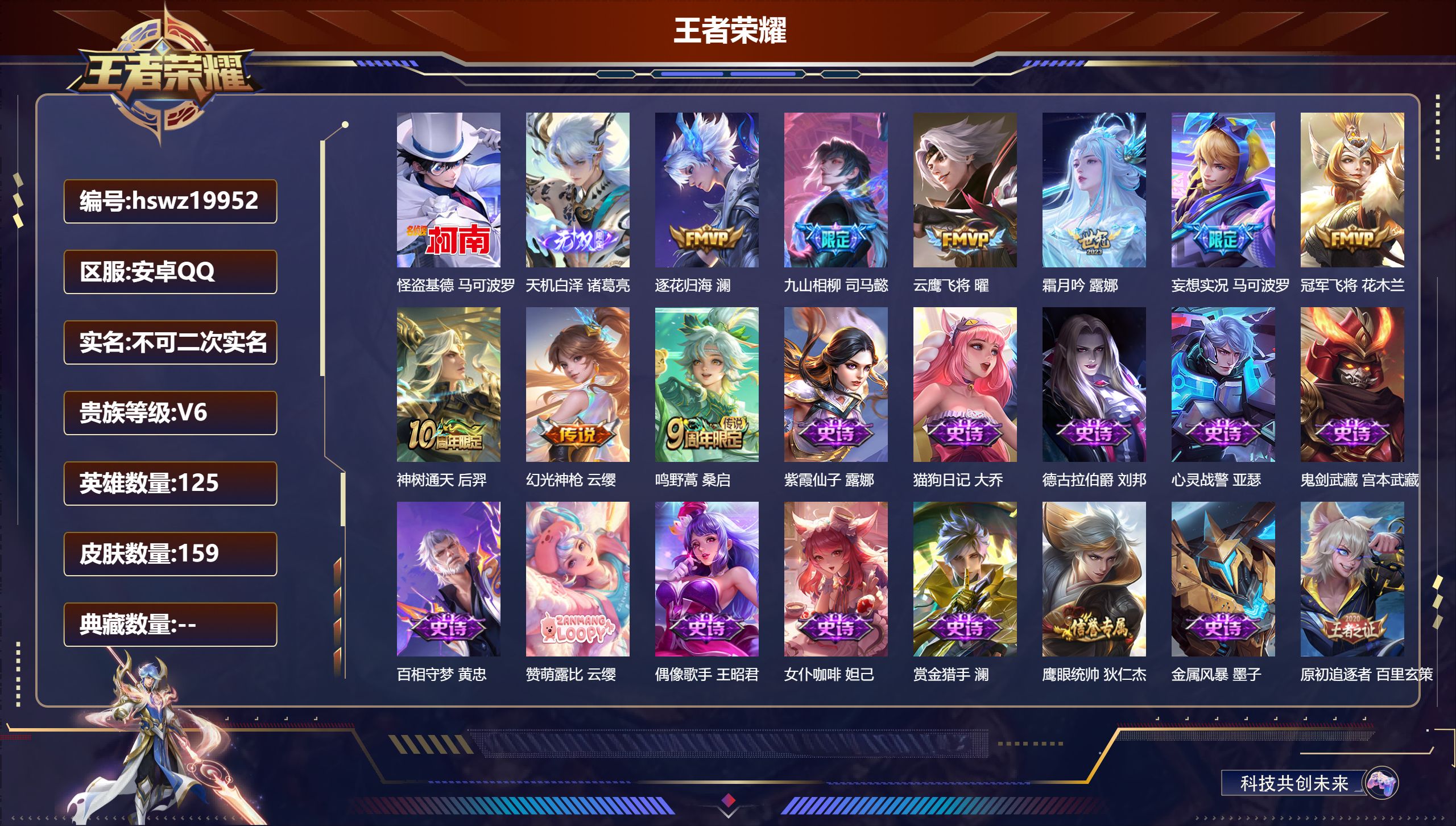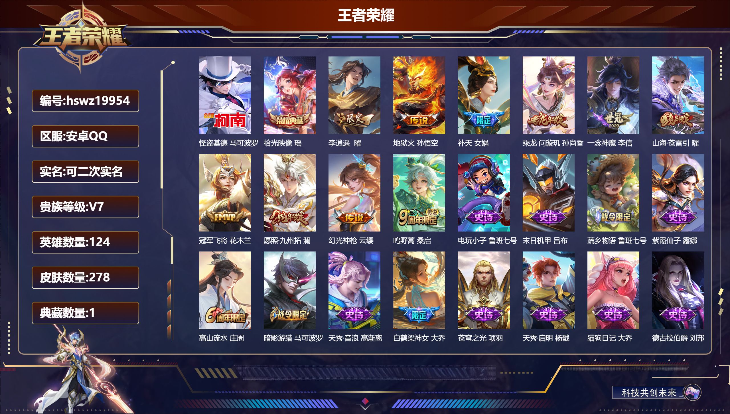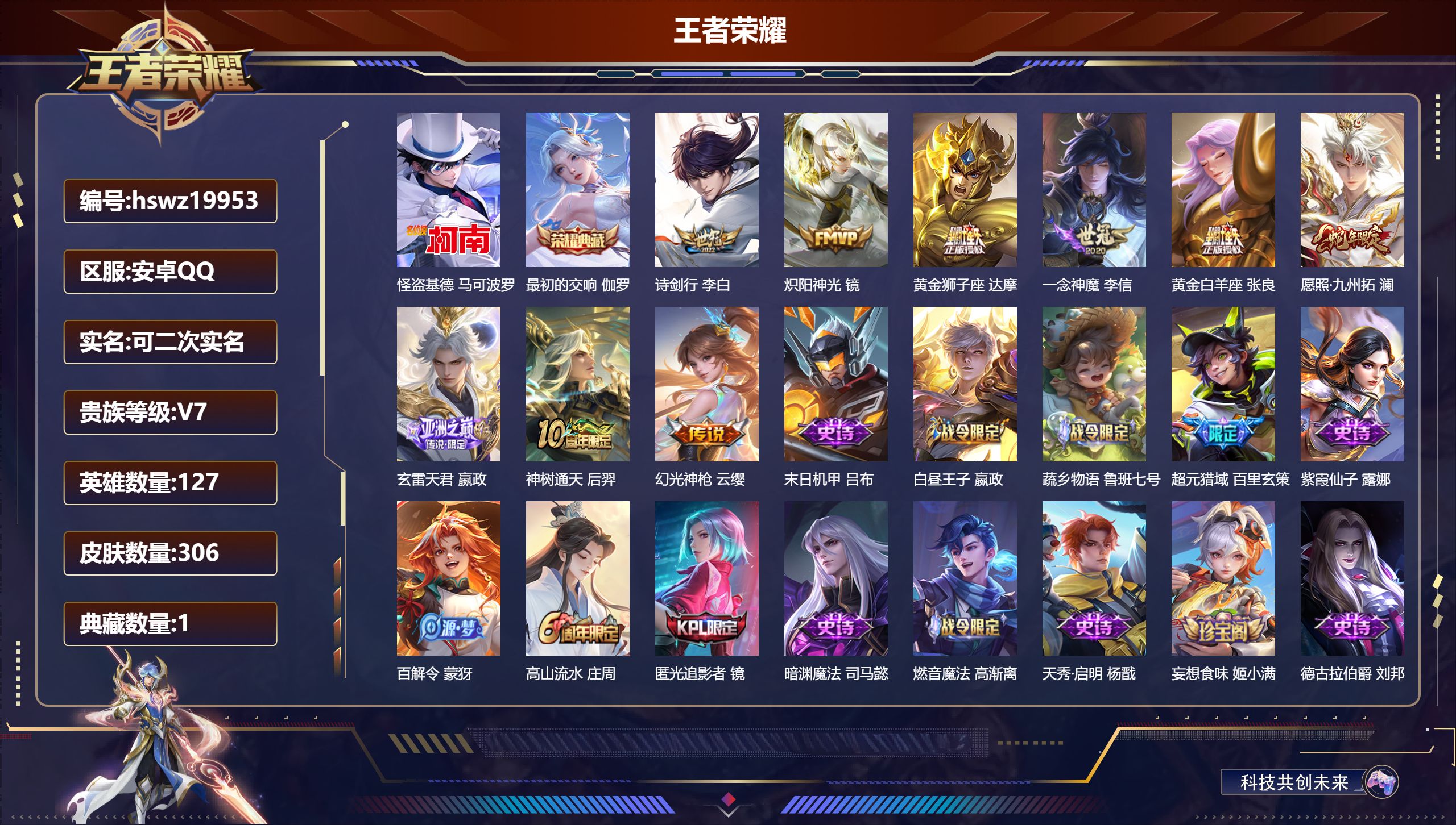 PX_2306436-Q/至尊星耀/278皮肤/124英雄/1典藏/0珍品无双/0无双/1珍品传说/10传说/82史诗/8稀有英雄 【1,珍品传说】怪盗基德,马可波罗, 【1,典藏皮肤】拾光映像,瑶, 【10,传说皮肤】李逍遥,,曜,地狱火,孙悟空,补天,女娲,乘龙·问璇玑,孙尚香,一念神魔,李信,山海·苍雷引,曜,冠军飞将,花木兰,愿照·九州拓,澜,幻光神枪,云缨,鸣野蒿,桑启, 【82,史诗皮肤】电玩小子,鲁班七号,末日机甲,吕布,蔬乡物语,鲁班七号,紫霞仙子,露娜,高山流水,庄周,暗影游猎,马可波罗,天秀·音浪,高渐离,白鹤梁神女,大乔,苍穹之光,项羽,天秀·启明,杨戬,猫狗日记,大乔,德古拉伯爵,刘邦,山海·玄木吟,马可波罗,心灵战警,亚瑟,五谷丰年,鬼谷子,无心,元歌,鬼剑武藏,宫本武藏,迷踪丽影,阿轲,星夜王子,白起,至美·乘鲤谣,西施,无限星赏官,公孙离,摇滚巨星,嬴政,顽趣,梦奇,蜜橘之夏,公孙离,拒霜思,嫦娥,魅力维加斯,妲己,黄金分割率,诸葛亮,乐园奇幻夜,钟馗,荣光圣徽,蒙恬,女仆咖啡,妲己,天降福星,梦奇,星界游侠,暃,舞动绿茵,蔡文姬,鹰眼统帅,狄仁杰,玫瑰异探,镜,李小龙,裴擒虎,纤云弄巧,云中君,金属风暴,墨子,特工魅影,百里守约,猫狗日记,孙策,原初追逐者,百里玄策,逐浪之夏,李元芳,黎明之约,雅典娜,魔术师,狄仁杰,皇家上将,赵云,梁祝,上官婉儿,电玩·爆裂旋风,刘禅,天才门将,刘禅,圣诞恋歌,貂蝉,水晶猎龙者,花木兰,山海·碧波行,瑶,一生所爱,露娜,圣诞狂欢,吕布,青焰无极,镜,顽趣,阿古朵,星界战将,牛魔,地狱岩魂,廉颇,茶境仙,孙膑,冰雪圆舞曲,甄姬,火炮绅士,黄忠,青蛇,小乔,月团寄思,沈梦溪,航海奇遇记,老夫子,千年之狐,李白,节奏热浪,阿轲,游园惊梦,甄姬,曙光守护者,铠,青龙志,铠,心灵骇客,安琪拉,箭羽风息,伽罗,乱世虎臣,张飞,万物之道,弈星,缤纷独角兽,小乔,百相守梦,百里守约,真爱魔法,干将莫邪,水果甜心,孙尚香,狂想玩偶喵,蒙犽,化蝶舞,阿轲,江河有灵,阿古朵,幽灵船长,曹操,乘风破浪,夏侯惇,暗隐猎兽者,兰陵王, 【130,勇者皮肤】圆桌骑士,盾山,烛龙,曹操,沙漠行僧,达摩,大漠名商,沈梦溪,缤纷绘卷,张良,纽约教父,刘备,拳王,达摩,大发明家,达摩,龙舞盛年,沈梦溪,乐园追猎者,白起,功夫炙烤,廉颇,铁甲之心,典韦,沉稳之力,孙尚香,幻夜卜梦,芈月,海盐诗旅,桑启,幻泉雾影,海月,醍醐杖,老夫子,朔望之晖,女娲,归虚梦演,孙膑,汉昭烈帝,刘备,热血海滩,哪吒,白色死神,白起,黄金武士,典韦,夺宝奇兵,刘邦,御旌,牛魔,阴阳师,狄仁杰,次元突破,哪吒,古海寻踪,张良,科学大爆炸,项羽,功夫老勺,老夫子,西部大镖客,牛魔,鲨炮海盗猫,沈梦溪,鲤鱼之梦,庄周,虎啸剑宗,刘邦,海滩派对,项羽,完美运算,后羿,万华元夜,狄仁杰,制霸全明星,牛魔,演武夺筹,程咬金,红桃皇后,芈月,奇妙博物学,庄周,西部游侠,莱西奥,野性能量,吕布,守护之力,大乔,无双福将,程咬金,瓷语鉴心,露娜,原初探秘者,鬼谷子,潮玩探月行,猪八戒,天穹祈灯,鬼谷子,西部大镖客,猪八戒,疑决卦,明世隐,化身博士,扁鹊,阿尔法小队,后羿,五福同心,张飞,金色潮汐,朵莉亚,次元傲视,杨戬,幻乐之宴,鬼谷子,霸王丸,宫本武藏,虹云星官,明世隐,潮玩牛仔,马可波罗,死亡骑士,亚瑟,浪漫序章,刘备,敏锐之力,李白,胡桃狂想曲,蒙犽,掌控之力,诸葛亮,海滩丽影,钟无艳,圣弓游侠,后羿,忍·炎影,赵云,狰,白起,雪境奇遇,西施,重明,芈月,炽热元素使,姜子牙,坚韧之力,苏烈,唤灵魔甲,刘禅,万事如意,刘备,擒涛扼浪,裴擒虎,乓乓大师,鲁班大师,探海日志,鲁班大师,雾都夜雨,干将莫邪,玩趣恶龙,高渐离,龙腾万里,关羽,金庭之子,兰陵王,未来纪元,宫本武藏,千军破阵,苏烈,零食大作战,姬小满,花好人间,甄姬,单词大作战,雅典娜,时尚教父,姜子牙,春野之旅,钟无艳,秘密基地,刘禅,穷奇,典韦,教廷特使,韩信,街头霸王,韩信,云中旅人,李元芳,神迹守卫,墨子,重装意志,盘古,进击墨子号,墨子,蔬乡物语,李元芳,少女阿狸,妲己,混沌棋,弈星,御霄,米莱狄,蔚蓝守将,蒙恬,契约魔法,米莱狄,暖冬·兔眠,嫦娥,绒语心约,大乔,驱傩正仪,钟馗,特工战影,狂铁,虚灵犬护,钟馗,白执事,赵云,饕餮,太乙真人,华丽摇滚,太乙真人,劲辣红锅,太乙真人,剑破天穹,刘邦,苍威无极,项羽,铁骨偃魂,典韦,熔金海岸,周瑜,苍林狼骑,苍,天穹之誓,姜子牙,访茗客,马超,星梦巡礼,姜子牙,谧流熔炉,太乙真人,群星魔术团,程咬金,鹤鸣心笺,艾琳,逆浪荇歌,甄姬,百相守梦,老夫子,噬灭天穹,东皇太一,灵卦秘语,少司缘,敬我三分,盘古,玫蓝誓约,戈娅,景韶洛都,明世隐, 【54,其他皮肤】伊势巫女,大乔,金属狂潮,高渐离,前尘,金蝉,圣殿之光,刘邦,芝加哥教父,黄忠,龙域领主,铠,花见巫女,伽罗,爱与和平,苏烈,第七人偶,干将莫邪,灼热之刃,李信,熊喵少女,阿古朵,海之征途,孙策,木偶奇遇记,鲁班七号,冰刃幻境,镜,碧珀绯影,暃,星航指挥官,诸葛亮,魇语军师,司马懿,午夜歌剧院,元歌,启蛰,司空震,隐刃,兰陵王,霓裳曲,杨玉环,花间舞,公孙离,街头旋风,裴擒虎,归虚梦演,鲁班大师,东海龙王,东皇太一,修竹墨客,上官婉儿,剑舞者,花木兰,范海辛,李白,维京掠夺者,苍,归虚梦演,蒙犽,激情绿茵,马可波罗,埃及法老,杨戬,归虚梦演,西施,画中游,桑启,年年有余,猪八戒,尼罗河女神,女娲,一千零一夜,张良,归虚梦演,曜,威尼斯狂欢,百里玄策,幸存者,马超,战争女神,雅典娜,创世神祝,盘古,特种部队,李元芳,绝影神枪,百里守约,蔷薇王座,蔡文姬,森,瑶,孤猎,澜