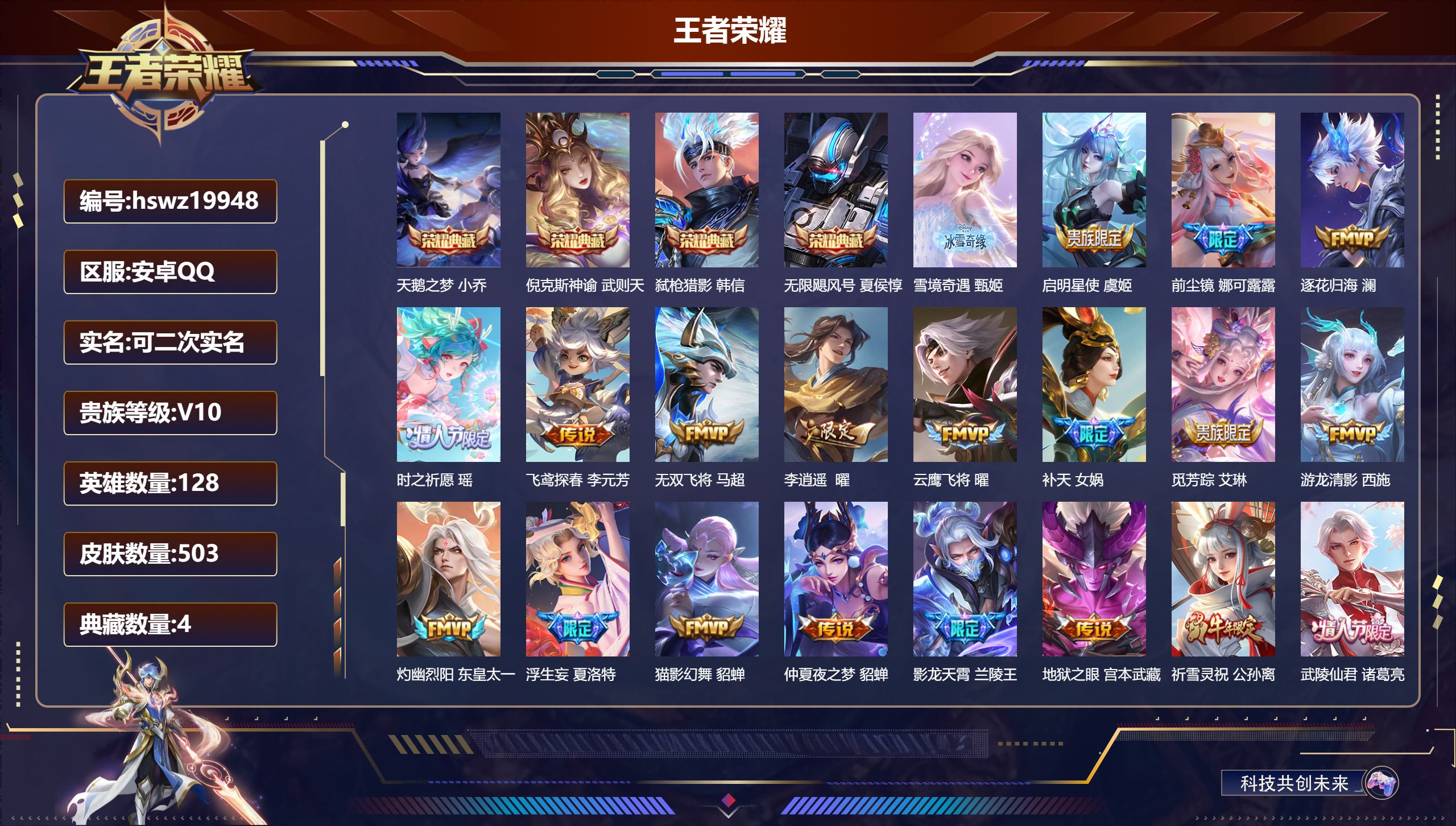 PX_2306425-Q/绝世王者/503皮肤/128英雄/4典藏/0珍品无双/1无双/0珍品传说/58传说/171史诗/10稀有英雄 【4,典藏皮肤】天鹅之梦,小乔,倪克斯神谕,武则天,弑枪猎影,韩信,无限飓风号,夏侯惇, 【1,无双皮肤】雪境奇遇,甄姬, 【58,传说皮肤】启明星使,虞姬,前尘镜,娜可露露,逐花归海,澜,时之祈愿,瑶,飞鸢探春,李元芳,无双飞将,马超,李逍遥,,曜,云鹰飞将,曜,补天,女娲,觅芳踪,艾琳,游龙清影,西施,灼幽烈阳,东皇太一,浮生妄,夏洛特,猫影幻舞,貂蝉,仲夏夜之梦,貂蝉,影龙天霄,兰陵王,地狱之眼,宫本武藏,祈雪灵祝,公孙离,武陵仙君,诸葛亮,海洋之心,武则天,时雨天司,诸葛亮,音你心动,周瑜,炽阳神光,镜,寅虎·瑞焰,鲁班七号,怒海麟威,吕布,乞巧织情,王昭君,时之恋人,刘备,黄金狮子座,达摩,绯月行,不知火舞,久胜战神,干将莫邪,末日机甲,孙尚香,异界灵契,孙尚香,末日机甲,孙策,一念神魔,李信,画中仙,干将莫邪,山海·琳琅生,小乔,淬星耀世,赵云,百相守梦,张飞,炽翼辉光,伽罗,乘龙·铭钟鼎,赵云,挚爱花嫁,大乔,妄想实况,马可波罗,寅虎·赤拳,裴擒虎,超时空战士,狄仁杰,冥王哈迪斯,铠,黄金白羊座,张良,愿照·九州拓,澜,玄雷天君,嬴政,愿照·众生和,妲己,愿照·福禄聚,蔡文姬,神树通天,后羿,幻光神枪,云缨,愿照·山河定,司空震,愿照·岁时盈,虞姬,愿照·千秋盛,女娲,鸣野蒿,桑启,映山客,王昭君,续相思,西施, 【171,史诗皮肤】奔雷神使,牛魔,龙鼓争鸣,蒙犽,霸王别姬,项羽,电玩小子,鲁班七号,末日机甲,吕布,蔬乡物语,鲁班七号,逐梦之星,马可波罗,紫霞仙子,露娜,百解令,蒙犽,匿光追影者,镜,真爱至上,周瑜,唐三藏,金蝉,暗渊魔法,司马懿,燃音魔法,高渐离,天秀·启明,杨戬,猫狗日记,大乔,糖绘人间,亚连,德古拉伯爵,刘邦,山海·玄木吟,马可波罗,心灵战警,亚瑟,五谷丰年,鬼谷子,诗语江南,西施,巫礼祀神,少司缘,鬼剑武藏,宫本武藏,星夜王子,白起,寅虎·心曲,杨玉环,无限星赏官,公孙离,地狱燃心,司空震,玉兔公主,公孙离,摇滚巨星,嬴政,电玩高手,狂铁,顽趣,梦奇,冰锋战神,关羽,修罗,橘右京,拒霜思,嫦娥,魅力维加斯,妲己,黄金分割率,诸葛亮,热情桑巴,妲己,滕王阁序,弈星,乐园奇幻夜,钟馗,如梦令,嫦娥,凤凰于飞,王昭君,苍鳞隐世,白起,偶像歌手,王昭君,荣光圣徽,蒙恬,女仆咖啡,妲己,白蛇,大乔,赏金猎手,澜,星界游侠,暃,晚萤,娜可露露,猪悟能,猪八戒,舞动绿茵,蔡文姬,繁星吟游,蔡文姬,暗夜贵公子,嬴政,鹰眼统帅,狄仁杰,胡桃异想国,米莱狄,匿光启智者,鲁班大师,孙行者,孙悟空,光弋星穹,莱西奥,纤云弄巧,云中君,如梦令,后羿,龙骑士,墨子,降魔,墨子,金属风暴,墨子,嘻哈天王,赵云,傲雪梅枪,韩信,匿光侦查者,李元芳,玄嵩,庄周,特工魅影,百里守约,猫狗日记,孙策,原初追逐者,百里玄策,逐浪之夏,李元芳,奇幻香踪,扁鹊,未来纪元,赵云,引擎之心,赵云,灵蛊蚀心,扁鹊,黎明之约,雅典娜,石田雨龙,后羿,优雅恋人,嬴政,鸭鸭历险记,刘禅,驭风魔法,戈娅,魔术师,狄仁杰,龙之律动,狂铁,唤灵魅影,貂蝉,神威,马超,顽岩魄,蒙犽,皇家上将,赵云,冰冠公主,雅典娜,战舞者,姬小满,功夫厨神,程咬金,东方月初,大司命,电玩·爆裂旋风,刘禅,天才门将,刘禅,圣诞恋歌,貂蝉,云间偶戏,元歌,水晶猎龙者,花木兰,撼地雄心,廉颇,涂山容容,公孙离,决胜骁骑,关羽,破空之剑,亚连,神器·万象笔,上官婉儿,百木心枪,赵云,一生所爱,露娜,烈魂,黄忠,御风骁将,吕布,怒海争锋,黄忠,圣诞狂欢,吕布,青焰无极,镜,魅语,不知火舞,群星魔术团,上官婉儿,器灵·浮梦炉,赵怀真,天狼绘梦者,上官婉儿,罗小黑战记,百里玄策,夏日便利店,蔡文姬,岱宗,典韦,星界战将,牛魔,永昼,夏洛特,天狼溯光者,伽罗,地狱岩魂,廉颇,茶境仙,孙膑,虎魄,张飞,冰雪圆舞曲,甄姬,火炮绅士,黄忠,青蛇,小乔,逐梦之翼,哪吒,月团寄思,沈梦溪,航海奇遇记,老夫子,雪上飞焰,哪吒,千年之狐,李白,节奏热浪,阿轲,暗夜猫娘,阿轲,女儿国国王,甄姬,超时空战士,钟无艳,游园惊梦,甄姬,梦圆繁星,盾山,青春决赛季,花木兰,曙光守护者,铠,万灵启世,女娲,寅虎·展翼,孙膑,青龙志,铠,心灵骇客,安琪拉,寅虎·御盾,廉颇,乘龙·聚宝船,安琪拉,匿光破解者,沈梦溪,箭羽风息,伽罗,玄武志,苏烈,乱世虎臣,张飞,天狼征服者,曹操,百相守梦,周瑜,吟游魔法,明世隐,琥珀纪元,伽罗,万物之道,弈星,龙胆,赵云,谪仙醉月,李白,绅士熊喵,刘禅,缤纷独角兽,小乔,魔法小厨娘,安琪拉,陌上桑,艾琳,百相守梦,百里守约,炽弈燎原,弈星,真爱魔法,干将莫邪,时之恋人,孙尚香,水果甜心,孙尚香,狂想玩偶喵,蒙犽,瑰影绮梦,芈月,化蝶舞,阿轲,江河有灵,阿古朵,绮世丹青,狄仁杰,幽灵船长,曹操,乘风破浪,夏侯惇,暗隐猎兽者,兰陵王, 【184,勇者皮肤】时空谍影,海诺,玲珑珍味,西施,圆桌骑士,盾山,爱心护理,阿轲,太极少年,赵怀真,星际陆战队,达摩,沙漠行僧,达摩,大漠名商,沈梦溪,暖冬絮语,程咬金,缤纷绘卷,张良,纽约教父,刘备,拳王,达摩,大发明家,达摩,龙舞盛年,沈梦溪,乐园追猎者,白起,丁香结,小乔,功夫炙烤,廉颇,铁甲之心,典韦,沉稳之力,孙尚香,幻夜卜梦,芈月,海盐诗旅,桑启,幻泉雾影,海月,醍醐杖,老夫子,朔望之晖,女娲,归虚梦演,孙膑,汉昭烈帝,刘备,白色死神,白起,黑桃队长,鲁班七号,黄金武士,典韦,王牌新星,海月,落雪兰心,甄姬,阴阳师,狄仁杰,径山谋武,孙权,次元突破,哪吒,古海寻踪,张良,牛运亨通,牛魔,科学大爆炸,项羽