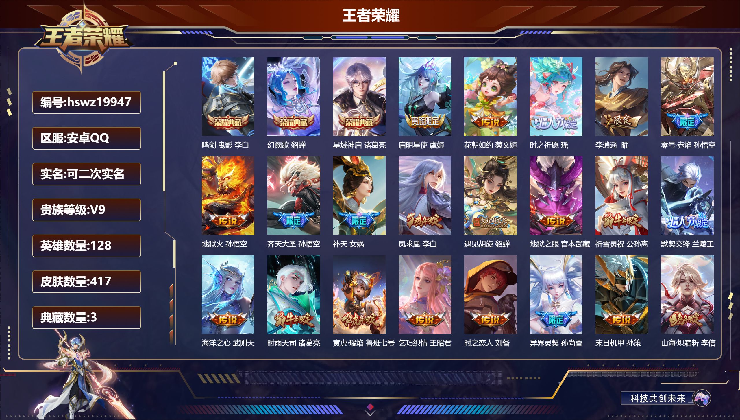 PX_2306422-Q/尊贵铂金/417皮肤/128英雄/3典藏/0珍品无双/0无双/0珍品传说/26传说/139史诗/10稀有英雄 【3,典藏皮肤】鸣剑·曳影,李白,幻阙歌,貂蝉,星域神启,诸葛亮, 【26,传说皮肤】启明星使,虞姬,花朝如约,蔡文姬,时之祈愿,瑶,李逍遥,,曜,零号·赤焰,孙悟空,地狱火,孙悟空,齐天大圣,孙悟空,补天,女娲,凤求凰,李白,遇见胡旋,貂蝉,地狱之眼,宫本武藏,祈雪灵祝,公孙离,默契交锋,兰陵王,海洋之心,武则天,时雨天司,诸葛亮,寅虎·瑞焰,鲁班七号,乞巧织情,王昭君,时之恋人,刘备,异界灵契,孙尚香,末日机甲,孙策,山海·炽霜斩,李信,淬星耀世,赵云,绛天战甲,铠,寅虎·赤拳,裴擒虎,神树通天,后羿,鸣野蒿,桑启, 【139,史诗皮肤】奔雷神使,牛魔,霸王别姬,项羽,乒乒小将,鲁班七号,时之奇旅,安琪拉,电玩小子,鲁班七号,末日机甲,吕布,白昼王子,嬴政,蔬乡物语,鲁班七号,紫霞仙子,露娜,百解令,蒙犽,高山流水,庄周,银河之约,李元芳,匿光追影者,镜,奇遇舞章,艾琳,真爱至上,周瑜,暗渊魔法,司马懿,暗影游猎,马可波罗,燃音魔法,高渐离,冰霜恋舞曲,干将莫邪,白鹤梁神女,大乔,苍穹之光,项羽,天秀·启明,杨戬,狮舞东方,鲁班七号,猫狗日记,大乔,德古拉伯爵,刘邦,心灵战警,亚瑟,巫礼祀神,少司缘,鬼剑武藏,宫本武藏,迷踪丽影,阿轲,星夜王子,白起,寅虎·心曲,杨玉环,无限星赏官,公孙离,地狱燃心,司空震,玉兔公主,公孙离,遇见飞天,杨玉环,摇滚巨星,嬴政,电玩高手,狂铁,冰锋战神,关羽,修罗,橘右京,拒霜思,嫦娥,魅力维加斯,妲己,黄金分割率,诸葛亮,乐园奇幻夜,钟馗,如梦令,嫦娥,偶像歌手,王昭君,霸王别姬,虞姬,女仆咖啡,妲己,白蛇,大乔,赏金猎手,澜,晚萤,娜可露露,猪悟能,猪八戒,遇见神鹿,瑶,舞动绿茵,蔡文姬,繁星吟游,蔡文姬,暗夜贵公子,嬴政,鹰眼统帅,狄仁杰,胡桃异想国,米莱狄,白晶晶,芈月,大圣娶亲,孙悟空,飞衡,韩信,孙行者,孙悟空,李小龙,裴擒虎,纤云弄巧,云中君,如梦令,后羿,龙骑士,墨子,金属风暴,墨子,逐梦之影,韩信,傲雪梅枪,韩信,玄嵩,庄周,特工魅影,百里守约,猫狗日记,孙策,原初追逐者,百里玄策,逐浪之夏,李元芳,时之祈愿,云中君,未来纪元,赵云,朱雀志,百里守约,黎明之约,雅典娜,石田雨龙,后羿,优雅恋人,嬴政,魔术师,狄仁杰,热力回旋,百里玄策,埋骨钱,暃,神威,马超,皇家上将,赵云,冰冠公主,雅典娜,至尊宝,孙悟空,涂山红红,少司缘,辉光之辰,后羿,功夫厨神,程咬金,梁祝,上官婉儿,天才门将,刘禅,圣诞恋歌,貂蝉,云间偶戏,元歌,水晶猎龙者,花木兰,决胜骁骑,关羽,百木心枪,赵云,一生所爱,露娜,御风骁将,吕布,圣诞狂欢,吕布,青焰无极,镜,魅语,不知火舞,白龙吟,韩信,夏日便利店,蔡文姬,岱宗,典韦,永昼,夏洛特,天狼溯光者,伽罗,地狱岩魂,廉颇,纯白花嫁,小乔,冰雪圆舞曲,甄姬,火炮绅士,黄忠,青蛇,小乔,默契交锋,花木兰,航海奇遇记,老夫子,千年之狐,李白,节奏热浪,阿轲,女儿国国王,甄姬,幽恒,甄姬,青春决赛季,花木兰,曙光守护者,铠,万灵启世,女娲,寅虎·展翼,孙膑,心灵骇客,安琪拉,寅虎·御盾,廉颇,乘龙·聚宝船,安琪拉,乱世虎臣,张飞,琥珀纪元,伽罗,龙胆,赵云,绅士熊喵,刘禅,缤纷独角兽,小乔,魔法小厨娘,安琪拉,蓝屏警告,典韦,真爱魔法,干将莫邪,时之恋人,孙尚香,水果甜心,孙尚香,狂想玩偶喵,蒙犽,江河有灵,阿古朵,幽灵船长,曹操,乘风破浪,夏侯惇,暗隐猎兽者,兰陵王, 【175,勇者皮肤】时空谍影,海诺,玲珑珍味,西施,圆桌骑士,盾山,烛龙,曹操,爱心护理,阿轲,太极少年,赵怀真,星际陆战队,达摩,沙漠行僧,达摩,大漠名商,沈梦溪,暖冬絮语,程咬金,缤纷绘卷,张良,纽约教父,刘备,拳王,达摩,大发明家,达摩,乐园追猎者,白起,丁香结,小乔,功夫炙烤,廉颇,铁甲之心,典韦,沉稳之力,孙尚香,幻夜卜梦,芈月,爱与正义,程咬金,海盐诗旅,桑启,幻泉雾影,海月,朔风刀,夏侯惇,醍醐杖,老夫子,朔望之晖,女娲,归虚梦演,孙膑,汉昭烈帝,刘备,白色死神,白起,黑桃队长,鲁班七号,黄金武士,典韦,夺宝奇兵,刘邦,御旌,牛魔,阴阳师,狄仁杰,炼金王,扁鹊,径山谋武,孙权,致命风华,阿轲,次元突破,哪吒,古海寻踪,张良,牛运亨通,牛魔,科学大爆炸,项羽,功夫老勺,老夫子,西部大镖客,牛魔,鲨炮海盗猫,沈梦溪,鲤鱼之梦,庄周,虎啸剑宗,刘邦,海滩派对,项羽,完美运算,后羿,万华元夜,狄仁杰,无尽征程,廉颇,克喵,鬼谷子,制霸全明星,牛魔,演武夺筹,程咬金,红桃皇后,芈月,奇妙博物学,庄周,西部游侠,莱西奥,蜃楼王,庄周,猎兽之王,吕布,野性能量,吕布,哥特玫瑰,露娜,守护之力,大乔,无双福将,程咬金,瓷语鉴心,露娜,原初探秘者,鬼谷子,星空之诺,沈梦溪,潮玩探月行,猪八戒,鸿运当头,亚瑟,天穹祈灯,鬼谷子,决胜大满贯,曹操,西部大镖客,猪八戒,疑决卦,明世隐,如懿,安琪拉,化身博士,扁鹊,潮玩骑士王,亚瑟,阿尔法小队,后羿,五福同心,张飞,金色潮汐,朵莉亚,狮心王,亚瑟,次元傲视,杨戬,星际陆战队,程咬金,幻乐之宴,鬼谷子,霸王丸,宫本武藏,虹云星官,明世隐,潮玩牛仔,马可波罗,救世之瞳,扁鹊,潮玩骑兵,杨戬,赤莲之焰,周瑜,死亡骑士,亚瑟,敏锐之力,李白,危途狂花,戈娅,破局者,亚连,幽兰居士,张良,玩偶对对碰,安琪拉,掌控之力,诸葛亮,海滩丽影,钟无艳,圣弓游侠,后羿,忍·炎影,赵云,狰,白起,重明,芈月,炽热元素使,姜子牙,坚韧之力,苏烈,万事如意,刘备,逐霄战戟,吕布,擒涛扼浪,裴擒虎,乓乓大师,鲁班大师,死亡摇滚,高渐离,妖精王,孙膑,