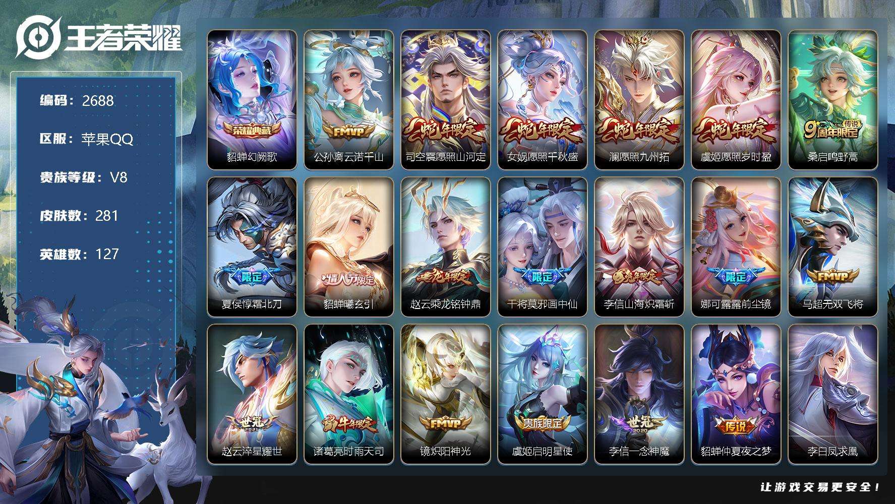 PX_2307158-贵族8/皮肤281/典藏1/传说22/史诗82/英雄127/李信全皮/幻阙歌/公孙离云诺千山/愿照·山河定/愿照·千秋盛/愿照·九州拓/愿照·岁时盈/鸣野蒿/霜北刀/貂蝉-曦玄引/乘龙·铭钟鼎/画中仙/山海·炽霜斩/前尘镜/无双飞将/淬星耀世/时雨天司/炽阳神光/启明星使/一念神魔/仲夏夜之梦/李白凤求凰/孙尚香-末日机甲/地狱之眼/顽岩魄/夏日便利店-蔡文姬/大乔绒语心约/夏日便利店-虞姬/