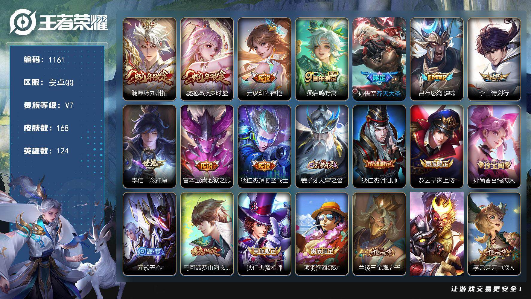 PX_2258966-【168皮10传说愿照九州拓,愿照岁时盈,齐天大圣,一念神魔】安卓Q-V7-最强王者段位-124英雄-168皮肤-0典藏-0珍品无双-0无双-0珍品传说-10传说-46史诗 【英雄全皮】:孙权全皮,赵怀真全皮,空空儿全皮 【传说皮肤】:澜愿照九州拓,虞姬愿照岁时盈,云缨幻光神枪,桑启鸣野蒿,孙悟空齐天大圣,吕布怒海麟威,李白诗剑行,李信一念神魔,宫本武藏地狱之眼,狄仁杰超时空战士 【限定皮肤】:姜子牙天穹之誓,狄仁杰阴阳师,赵云皇家上将,孙尚香蔷薇恋人,元歌无心,马可波罗山海玄木吟,狄仁杰魔术师,项羽海滩派对,兰陵王金庭之子,孙悟空齐天大圣,李元芳云中旅人,雅典娜黎明之约,鬼谷子五谷丰年,沈梦溪大漠名商,裴擒虎擒涛扼浪,上官婉儿梁祝,嫦娥暖冬兔眠,鲁班大师探海日志,桑启海盐诗旅,暃星界游侠,赵怀真鹤归松栖,阿古朵江河有灵,张良古海寻踪,蒙恬荣光圣徽,鬼谷子天穹祈灯,周瑜熔金海岸 【年限皮肤】:马可波罗山海玄木吟 【赛季限定】:兰陵王金庭之子,张良古海寻踪,李元芳云中旅人,雅典娜黎明之约,沈梦溪大漠名商,裴擒虎擒涛扼浪,鲁班大师探海日志,桑启海盐诗旅,鬼谷子天穹祈灯,蒙恬荣光圣徽,姜子牙天穹之誓 【战令限定】:嫦娥暖冬兔眠,暃星界游侠 【史诗皮肤】:赵云皇家上将,赵云未来纪元,貂蝉圣诞恋歌,甄姬冰雪圆舞曲,王昭君偶像歌手,狄仁杰魔术师,宫本武藏鬼剑武藏,孙尚香蔷薇恋人,孙尚香水果甜心,嬴政暗夜贵公子,墨子金属风暴,吕布圣诞狂欢,曹操幽灵船长,韩信白龙吟,花木兰水晶猎龙者,刘邦德古拉伯爵,夏侯惇乘风破浪,兰陵王暗隐猎兽者,诸葛亮黄金分割率,刘禅天才门将,李元芳逐浪之夏,程咬金功夫厨神,白起星夜王子,孙策猫狗日记,狄仁杰鹰眼统帅,上官婉儿梁祝,橘右京修罗,孙尚香时之恋人,西施诗语江南,杨戬天秀启明,雅典娜黎明之约,鬼谷子五谷丰年,元歌无心,暃星界游侠,马可波罗山海玄木吟,刘禅电玩爆裂旋风,赵怀真鹤归松栖,阿古朵江河有灵,蒙恬荣光圣徽,百里守约百相守梦,赵怀真器灵浮梦炉,阿轲化蝶舞,狂铁龙之律动,公孙离涂山容容,女娲万灵启世,少司缘巫礼祀神 【其他皮肤】:项羽海滩派对,韩信教廷特使,韩信街头霸王,露娜哥特玫瑰,赵云白执事,赵云忍炎影,芈月红桃皇后,白起白色死神,武则天东方不败,宫本武藏未来纪元,孙膑天使之翼,姜子牙时尚教父,妲己少女阿狸,典韦黄金武士,张飞五福同心,甄姬花好人间,刘备万事如意,后羿阿尔法小队,狄仁杰阴阳师,刘备纽约教父,钟无艳海滩丽影,王昭君幻想奇妙夜,狂铁命运角斗场,老夫子功夫老勺,诸葛亮掌控之力,鬼谷子幻乐之宴,大乔守护之力,明世隐虹云星官,小乔丁香结,吕布野性能量,沈梦溪鲨炮海盗猫,哪吒次元突破,狂铁特工战影,鲁班大师乓乓大师,兰陵王金庭之子,刘禅唤灵魔甲,沈梦溪大漠名商,蒙恬蔚蓝守将,李元芳云中旅人,桑启海盐诗旅,嫦娥暖冬兔眠,海月幻泉雾影,牛魔牛运亨通,白起乐园追猎者,赵怀真太极少年,裴擒虎擒涛扼浪,太乙真人劲辣红锅,莱西奥西部游侠,鲁班大师探海日志,李元芳妄想特派,哪吒热血海滩,张良古海寻踪,钟无艳聚星闪耀,海月王牌新星,后羿完美运算,鬼谷子天穹祈灯,廉颇功夫炙烤,姜子牙天穹之誓,周瑜熔金海岸,盘古敬我三分,东皇太一噬灭天穹,老夫子百相守梦,干将莫邪雾都夜雨,苍苍林狼骑,太乙真人谧流熔炉,典韦铁骨偃魂,西施雪境奇遇,姜子牙星梦巡礼,少司缘灵卦秘语,明世隐景韶洛都,戈娅玫蓝誓约,刘备浪漫序章,钟馗虚灵犬护,苏烈春野闲踪,张良灵野札记,阿古朵布丁狗之约,露娜命运加冕,姬小满小满鸭,空空儿戏梦巡演,莱西奥踏浪烽翎,哪吒罗小黑战记,孙权径山谋武,艾琳鹤鸣心笺,曹操逐霄之志,貂蝉异域舞娘,王昭君精灵公主,曹操超能战警,孙悟空西部大镖客,周瑜海军大将,后羿精灵王,钟馗地府判官,关羽天启骑士,蔡文姬蔷薇王座,马可波罗激情绿茵,苍维京掠夺者,诸葛亮星航指挥官,黄忠芝加哥教父,鬼谷子阿摩司公爵,铠龙域领主,百里守约绝影神枪,苏烈爱与和平,米莱狄精准探案法,元歌午夜歌剧院,司马懿魇语军师,伽罗花见巫女,李信灼热之刃,曜归虚梦演,马超幸存者,镜冰刃幻境,澜孤猎,司空震启蛰,云缨赤焰之缨 【内测皮肤】:孙尚香蔷薇恋人,狂铁特工战影 【营地ID】:1793741293