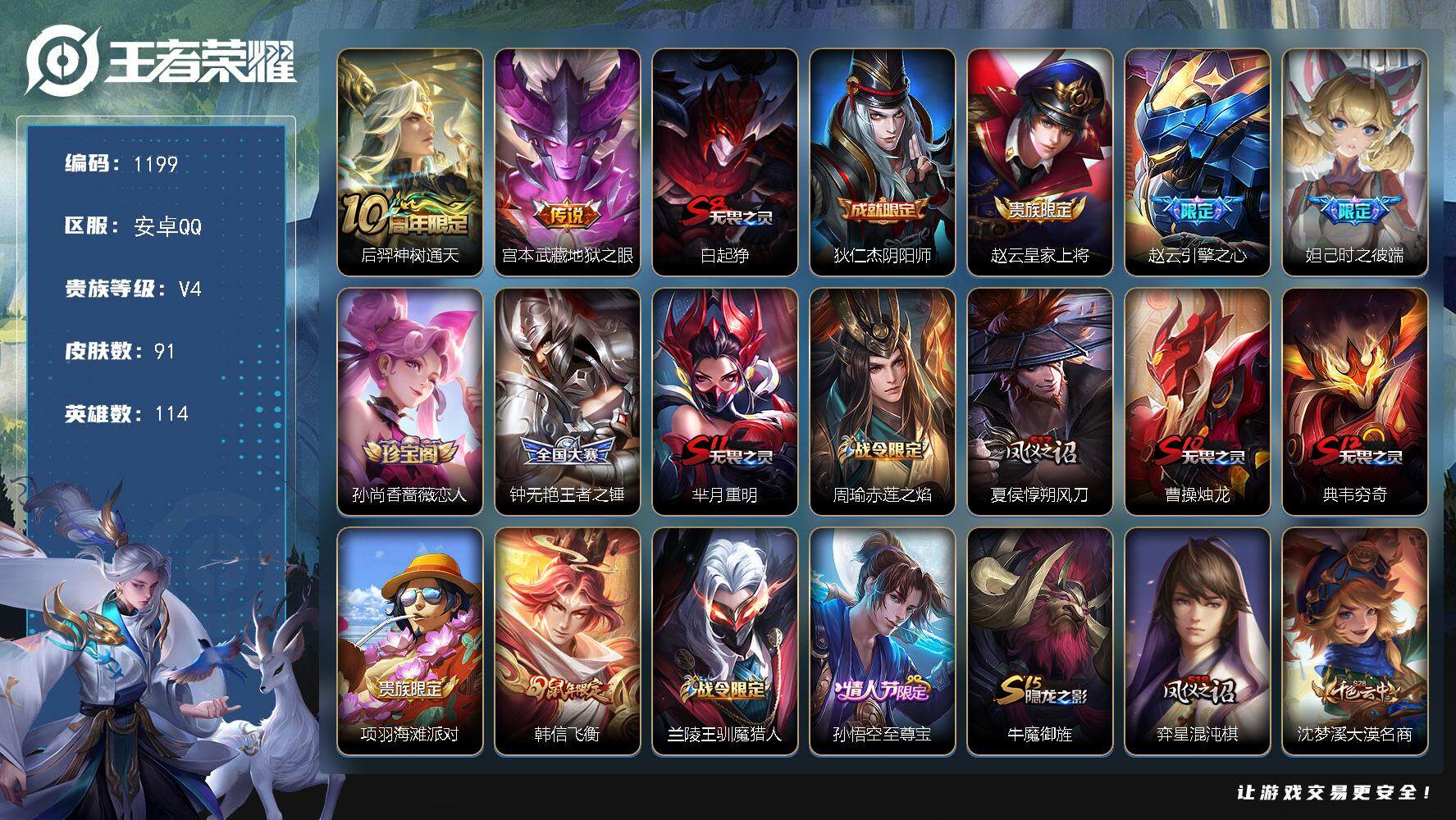 PX_2267233-【91皮2传说,地狱之眼,至尊宝】安卓Q-V4-荣耀黄金I段位-114英雄-91皮肤-0典藏-0珍品无双-0无双-0珍品传说-2传说-19史诗 【传说皮肤】:后羿神树通天,宫本武藏地狱之眼 【限定皮肤】:白起狰,狄仁杰阴阳师,赵云皇家上将,赵云引擎之心,妲己时之彼端,孙尚香蔷薇恋人,钟无艳王者之锤,芈月重明,周瑜赤莲之焰,夏侯惇朔风刀,曹操烛龙,典韦穷奇,项羽海滩派对,韩信飞衡,兰陵王驯魔猎人,孙悟空至尊宝,牛魔御旌,弈星混沌棋,沈梦溪大漠名商,明世隐疑决卦,裴擒虎李小龙,狂铁御狮,米莱狄御霄,盾山御銮,上官婉儿梁祝,鲁班大师探海日志,桑启海盐诗旅,张良古海寻踪,鬼谷子天穹祈灯,刘邦剑破天穹 【年限皮肤】:韩信飞衡 【赛季限定】:白起狰,芈月重明,夏侯惇朔风刀,曹操烛龙,典韦穷奇,张良古海寻踪,牛魔御旌,弈星混沌棋,沈梦溪大漠名商,明世隐疑决卦,狂铁御狮,米莱狄御霄,盾山御銮,鲁班大师探海日志,桑启海盐诗旅,鬼谷子天穹祈灯,刘邦剑破天穹 【战令限定】:周瑜赤莲之焰,兰陵王驯魔猎人 【史诗皮肤】:钟无艳王者之锤,赵云皇家上将,赵云未来纪元,甄姬冰雪圆舞曲,孙尚香蔷薇恋人,孙尚香水果甜心,墨子金属风暴,吕布末日机甲,孙悟空至尊宝,赵云引擎之心,刘邦德古拉伯爵,李元芳逐浪之夏,白起星夜王子,狄仁杰鹰眼统帅,兰陵王驯魔猎人,上官婉儿梁祝,韩信飞衡,妲己时之彼端,裴擒虎李小龙 【其他皮肤】:项羽海滩派对,韩信教廷特使,韩信街头霸王,露娜哥特玫瑰,达摩大发明家,赵云白执事,赵云忍炎影,牛魔西部大镖客,扁鹊化身博士,妲己少女阿狸,亚瑟死亡骑士,达摩拳王,张飞五福同心,狄仁杰阴阳师,白起狰,钟无艳海滩丽影,曹操烛龙,芈月重明,狂铁命运角斗场,老夫子功夫老勺,典韦穷奇,鬼谷子幻乐之宴,狂铁御狮,米莱狄御霄,明世隐虹云星官,牛魔御旌,吕布野性能量,盾山御銮,夏侯惇朔风刀,周瑜赤莲之焰,弈星混沌棋,哪吒次元突破,明世隐疑决卦,盾山圆桌骑士,刘禅秘密基地,沈梦溪大漠名商,桑启海盐诗旅,猪八戒潮玩探月行,鲁班大师探海日志,张良古海寻踪,钟无艳聚星闪耀,亚连破局者,鬼谷子天穹祈灯,廉颇功夫炙烤,刘邦剑破天穹,太乙真人谧流熔炉,钟馗虚灵犬护,露娜命运加冕,白起死霸装,亚瑟荣光之誓,艾琳鹤鸣心笺,鲁班七号福禄兄弟,鲁班七号木偶奇遇记,高渐离金属狂潮,钟无艳生化警戒,孙悟空西部大镖客,后羿精灵王,刘禅英喵野望,兰陵王隐刃,关羽天启骑士,马可波罗激情绿茵,大乔伊势巫女,干将莫邪第七人偶,鬼谷子阿摩司公爵,百里守约绝影神枪,女娲尼罗河女神,李信灼热之刃,上官婉儿修竹墨客,蒙恬秩序猎龙将,澜孤猎 【内测皮肤】:孙尚香蔷薇恋人 【营地ID】:425921721