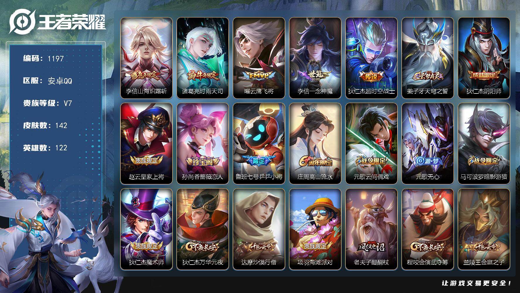 PX_2267235-【142皮5传说,山海炽霜斩,时雨天司,一念神魔,李信全皮】安卓Q-V7-最强王者段位-122英雄-142皮肤-0典藏-0珍品无双-0无双-0珍品传说-5传说-37史诗 【英雄全皮】:李信全皮 【传说皮肤】:李信山海炽霜斩,诸葛亮时雨天司,曜云鹰飞将,李信一念神魔,狄仁杰超时空战士 【限定皮肤】:姜子牙天穹之誓,狄仁杰阴阳师,赵云皇家上将,孙尚香蔷薇恋人,鲁班七号乒乒小将,庄周高山流水,元歌云间偶戏,元歌无心,马可波罗暗影游猎,狄仁杰魔术师,狄仁杰万华元夜,达摩沙漠行僧,项羽海滩派对,老夫子醍醐杖,程咬金演武夺筹,兰陵王金庭之子,花木兰默契交锋,亚瑟潮玩骑士王,李元芳云中旅人,钟馗驱傩正仪,蔡文姬繁星吟游,鬼谷子原初探秘者,鬼谷子五谷丰年,诸葛亮时雨天司,苏烈千军破阵,百里玄策原初追逐者,沈梦溪大漠名商,明世隐疑决卦,裴擒虎李小龙,裴擒虎擒涛扼浪,云中君纤云弄巧,李信山海炽霜斩,猪八戒西部大镖客,鲁班大师探海日志,桑启海盐诗旅,艾琳流音漫舞,司空震地狱燃心,阿古朵江河有灵,张良古海寻踪,鬼谷子天穹祈灯,姬小满妄想食味,沈梦溪龙舞盛年,刘邦剑破天穹,程咬金群星魔术团 【年限皮肤】:诸葛亮时雨天司,李信山海炽霜斩 【赛季限定】:狄仁杰万华元夜,达摩沙漠行僧,老夫子醍醐杖,程咬金演武夺筹,兰陵王金庭之子,张良古海寻踪,李元芳云中旅人,钟馗驱傩正仪,鬼谷子原初探秘者,苏烈千军破阵,百里玄策原初追逐者,沈梦溪大漠名商,明世隐疑决卦,裴擒虎擒涛扼浪,鲁班大师探海日志,桑启海盐诗旅,鬼谷子天穹祈灯,刘邦剑破天穹,姜子牙天穹之誓 【战令限定】:元歌云间偶戏,马可波罗暗影游猎,艾琳流音漫舞,亚瑟潮玩骑士王,猪八戒西部大镖客,司空震地狱燃心 【史诗皮肤】:赵云皇家上将,赵云未来纪元,甄姬冰雪圆舞曲,狄仁杰魔术师,孙尚香蔷薇恋人,孙尚香水果甜心,妲己魅力维加斯,妲己女仆咖啡,墨子金属风暴,曹操幽灵船长,吕布末日机甲,花木兰水晶猎龙者,刘邦德古拉伯爵,夏侯惇乘风破浪,诸葛亮黄金分割率,亚瑟心灵战警,百里守约特工魅影,白起星夜王子,阿轲节奏热浪,狄仁杰鹰眼统帅,蔡文姬繁星吟游,娜可露露晚萤,不知火舞魅语,橘右京修罗,马可波罗暗影游猎,百里玄策原初追逐者,裴擒虎李小龙,云中君纤云弄巧,元歌云间偶戏,花木兰默契交锋,鲁班七号乒乒小将,庄周高山流水,鬼谷子五谷丰年,元歌无心,司空震地狱燃心,阿古朵江河有灵,姬小满妄想食味 【其他皮肤】:项羽海滩派对,韩信教廷特使,韩信街头霸王,露娜哥特玫瑰,达摩大发明家,赵云忍炎影,白起白色死神,牛魔西部大镖客,扁鹊化身博士,宫本武藏未来纪元,妲己少女阿狸,典韦黄金武士,亚瑟死亡骑士,达摩拳王,花木兰兔女郎,张飞五福同心,刘备万事如意,狄仁杰阴阳师,刘备纽约教父,刘备汉昭烈帝,钟无艳海滩丽影,老夫子功夫老勺,孙尚香沉稳之力,诸葛亮掌控之力,明世隐虹云星官,庄周奇妙博物学,吕布野性能量,明世隐疑决卦,老夫子醍醐杖,猪八戒西部大镖客,狂铁特工战影,鬼谷子原初探秘者,狄仁杰万华元夜,亚瑟潮玩骑士王,刘禅秘密基地,露娜瓷语鉴心,程咬金演武夺筹,张良缤纷绘卷,钟馗驱傩正仪,鲁班大师乓乓大师,苏烈千军破阵,达摩沙漠行僧,程咬金无双福将,兰陵王金庭之子,沈梦溪大漠名商,蒙犽胡桃狂想曲,蒙恬蔚蓝守将,李元芳云中旅人,桑启海盐诗旅,猪八戒潮玩探月行,牛魔牛运亨通,裴擒虎擒涛扼浪,太乙真人劲辣红锅,鲁班大师探海日志,李元芳妄想特派,艾琳流音漫舞,张良古海寻踪,钟无艳聚星闪耀,后羿完美运算,鬼谷子天穹祈灯,廉颇功夫炙烤,沈梦溪龙舞盛年,刘邦剑破天穹,程咬金群星魔术团,姜子牙天穹之誓,东皇太一噬灭天穹,钟馗虚灵犬护,鲁班七号福禄兄弟,露娜绯红之刃,花木兰剑舞者,狄仁杰锦衣卫,曹操超能战警,张良一千零一夜,李元芳特种部队,蔡文姬蔷薇王座,诸葛亮星航指挥官,干将莫邪第七人偶,鬼谷子阿摩司公爵,百里守约绝影神枪,百里玄策威尼斯狂欢,梦奇美梦成真,公孙离花间舞,杨玉环霓裳曲,弈星踏雪寻梅,元歌午夜歌剧院,司马懿魇语军师,盾山极冰防御线,伽罗花见巫女,李信灼热之刃,上官婉儿修竹墨客,盘古创世神祝,云中君荷鲁斯之眼,曜归虚梦演,马超幸存者,西施归虚梦演,镜冰刃幻境,蒙恬秩序猎龙将,澜孤猎,司空震启蛰,金蝉前尘 【内测皮肤】:孙尚香蔷薇恋人,狂铁特工战影 【营地ID】:1865859351