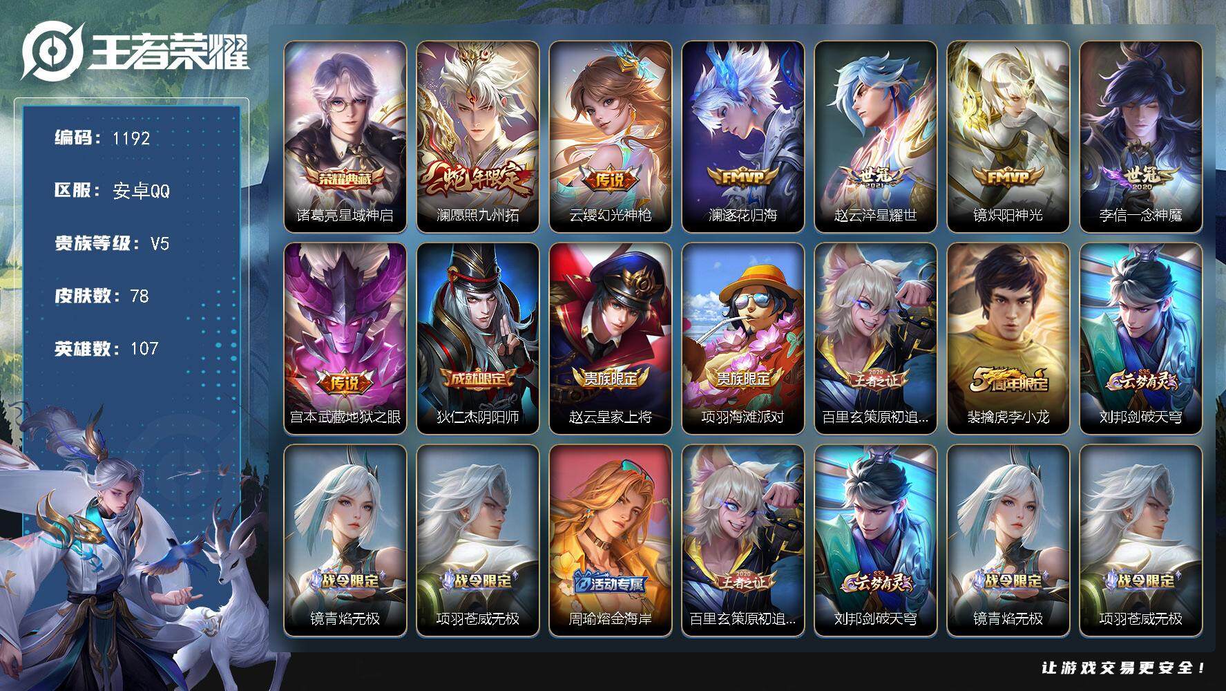 PX_2268421-【诸葛亮典藏,澜愿照九州拓,澜逐花归海,赵云淬星耀世】安卓Q-V5-最强王者段位-107英雄-78皮肤-1典藏-0珍品无双-0无双-0珍品传说-7传说-21史诗 【荣耀典藏】:诸葛亮星域神启 【传说皮肤】:澜愿照九州拓,云缨幻光神枪,澜逐花归海,赵云淬星耀世,镜炽阳神光,李信一念神魔,宫本武藏地狱之眼 【限定皮肤】:狄仁杰阴阳师,赵云皇家上将,项羽海滩派对,百里玄策原初追逐者,裴擒虎李小龙,刘邦剑破天穹,镜青焰无极,项羽苍威无极,周瑜熔金海岸 【赛季限定】:百里玄策原初追逐者,刘邦剑破天穹 【战令限定】:镜青焰无极,项羽苍威无极 【史诗皮肤】:赵云皇家上将,赵云未来纪元,宫本武藏鬼剑武藏,孙尚香水果甜心,嬴政摇滚巨星,妲己魅力维加斯,曹操幽灵船长,张飞乱世虎臣,花木兰水晶猎龙者,亚瑟心灵战警,刘禅天才门将,程咬金功夫厨神,狄仁杰鹰眼统帅,百里玄策原初追逐者,裴擒虎李小龙,司马懿暗渊魔法,镜青焰无极,黄忠怒海争锋,狂铁龙之律动,百里守约雪豹霜爪,少司缘巫礼祀神 【其他皮肤】:项羽海滩派对,韩信街头霸王,阿轲爱心护理,达摩大发明家,赵云忍炎影,白起白色死神,安琪拉玩偶对对碰,孙膑天使之翼,典韦黄金武士,亚瑟死亡骑士,花木兰兔女郎,狄仁杰阴阳师,刘备纽约教父,小乔丁香结,海月幻泉雾影,猪八戒潮玩探月行,海诺时空谍影,刘邦剑破天穹,项羽苍威无极,大司命暗都幽影,周瑜熔金海岸,太乙真人谧流熔炉,西施雪境奇遇,戈娅玫蓝誓约,刘备浪漫序章,钟馗虚灵犬护,苏烈春野闲踪,张良灵野札记,阿古朵布丁狗之约,露娜命运加冕,雅典娜潮玩士官长,甄姬逆浪荇歌,哪吒罗小黑战记,亚瑟荣光之誓,张良罗小黑战记,艾琳鹤鸣心笺,曹操逐霄之志,钟无艳生化警戒,孙悟空西部大镖客,李白范海辛,钟馗地府判官,公孙离花间舞,弈星踏雪寻梅,司马懿魇语军师,李信灼热之刃,盘古创世神祝,马超幸存者,鲁班大师归虚梦演,金蝉前尘 【营地ID】:1674187354