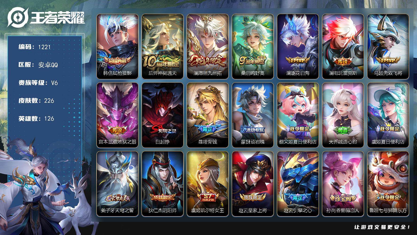 PX_2268382-【韩信典藏,澜多皮号,至尊宝,打野小号】安卓Q-V6-最强王者段位-126英雄-226皮肤-1典藏-0珍品无双-0无双-0珍品传说-7传说-56史诗 【荣耀典藏】:韩信弑枪猎影 【传说皮肤】:后羿神树通天,澜愿照九州拓,桑启鸣野蒿,澜逐花归海,澜电玩雷克斯,马超无双飞将,宫本武藏地狱之眼 【限定皮肤】:白起狰,暃埋骨钱,蒙犽顽岩魄,蔡文姬夏日便利店,大乔绒语心约,虞姬夏日便利店,姜子牙天穹之誓,狄仁杰阴阳师,虞姬凯尔特女王,赵云皇家上将,赵云引擎之心,孙尚香蔷薇恋人,鲁班七号狮舞东方,孙膑妖精王,扁鹊炼金王,芈月重明,元歌云间偶戏,夏侯惇朔风刀,曹操烛龙,典韦穷奇,狄仁杰魔术师,狄仁杰万华元夜,项羽海滩派对,老夫子醍醐杖,程咬金演武夺筹,韩信飞衡,兰陵王金庭之子,亚瑟潮玩骑士王,孙悟空至尊宝,李元芳银河之约,李元芳云中旅人,钟馗神迹守卫,钟馗驱傩正仪,干将莫邪胡桃夹子,雅典娜单词大作战,雅典娜黎明之约,蔡文姬繁星吟游,太乙真人饕餮,鬼谷子原初探秘者,百里玄策原初追逐者,弈星混沌棋,梦奇顽趣,沈梦溪星空之诺,沈梦溪大漠名商,明世隐疑决卦,裴擒虎李小龙,裴擒虎擒涛扼浪,米莱狄御霄,云中君纤云弄巧,盾山御銮,上官婉儿梁祝,蒙犽狂想玩偶喵,桑启海盐诗旅,高渐离燃音魔法,鬼谷子天穹祈灯,沈梦溪龙舞盛年,刘邦剑破天穹,周瑜熔金海岸 【年限皮肤】:韩信飞衡 【赛季限定】:孙膑妖精王,扁鹊炼金王,白起狰,芈月重明,夏侯惇朔风刀,曹操烛龙,典韦穷奇,狄仁杰万华元夜,老夫子醍醐杖,程咬金演武夺筹,兰陵王金庭之子,李元芳云中旅人,虞姬凯尔特女王,钟馗驱傩正仪,雅典娜黎明之约,太乙真人饕餮,鬼谷子原初探秘者,百里玄策原初追逐者,弈星混沌棋,梦奇顽趣,沈梦溪大漠名商,明世隐疑决卦,裴擒虎擒涛扼浪,米莱狄御霄,盾山御銮,桑启海盐诗旅,鬼谷子天穹祈灯,刘邦剑破天穹,姜子牙天穹之誓 【战令限定】:蔡文姬夏日便利店,虞姬夏日便利店,鲁班七号狮舞东方,元歌云间偶戏,亚瑟潮玩骑士王,李元芳银河之约,钟馗神迹守卫,雅典娜单词大作战,沈梦溪星空之诺,蒙犽狂想玩偶喵,高渐离燃音魔法 【史诗皮肤】:露娜紫霞仙子,赵云皇家上将,貂蝉圣诞恋歌,王昭君偶像歌手,狄仁杰魔术师,廉颇地狱岩魂,宫本武藏鬼剑武藏,孙尚香蔷薇恋人,孙尚香水果甜心,嬴政暗夜贵公子,嬴政摇滚巨星,妲己魅力维加斯,墨子龙骑士,吕布圣诞狂欢,曹操幽灵船长,李白千年之狐,张飞乱世虎臣,韩信白龙吟,孙悟空至尊宝,赵云引擎之心,刘邦德古拉伯爵,夏侯惇乘风破浪,小乔缤纷独角兽,兰陵王暗隐猎兽者,安琪拉心灵骇客,蔡文姬舞动绿茵,程咬金功夫厨神,白起星夜王子,阿轲节奏热浪,孙策猫狗日记,鲁班七号狮舞东方,狄仁杰鹰眼统帅,上官婉儿梁祝,蔡文姬繁星吟游,李元芳银河之约,韩信飞衡,蒙犽狂想玩偶喵,百里玄策原初追逐者,裴擒虎李小龙,云中君纤云弄巧,元歌云间偶戏,杨戬天秀启明,钟馗乐园奇幻夜,雅典娜黎明之约,梦奇顽趣,高渐离燃音魔法,蔡文姬夏日便利店,蒙犽顽岩魄,暃埋骨钱,牛魔星界战将,孙膑茶境仙,阿轲化蝶舞,狂铁龙之律动,莱西奥光弋星穹,女娲万灵启世,少司缘巫礼祀神 【其他皮肤】:项羽海滩派对,韩信教廷特使,韩信街头霸王,露娜哥特玫瑰,阿轲致命风华,赵云白执事,赵云忍炎影,白起白色死神,扁鹊化身博士,孙膑天使之翼,姜子牙时尚教父,妲己少女阿狸,典韦黄金武士,亚瑟死亡骑士,达摩拳王,花木兰兔女郎,甄姬花好人间,后羿阿尔法小队,狄仁杰阴阳师,刘备纽约教父,孙膑妖精王,刘备汉昭烈帝,扁鹊炼金王,关羽龙腾万里,虞姬凯尔特女王,白起狰,钟无艳海滩丽影,太乙真人饕餮,宫本武藏霸王丸,曹操烛龙,王昭君幻想奇妙夜,芈月重明,老夫子功夫老勺,典韦穷奇,诸葛亮掌控之力,鬼谷子幻乐之宴,安琪拉如懿,苏烈坚韧之力,大乔守护之力,项羽科学大爆炸,米莱狄御霄,明世隐虹云星官,庄周奇妙博物学,小乔丁香结,吕布野性能量,钟馗神迹守卫,盾山御銮,孙膑归虚梦演,沈梦溪鲨炮海盗猫,姜子牙炽热元素使,夏侯惇朔风刀,沈梦溪星空之诺,弈星混沌棋,哪吒次元突破,明世隐疑决卦,盾山圆桌骑士,老夫子醍醐杖,廉颇无尽征程,鬼谷子原初探秘者,雅典娜单词大作战,狄仁杰万华元夜,亚瑟潮玩骑士王,刘禅秘密基地,杨戬次元傲视,程咬金演武夺筹,张良缤纷绘卷,钟馗驱傩正仪,鲁班大师乓乓大师,干将莫邪胡桃夹子,程咬金无双福将,兰陵王金庭之子,刘禅唤灵魔甲,沈梦溪大漠名商,蒙恬蔚蓝守将,李元芳云中旅人,桑启海盐诗旅,猪八戒潮玩探月行,裴擒虎擒涛扼浪,莱西奥西部游侠,鬼谷子天穹祈灯,廉颇功夫炙烤,沈梦溪龙舞盛年,刘邦剑破天穹,貂蝉长夏之忆,姜子牙天穹之誓,周瑜熔金海岸,虞姬夏日便利店,大乔绒语心约,东皇太一噬灭天穹,苍苍林狼骑,太乙真人谧流熔炉,马超访茗客,西施雪境奇遇,姜子牙星梦巡礼,东皇太一金福满堂,明世隐景韶洛都,戈娅玫蓝誓约,刘备浪漫序章,苏烈春野闲踪,甄姬逆浪荇歌,庄周锦麟游梦,莱西奥踏浪烽翎,鬼谷子克喵,哪吒罗小黑战记,亚瑟荣光之誓,明世隐往忆晖光,张良罗小黑战记,艾琳鹤鸣心笺,露娜绯红之刃,钟无艳生化警戒,貂蝉异域舞娘,花木兰剑舞者,老夫子潮流仙人,狄仁杰锦衣卫,曹操死神来了,曹操超能战警,小乔万圣前夜,孙悟空西部大镖客,周瑜海军大将,后羿精灵王,李白范海辛,钟馗地府判官,李元芳特种部队,虞姬加勒比小姐,