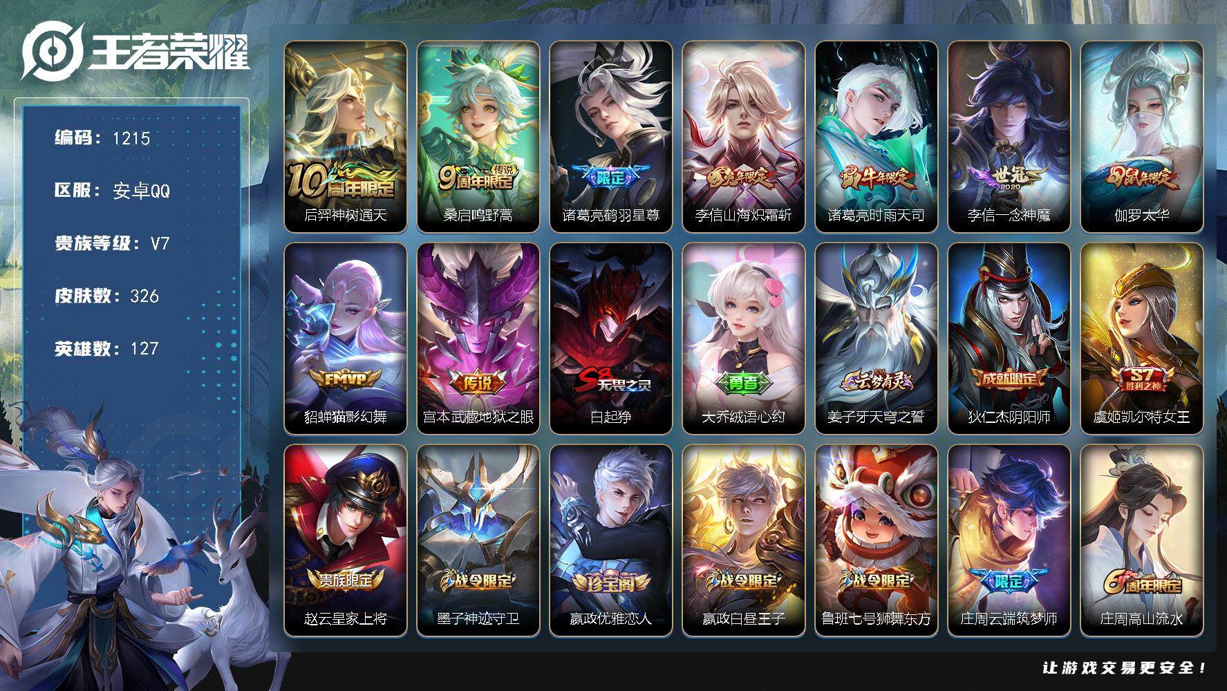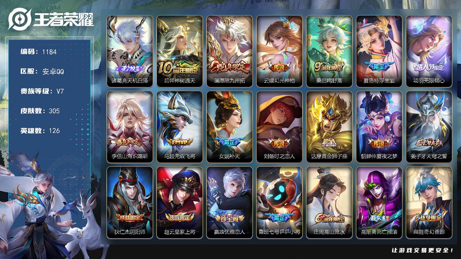 PX_2268439-【305皮1无双12传说,天机白泽,浮生妄,无限倾心,无双飞将,至尊宝】安卓Q-V7-最强王者段位-126英雄-305皮肤-0典藏-0珍品无双-1无双-0珍品传说-12传说-88史诗 【英雄全皮】:刘禅全皮,孙权全皮,鬼谷子全皮,蒙恬全皮,空空儿全皮,影全皮 【无双皮肤】:诸葛亮天机白泽 【传说皮肤】:后羿神树通天,澜愿照九州拓,云缨幻光神枪,桑启鸣野蒿,夏洛特浮生妄,项羽无限倾心,李信山海炽霜斩,马超无双飞将,女娲补天,刘备时之恋人,达摩黄金狮子座,貂蝉仲夏夜之梦 【限定皮肤】:姜子牙天穹之誓,狄仁杰阴阳师,赵云皇家上将,嬴政优雅恋人,鲁班七号乒乒小将,庄周高山流水,高渐离死亡摇滚,扁鹊奇幻香踪,吕布御风骁将,元歌云间偶戏,元歌无心,甄姬游园惊梦,马可波罗山海玄木吟,狄仁杰魔术师,狄仁杰万华元夜,达摩星际陆战队,达摩沙漠行僧,项羽海滩派对,项羽无限倾心,老夫子醍醐杖,老夫子航海奇遇记,程咬金演武夺筹,王昭君午后时光,兰陵王金庭之子,亚瑟潮玩骑士王,孙悟空至尊宝,后羿辉光之辰,后羿圣弓游侠,李元芳云中旅人,钟馗驱傩正仪,杨戬潮玩骑兵,女娲补天,干将莫邪胡桃夹子,干将莫邪真爱魔法,雅典娜黎明之约,太乙真人华丽摇滚,鬼谷子原初探秘者,鬼谷子五谷丰年,铠青龙志,苏烈千军破阵,百里玄策原初追逐者,百里守约朱雀志,梦奇顽趣,沈梦溪大漠名商,明世隐疑决卦,裴擒虎李小龙,裴擒虎擒涛扼浪,狂铁电玩高手,米莱狄胡桃异想国,云中君纤云弄巧,李信山海炽霜斩,嫦娥拒霜思,嫦娥暖冬兔眠,西施玲珑珍味,鲁班大师探海日志,镜匿光追影者,桑启海盐诗旅,夏洛特浮生妄,暃星界游侠,戈娅驭风魔法,艾琳女武神,艾琳流音漫舞,司空震地狱燃心,阿古朵江河有灵,张良古海寻踪,蒙犽百解令,蒙恬荣光圣徽,高渐离燃音魔法,鬼谷子天穹祈灯,刘邦剑破天穹,程咬金群星魔术团,镜青焰无极,刘备异域游侠,周瑜熔金海岸 【年限皮肤】:百里守约朱雀志,铠青龙志,后羿辉光之辰,吕布御风骁将,马可波罗山海玄木吟,李信山海炽霜斩 【赛季限定】:狄仁杰万华元夜,达摩沙漠行僧,老夫子醍醐杖,程咬金演武夺筹,兰陵王金庭之子,张良古海寻踪,李元芳云中旅人,钟馗驱傩正仪,雅典娜黎明之约,鬼谷子原初探秘者,苏烈千军破阵,百里玄策原初追逐者,梦奇顽趣,沈梦溪大漠名商,明世隐疑决卦,裴擒虎擒涛扼浪,鲁班大师探海日志,桑启海盐诗旅,鬼谷子天穹祈灯,蒙恬荣光圣徽,刘邦剑破天穹,姜子牙天穹之誓 【战令限定】:扁鹊奇幻香踪,元歌云间偶戏,达摩星际陆战队,老夫子航海奇遇记,王昭君午后时光,艾琳流音漫舞,亚瑟潮玩骑士王,后羿圣弓游侠,杨戬潮玩骑兵,干将莫邪真爱魔法,狂铁电玩高手,米莱狄胡桃异想国,嫦娥暖冬兔眠,西施玲珑珍味,司空震地狱燃心,暃星界游侠,戈娅驭风魔法,高渐离燃音魔法,镜青焰无极 【史诗皮肤】:鲁班七号电玩小子,项羽苍穹之光,赵云皇家上将,赵云未来纪元,貂蝉圣诞恋歌,甄姬冰雪圆舞曲,王昭君偶像歌手,狄仁杰魔术师,廉颇地狱岩魂,宫本武藏鬼剑武藏,孙尚香水果甜心,嬴政优雅恋人,嬴政摇滚巨星,妲己魅力维加斯,妲己女仆咖啡,墨子金属风暴,吕布圣诞狂欢,刘禅绅士熊喵,曹操幽灵船长,李白千年之狐,张飞乱世虎臣,孙悟空至尊宝,花木兰水晶猎龙者,刘邦德古拉伯爵,夏侯惇乘风破浪,小乔缤纷独角兽,兰陵王暗隐猎兽者,诸葛亮黄金分割率,甄姬游园惊梦,亚瑟心灵战警,雅典娜冰冠公主,安琪拉心灵骇客,后羿辉光之辰,百里守约特工魅影,铠曙光守护者,蔡文姬舞动绿茵,刘禅天才门将,李元芳逐浪之夏,程咬金功夫厨神,白起星夜王子,阿轲节奏热浪,铠青龙志,百里守约朱雀志,伽罗箭羽风息,狄仁杰鹰眼统帅,孙尚香时之恋人,百里玄策原初追逐者,裴擒虎李小龙,云中君纤云弄巧,元歌云间偶戏,吕布御风骁将,米莱狄胡桃异想国,老夫子航海奇遇记,鲁班七号乒乒小将,杨戬天秀启明,干将莫邪真爱魔法,庄周高山流水,嫦娥拒霜思,镜匿光追影者,雅典娜黎明之约,高渐离天秀音浪,狂铁电玩高手,鬼谷子五谷丰年,元歌无心,梦奇顽趣,暃星界游侠,马可波罗山海玄木吟,扁鹊奇幻香踪,刘禅电玩爆裂旋风,戈娅驭风魔法,司空震地狱燃心,阿古朵江河有灵,蒙犽百解令,高渐离燃音魔法,蒙恬荣光圣徽,镜青焰无极,黄忠怒海争锋,牛魔星界战将,孙膑茶境仙,赵怀真器灵浮梦炉,刘禅鸭鸭历险记,狂铁龙之律动,扁鹊灵蛊蚀心,后羿石田雨龙,周瑜百相守梦,黄忠百相守梦,公孙离涂山容容,少司缘巫礼祀神 【其他皮肤】:项羽海滩派对,韩信教廷特使,韩信街头霸王,露娜哥特玫瑰,阿轲爱心护理,达摩大发明家,赵云白执事,赵云忍炎影,芈月红桃皇后,艾琳女武神,白起白色死神,牛魔西部大镖客,扁鹊化身博士,扁鹊救世之瞳,安琪拉玩偶对对碰,孙膑天使之翼,姜子牙时尚教父,典韦黄金武士,亚瑟死亡骑士,花木兰兔女郎,张飞五福同心,甄姬花好人间,刘备万事如意,宫本武藏万象初新,后羿阿尔法小队,狄仁杰阴阳师,刘备纽约教父,高渐离死亡摇滚,刘备汉昭烈帝,关羽龙腾万里,钟无艳海滩丽影,宫本武藏霸王丸,老夫子功夫老勺,孙尚香沉稳之力,诸葛亮掌控之力,李白敏锐之力,鬼谷子幻乐之宴,太乙真人华丽摇滚,苏烈坚韧之力,大乔守护之力,项羽科学大爆炸,明世隐虹云星官,庄周奇妙博物学,小乔丁香结,吕布野性能量,孙膑归虚梦演,沈梦溪鲨炮海盗猫,姜子牙炽热元素使,哪吒次元突破,明世隐疑决卦,盾山