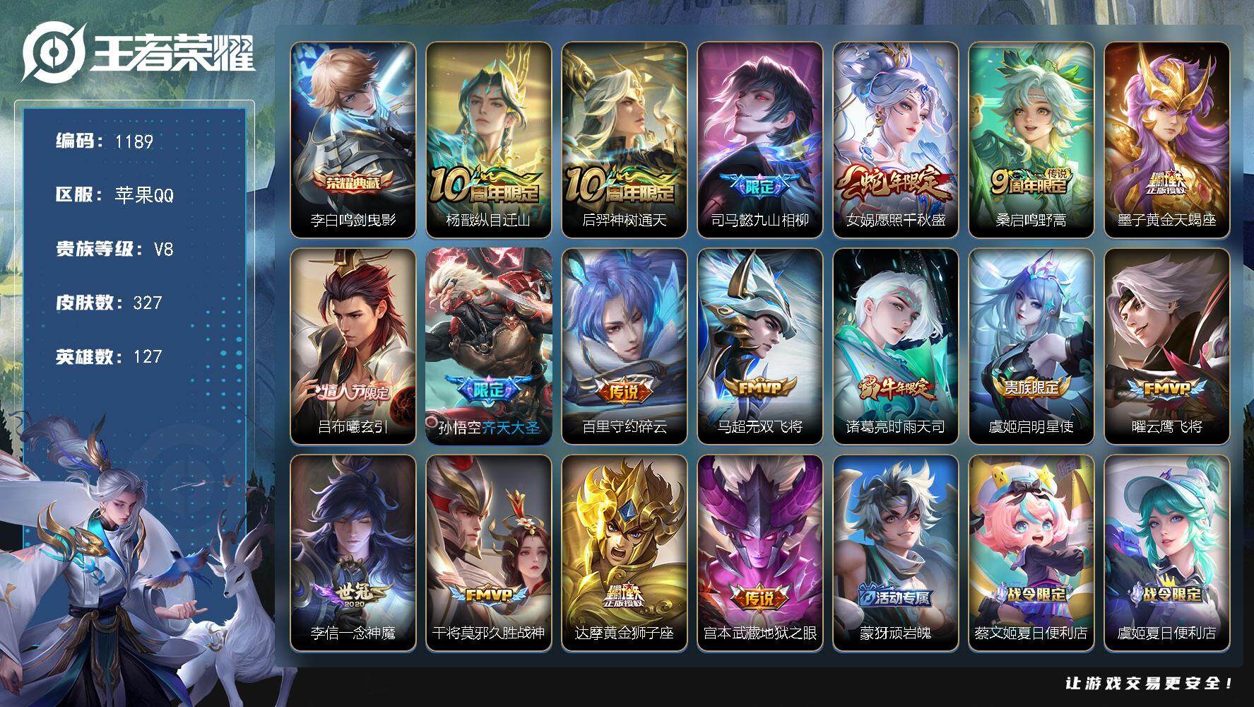 PX_2268424-【327皮17传说,齐天大圣云鹰飞将至尊宝】苹果Q-V8-最强王者段位-127英雄-327皮肤-1典藏-0珍品无双-0无双-0珍品传说-17传说-97史诗 【英雄全皮】:孙权全皮,钟馗全皮,鬼谷子全皮,戈娅全皮,空空儿全皮 【荣耀典藏】:李白鸣剑曳影 【传说皮肤】:杨戬纵目迁山,后羿神树通天,司马懿九山相柳,女娲愿照千秋盛,桑启鸣野蒿,墨子黄金天蝎座,吕布曦玄引,孙悟空齐天大圣,百里守约碎云,马超无双飞将,诸葛亮时雨天司,虞姬启明星使,曜云鹰飞将,李信一念神魔,干将莫邪久胜战神,达摩黄金狮子座,宫本武藏地狱之眼 【限定皮肤】:蒙犽顽岩魄,蔡文姬夏日便利店,虞姬夏日便利店,姜子牙天穹之誓,杨戬破阵退雄兵,狄仁杰阴阳师,赵云皇家上将,嬴政白昼王子,孙尚香蔷薇恋人,鲁班七号乒乒小将,庄周高山流水,钟无艳王者之锤,芈月白晶晶,元歌云间偶戏,元歌无心,夏侯惇朔风刀,马可波罗暗影游猎,马可波罗山海玄木吟,狄仁杰魔术师,狄仁杰万华元夜,达摩沙漠行僧,项羽海滩派对,老夫子醍醐杖,程咬金演武夺筹,韩信傲雪梅枪,王昭君午后时光,兰陵王金庭之子,亚瑟潮玩骑士王,孙悟空至尊宝,孙悟空齐天大圣,后羿如梦令,李元芳银河之约,李元芳云中旅人,虞姬启明星使,钟馗神迹守卫,钟馗驱傩正仪,女娲朔望之晖,干将莫邪胡桃夹子,雅典娜黎明之约,鬼谷子原初探秘者,鬼谷子五谷丰年,诸葛亮时雨天司,黄忠火炮绅士,苏烈千军破阵,百里玄策原初追逐者,百里守约朱雀志,弈星混沌棋,梦奇顽趣,沈梦溪大漠名商,明世隐疑决卦,裴擒虎李小龙,裴擒虎擒涛扼浪,米莱狄胡桃异想国,云中君纤云弄巧,猪八戒西部大镖客,上官婉儿梁祝,嫦娥拒霜思,嫦娥暖冬兔眠,西施玲珑珍味,鲁班大师探海日志,桑启海盐诗旅,暃星界游侠,戈娅驭风魔法,艾琳女武神,阿古朵江河有灵,张良古海寻踪,蒙犽百解令,蒙恬荣光圣徽,高渐离燃音魔法,妲己灵卜魔法,鬼谷子天穹祈灯,伽罗琥珀纪元,安琪拉乘龙聚宝船,吕布曦玄引,沈梦溪龙舞盛年,鲁班七号蔬乡物语,李元芳蔬乡物语,刘邦剑破天穹,程咬金群星魔术团,镜青焰无极,项羽苍威无极,刘备异域游侠,周瑜熔金海岸 【年限皮肤】:百里守约朱雀志,诸葛亮时雨天司,马可波罗山海玄木吟,安琪拉乘龙聚宝船 【赛季限定】:夏侯惇朔风刀,狄仁杰万华元夜,达摩沙漠行僧,老夫子醍醐杖,程咬金演武夺筹,兰陵王金庭之子,张良古海寻踪,李元芳云中旅人,钟馗驱傩正仪,雅典娜黎明之约,鬼谷子原初探秘者,苏烈千军破阵,百里玄策原初追逐者,弈星混沌棋,梦奇顽趣,沈梦溪大漠名商,明世隐疑决卦,裴擒虎擒涛扼浪,鲁班大师探海日志,桑启海盐诗旅,鬼谷子天穹祈灯,蒙恬荣光圣徽,刘邦剑破天穹,姜子牙天穹之誓 【战令限定】:蔡文姬夏日便利店,虞姬夏日便利店,嬴政白昼王子,元歌云间偶戏,马可波罗暗影游猎,王昭君午后时光,亚瑟潮玩骑士王,李元芳银河之约,钟馗神迹守卫,女娲朔望之晖,黄忠火炮绅士,米莱狄胡桃异想国,猪八戒西部大镖客,嫦娥暖冬兔眠,西施玲珑珍味,暃星界游侠,戈娅驭风魔法,高渐离燃音魔法,妲己灵卜魔法,鲁班七号蔬乡物语,李元芳蔬乡物语,镜青焰无极,项羽苍威无极 【史诗皮肤】:阿轲暗夜猫娘,钟无艳王者之锤,赵云皇家上将,赵云未来纪元,貂蝉圣诞恋歌,甄姬冰雪圆舞曲,王昭君偶像歌手,狄仁杰魔术师,宫本武藏鬼剑武藏,孙尚香蔷薇恋人,孙尚香水果甜心,嬴政摇滚巨星,妲己女仆咖啡,墨子金属风暴,吕布圣诞狂欢,刘禅绅士熊喵,曹操幽灵船长,吕布末日机甲,张飞乱世虎臣,孙悟空至尊宝,花木兰水晶猎龙者,刘邦德古拉伯爵,夏侯惇乘风破浪,小乔缤纷独角兽,兰陵王暗隐猎兽者,诸葛亮黄金分割率,雅典娜冰冠公主,安琪拉心灵骇客,百里守约特工魅影,蔡文姬舞动绿茵,刘禅天才门将,李元芳逐浪之夏,程咬金功夫厨神,白起星夜王子,阿轲节奏热浪,嬴政白昼王子,孙策猫狗日记,百里守约朱雀志,狄仁杰鹰眼统帅,公孙离无限星赏官,上官婉儿梁祝,李元芳银河之约,娜可露露晚萤,后羿如梦令,小乔青蛇,不知火舞魅语,橘右京修罗,孙尚香时之恋人,马可波罗暗影游猎,百里玄策原初追逐者,裴擒虎李小龙,云中君纤云弄巧,元歌云间偶戏,芈月白晶晶,米莱狄胡桃异想国,蒙犽龙鼓争鸣,鲁班七号乒乒小将,沈梦溪月团寄思,钟馗乐园奇幻夜,庄周高山流水,嫦娥拒霜思,黄忠火炮绅士,雅典娜黎明之约,韩信傲雪梅枪,哪吒雪上飞焰,夏洛特永昼,貂蝉唤灵魅影,鬼谷子五谷丰年,元歌无心,梦奇顽趣,暃星界游侠,马可波罗山海玄木吟,戈娅驭风魔法,阿古朵江河有灵,蒙犽百解令,妲己灵卜魔法,高渐离燃音魔法,蒙恬荣光圣徽,伽罗琥珀纪元,安琪拉乘龙聚宝船,鲁班七号蔬乡物语,镜青焰无极,蔡文姬夏日便利店,蒙犽顽岩魄,亚连破空之剑,百里守约百相守梦,牛魔星界战将,姬小满飞车小橘子,刘禅鸭鸭历险记,狂铁龙之律动,扁鹊灵蛊蚀心,百里守约雪豹霜爪,后羿石田雨龙,黄忠百相守梦,西施织梦人,莱西奥光弋星穹,女娲万灵启世,少司缘巫礼祀神 【其他皮肤】:项羽海滩派对,韩信教廷特使,韩信街头霸王,露娜哥特玫瑰,赵云白执事,赵云忍炎影,芈月红桃皇后,艾琳女武神,程咬金星际陆战队,白起白色死神,武则天东方不败,扁鹊化身博士,扁鹊救世之瞳,宫本武藏未来纪元,安琪拉玩偶对对碰,孙膑天使之翼,妲己少女阿狸,典韦黄金武士,达摩拳王,花木兰兔女郎,张飞五福同心,甄姬花好人间,刘备万事如意,后羿