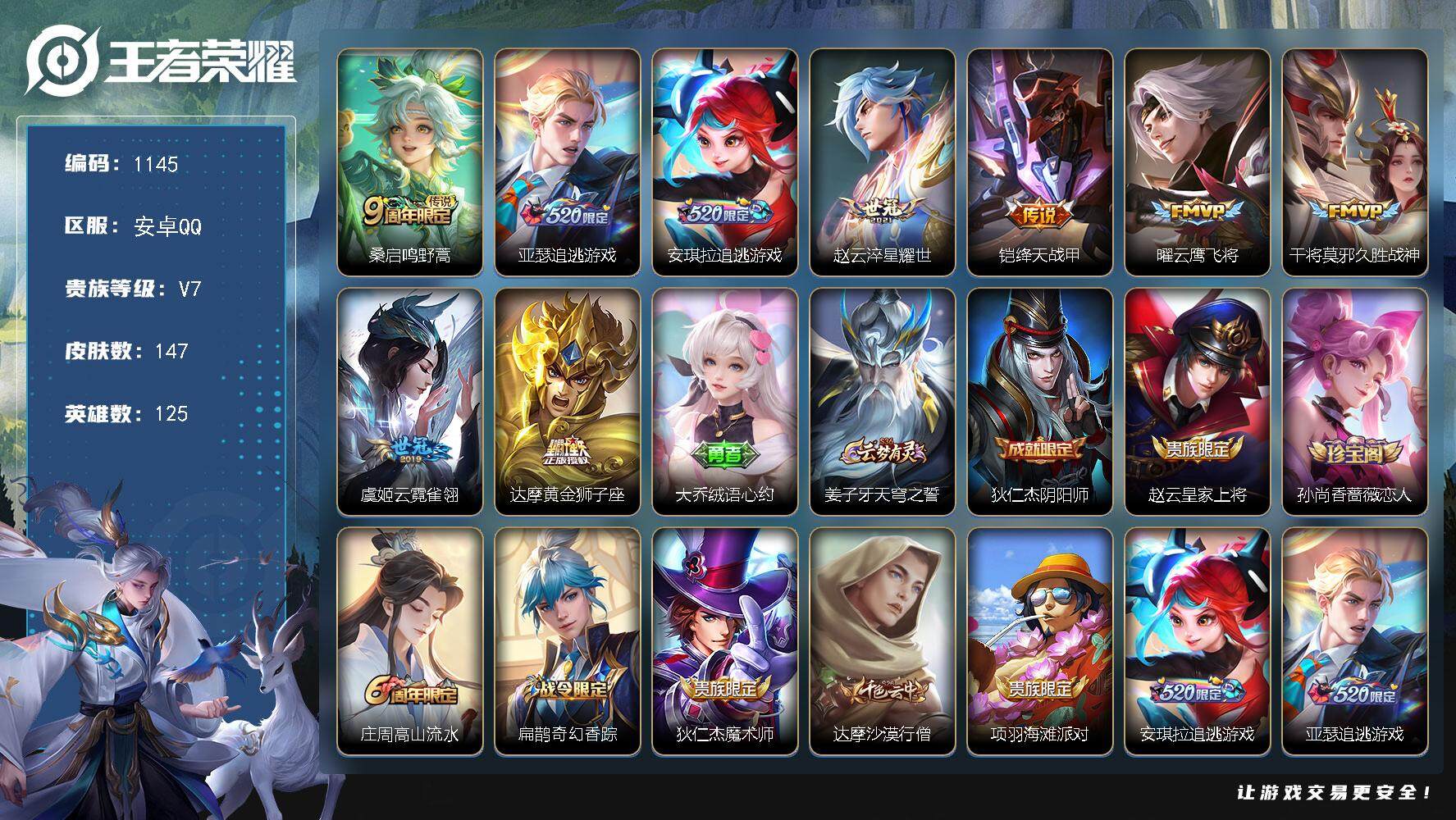 PX_2258918-【147皮9传说,云鹰飞将,黄金狮子座】安卓Q-V7-最强王者段位-125英雄-147皮肤-0典藏-0珍品无双-0无双-0珍品传说-9传说-32史诗 【传说皮肤】:桑启鸣野蒿,亚瑟追逃游戏,安琪拉追逃游戏,赵云淬星耀世,铠绛天战甲,曜云鹰飞将,干将莫邪久胜战神,虞姬云霓雀翎,达摩黄金狮子座 【限定皮肤】:大乔绒语心约,姜子牙天穹之誓,狄仁杰阴阳师,赵云皇家上将,孙尚香蔷薇恋人,庄周高山流水,扁鹊奇幻香踪,狄仁杰魔术师,达摩沙漠行僧,项羽海滩派对,安琪拉追逃游戏,亚瑟追逃游戏,刘备百相守梦,李元芳云中旅人,钟馗驱傩正仪,杨戬潮玩骑兵,蔡文姬繁星吟游,苏烈千军破阵,沈梦溪大漠名商,沈梦溪匿光破解者,裴擒虎擒涛扼浪,嫦娥暖冬兔眠,鲁班大师探海日志,桑启海盐诗旅,张良古海寻踪,鬼谷子天穹祈灯,沈梦溪龙舞盛年,鲁班七号蔬乡物语,李元芳蔬乡物语,刘邦剑破天穹,上官婉儿群星魔术团,程咬金群星魔术团,项羽苍威无极,周瑜熔金海岸 【赛季限定】:达摩沙漠行僧,张良古海寻踪,李元芳云中旅人,钟馗驱傩正仪,苏烈千军破阵,沈梦溪大漠名商,裴擒虎擒涛扼浪,鲁班大师探海日志,桑启海盐诗旅,鬼谷子天穹祈灯,刘邦剑破天穹,姜子牙天穹之誓 【战令限定】:扁鹊奇幻香踪,杨戬潮玩骑兵,嫦娥暖冬兔眠,鲁班七号蔬乡物语,李元芳蔬乡物语,项羽苍威无极 【史诗皮肤】:赵云皇家上将,赵云未来纪元,甄姬冰雪圆舞曲,狄仁杰魔术师,宫本武藏鬼剑武藏,孙尚香蔷薇恋人,孙尚香水果甜心,嬴政摇滚巨星,妲己魅力维加斯,妲己女仆咖啡,墨子金属风暴,刘禅绅士熊喵,李白千年之狐,诸葛亮黄金分割率,安琪拉心灵骇客,百里守约特工魅影,铠曙光守护者,李元芳逐浪之夏,程咬金功夫厨神,狄仁杰鹰眼统帅,蔡文姬繁星吟游,橘右京修罗,庄周高山流水,镜玫瑰异探,扁鹊奇幻香踪,刘备百相守梦,沈梦溪匿光破解者,鲁班七号蔬乡物语,上官婉儿群星魔术团,狂铁龙之律动,女娲万灵启世,少司缘巫礼祀神 【其他皮肤】:项羽海滩派对,韩信教廷特使,赵云白执事,赵云忍炎影,芈月红桃皇后,白起白色死神,扁鹊化身博士,安琪拉玩偶对对碰,孙膑天使之翼,姜子牙时尚教父,妲己少女阿狸,典韦黄金武士,亚瑟死亡骑士,花木兰兔女郎,张飞五福同心,甄姬花好人间,刘备万事如意,宫本武藏万象初新,后羿阿尔法小队,狄仁杰阴阳师,关羽龙腾万里,钟无艳海滩丽影,孙尚香沉稳之力,诸葛亮掌控之力,苏烈坚韧之力,小乔丁香结,沈梦溪鲨炮海盗猫,哪吒次元突破,盾山圆桌骑士,狂铁特工战影,刘禅秘密基地,露娜瓷语鉴心,钟馗驱傩正仪,鲁班大师乓乓大师,苏烈千军破阵,达摩沙漠行僧,刘禅唤灵魔甲,沈梦溪大漠名商,蒙犽胡桃狂想曲,李元芳云中旅人,刘备潮玩造梦师,桑启海盐诗旅,嫦娥暖冬兔眠,猪八戒潮玩探月行,裴擒虎擒涛扼浪,杨戬潮玩骑兵,太乙真人劲辣红锅,莱西奥西部游侠,鲁班大师探海日志,姬小满零食大作战,李元芳妄想特派,张良古海寻踪,钟无艳聚星闪耀,海月王牌新星,后羿完美运算,鬼谷子天穹祈灯,沈梦溪龙舞盛年,钟无艳春野之旅,李元芳蔬乡物语,扁鹊无尽旅途,刘邦剑破天穹,程咬金群星魔术团,项羽苍威无极,姜子牙天穹之誓,周瑜熔金海岸,大乔绒语心约,东皇太一噬灭天穹,太乙真人谧流熔炉,明世隐景韶洛都,戈娅玫蓝誓约,刘备浪漫序章,钟馗虚灵犬护,苏烈春野闲踪,亚瑟荣光之誓,艾琳鹤鸣心笺,高渐离金属狂潮,王昭君精灵公主,张良一千零一夜,小乔万圣前夜,孙悟空西部大镖客,刘禅英喵野望,兰陵王隐刃,李白范海辛,李元芳特种部队,夏侯惇战争骑士,杨戬埃及法老,哪吒三太子,铠龙域领主,百里守约绝影神枪,明世隐占星师,公孙离花间舞,杨玉环霓裳曲,弈星踏雪寻梅,米莱狄精准探案法,孙策海之征途,司马懿魇语军师,沈梦溪棒球奇才,李信灼热之刃,嫦娥露花倒影,盘古创世神祝,瑶森,曜归虚梦演,镜冰刃幻境,蒙恬秩序猎龙将,澜孤猎,云缨赤焰之缨 【内测皮肤】:孙尚香蔷薇恋人,狂铁特工战影 【营地ID】:1703404611
